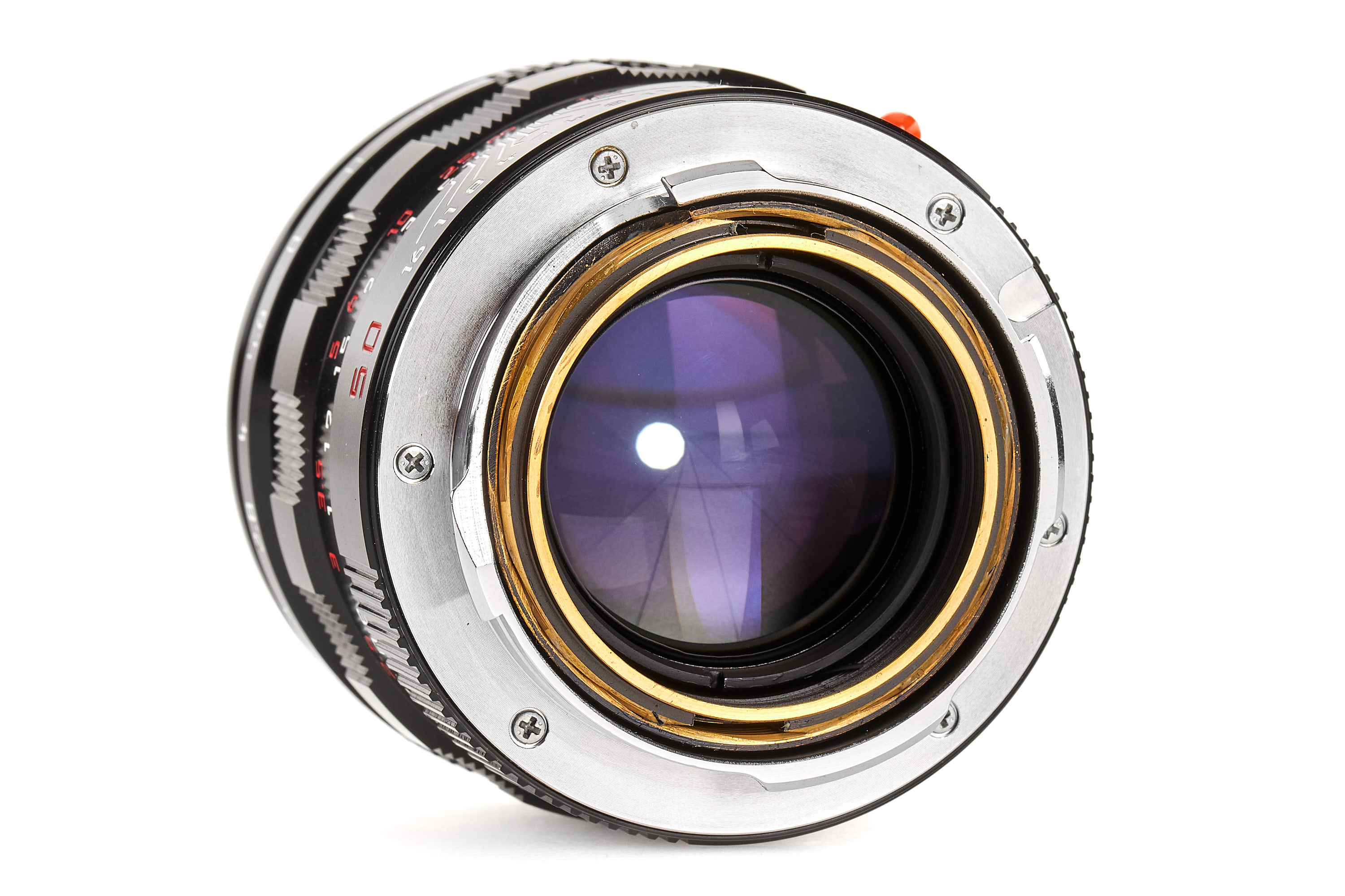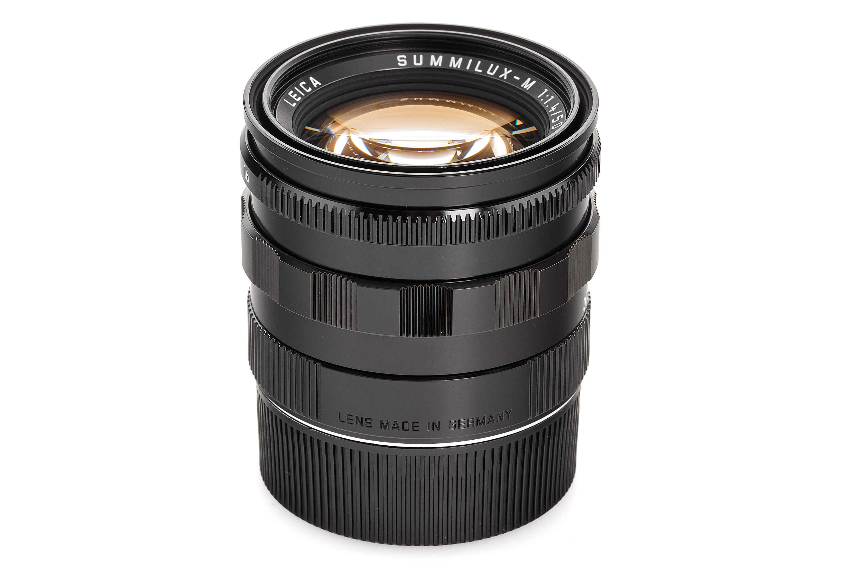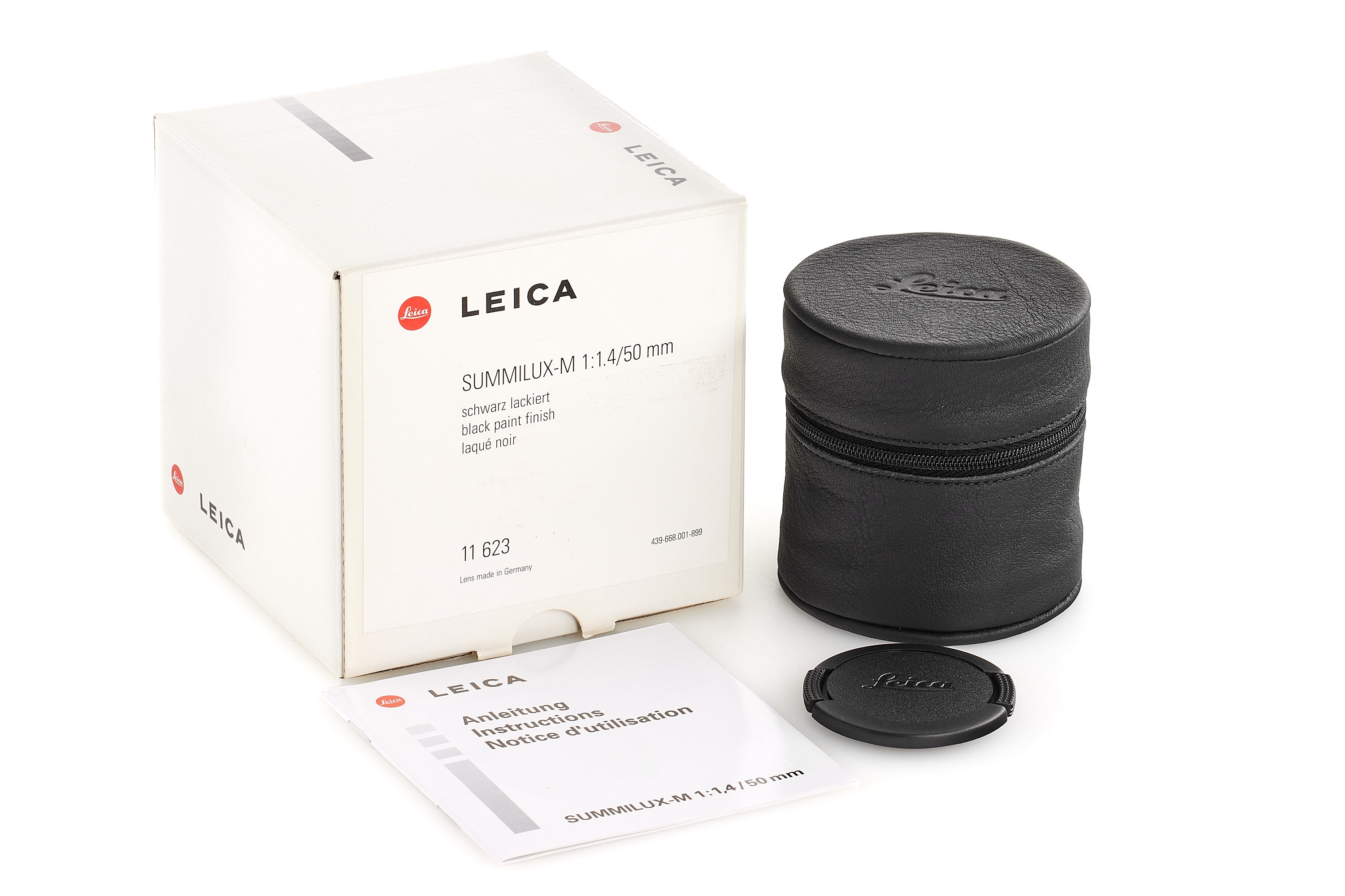 Sought-after black paint Summilux in mint, unused condition, optics only showing a light haze, with caps, papers and matching maker's box.