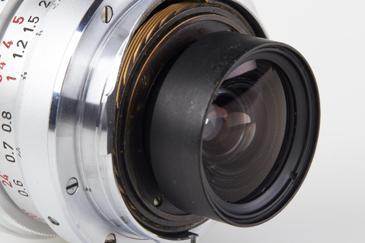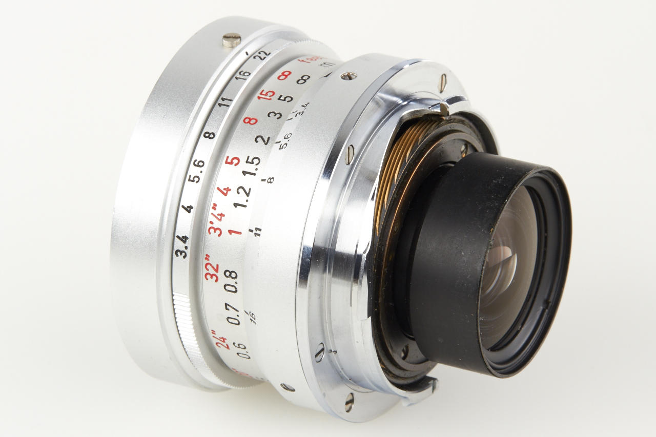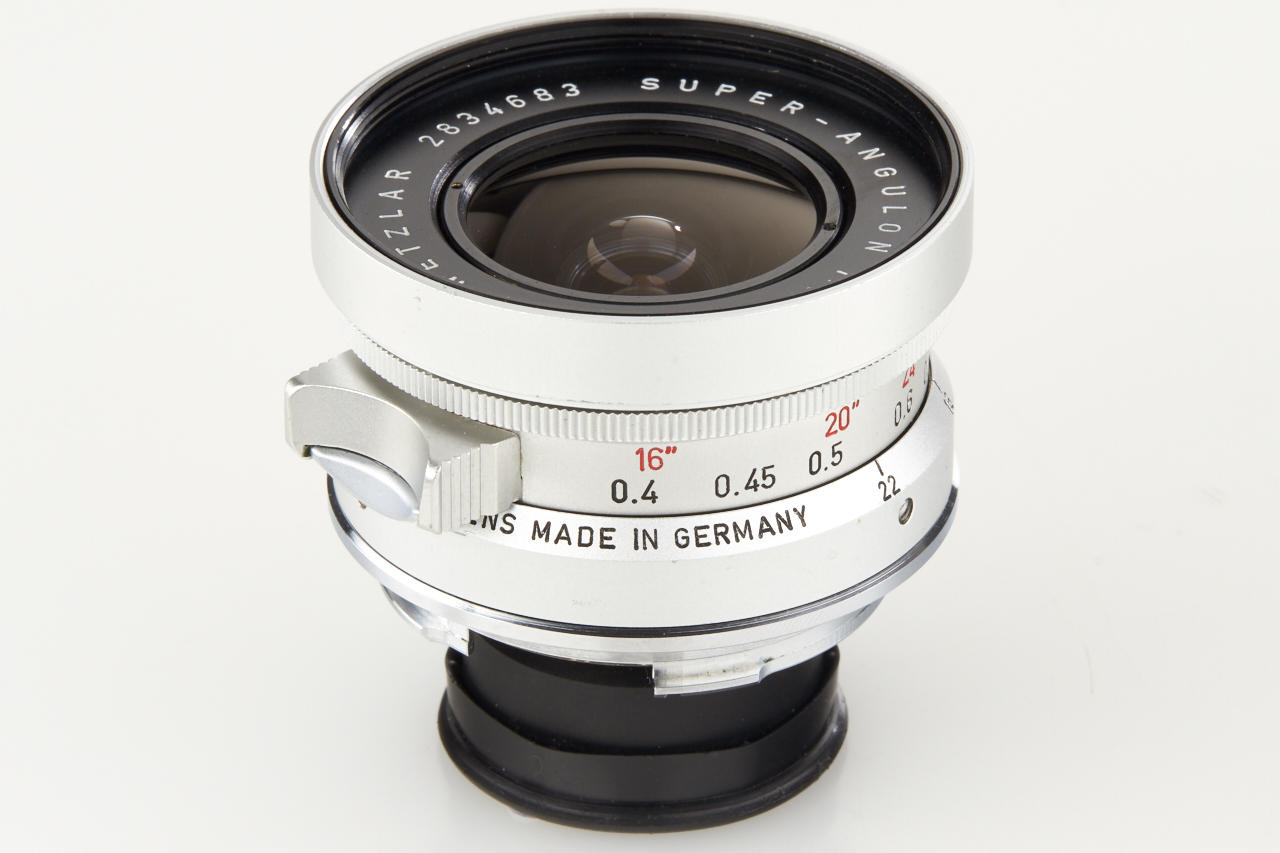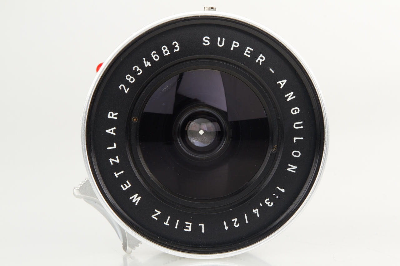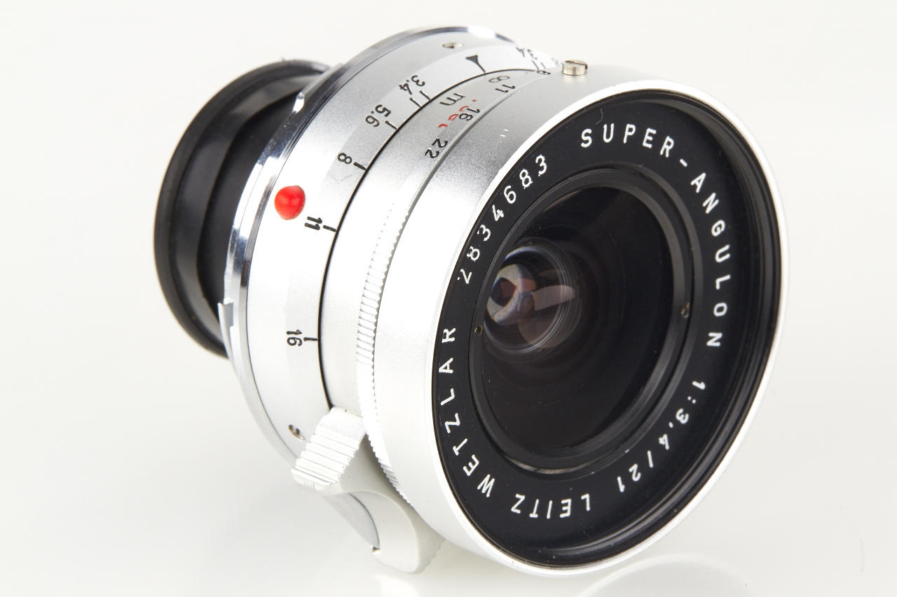 prototype lens with different engraving style on front ring, from 1958 onwards Schneider-Kreuznach produced the 21mm Super-Angulon for Leitz. The successor of the f4 lens was the eight-element f3.4 lens, which was produced in chrome and black finish in bayonet-mount. At the 1980 Photokina Leitz introduced its own 21mm lens, the Elmarit f2.8. The offered lens is a prototype or sample by Schneider differing from the serial production models, with Schneider rear cap, hood and in near mint condition