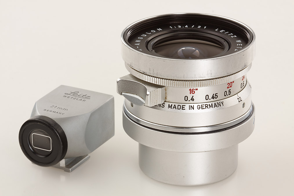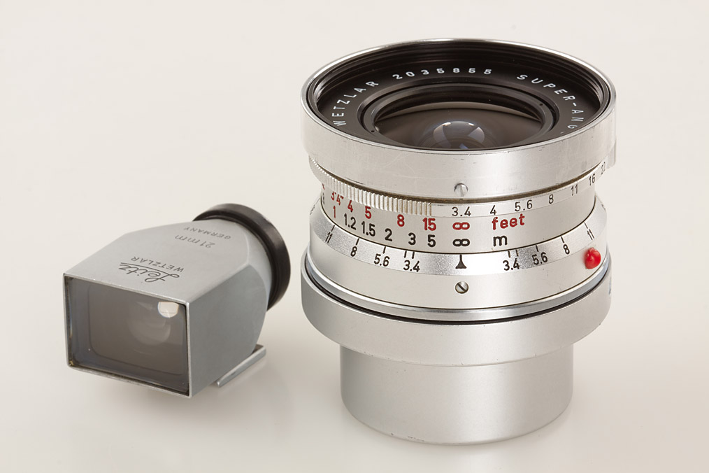 in very fine condition, rear cap, 12501M hood and filter, chrome SBKOO 21mm BL finder, in original maker's box