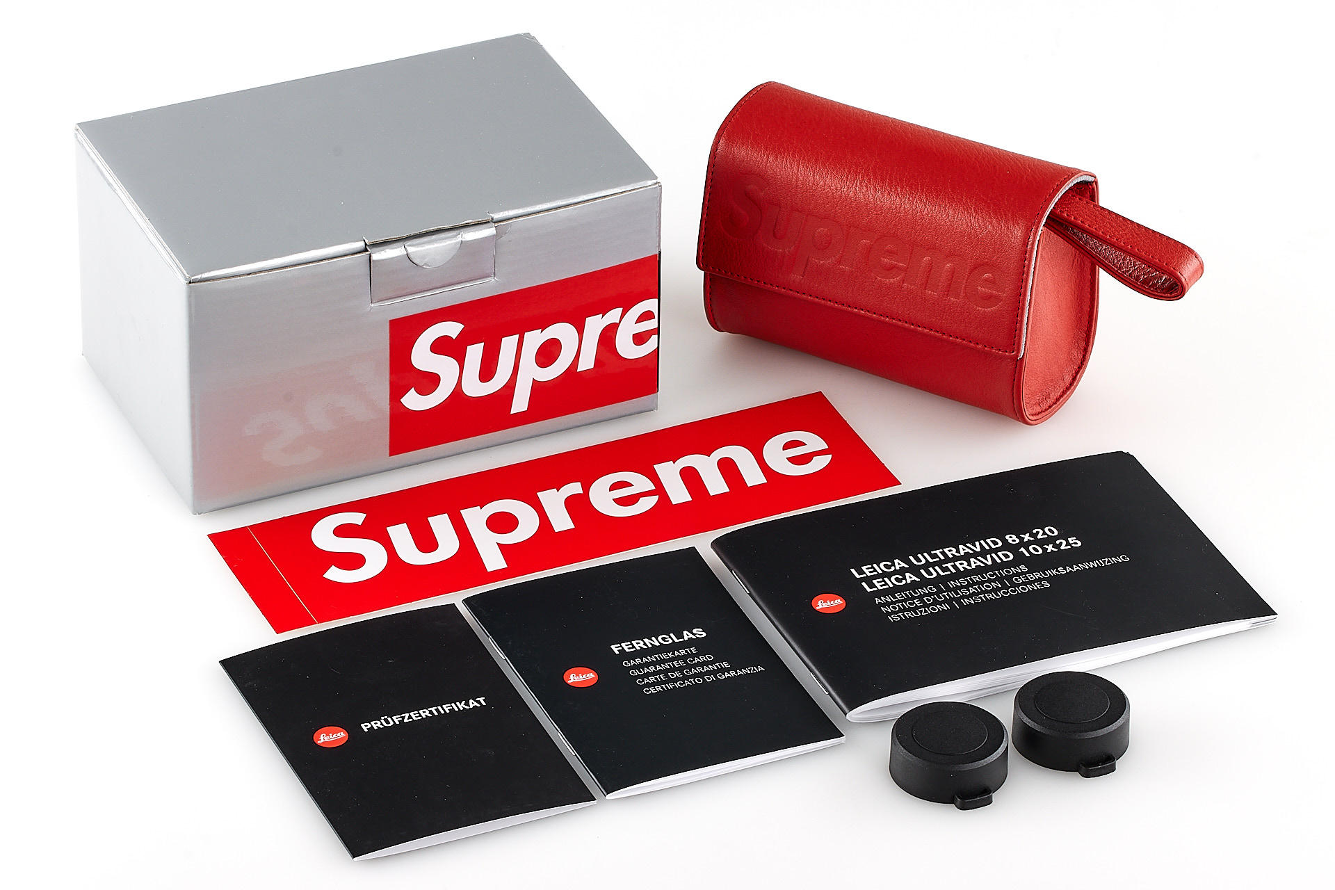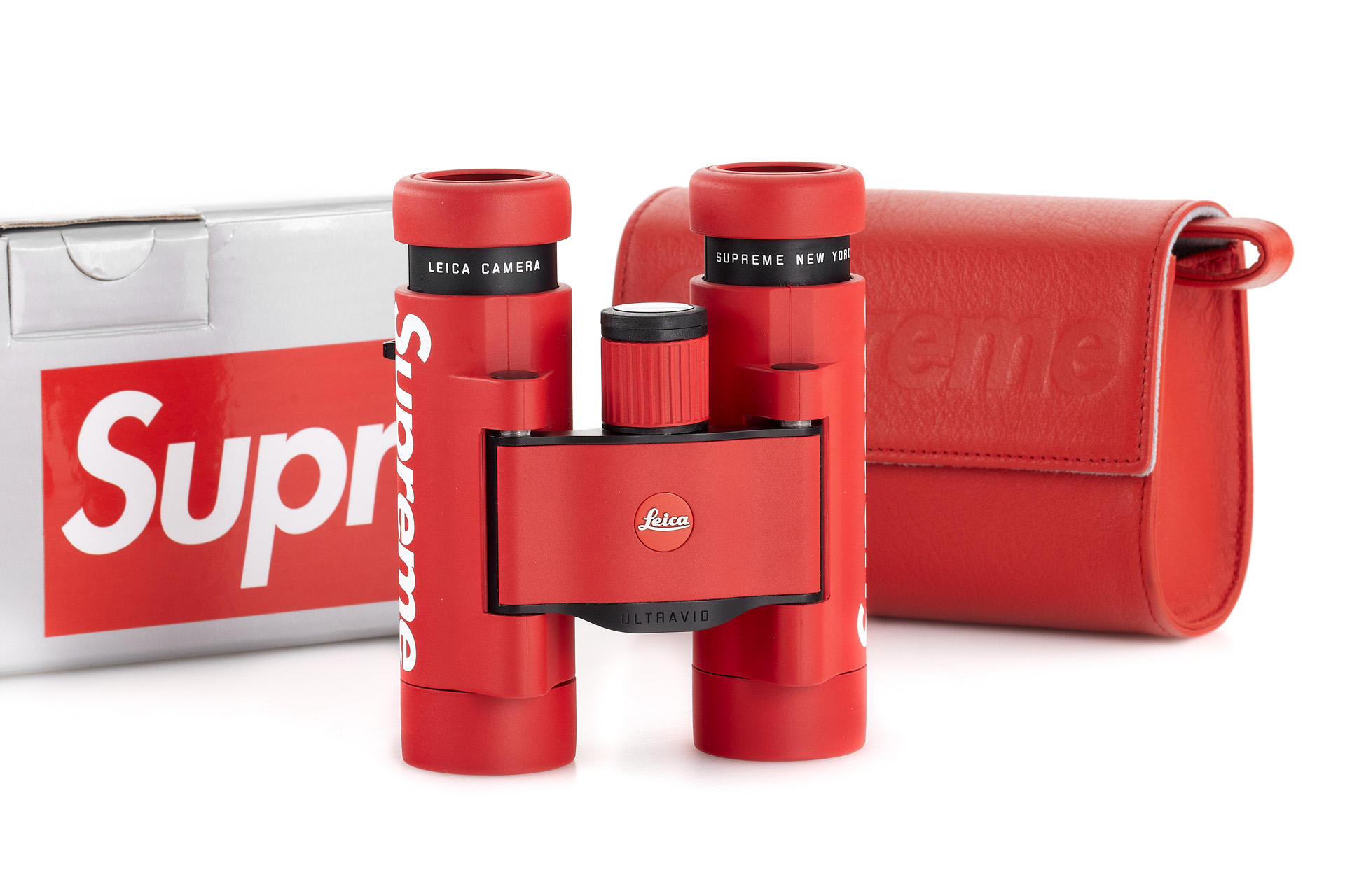 For its fall 2020 collection, the US brand Supreme® presented for the first time a Leica Camera product in the typical design of the New York brand: the Leica Ultravid 8x20 binoculars. The offered example is in new condition, complete with a special case, strap, sticker and maker's box
