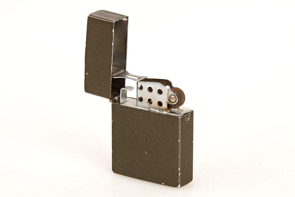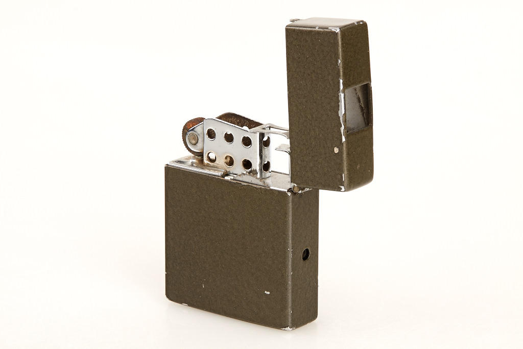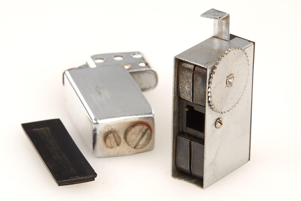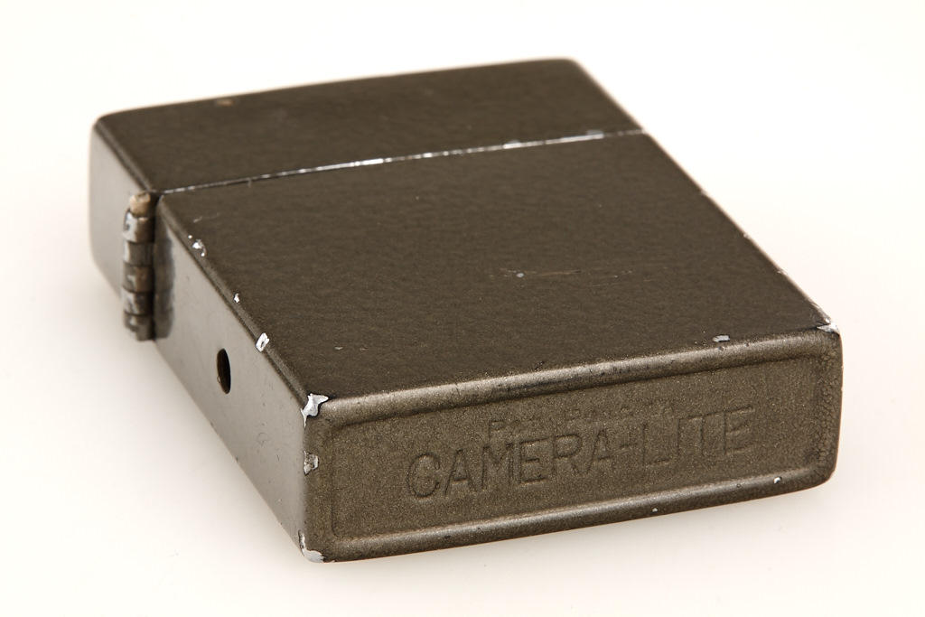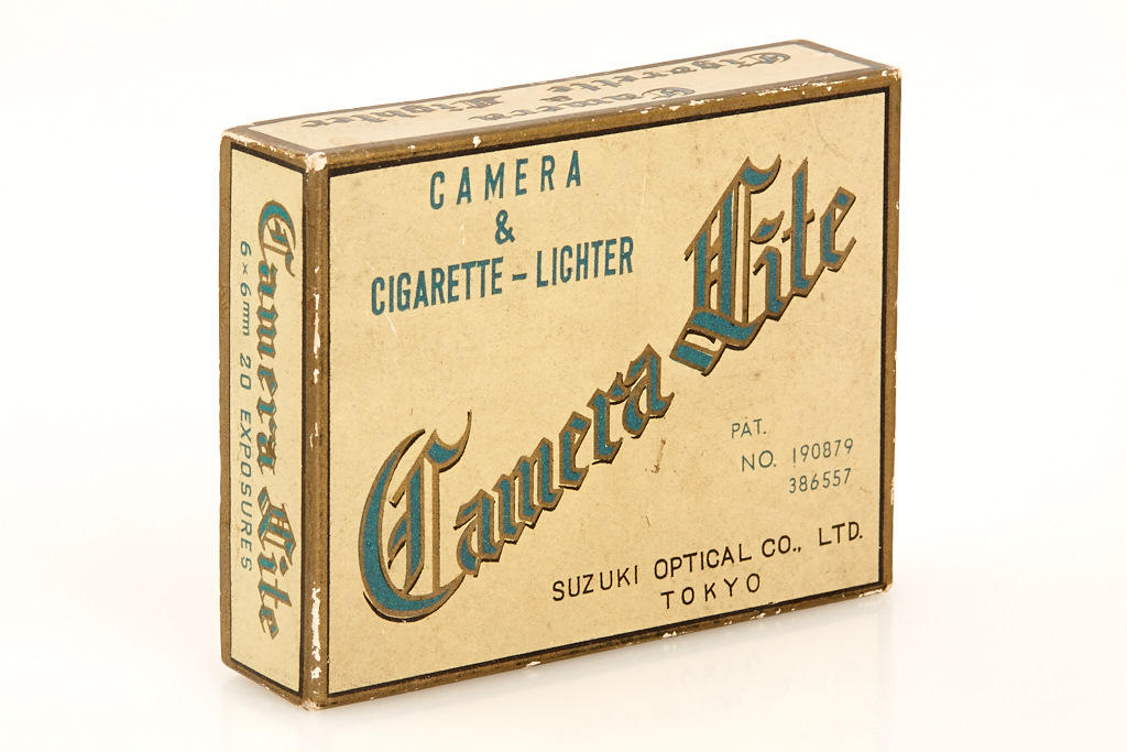 very rare first version in grey finish for 6x6mm exposures on 8mm perforated film, simple fixed focus lens in a single speed shutter with combined fluid lighter, in maker's printed cardboard box marked 'GREY' on bottom