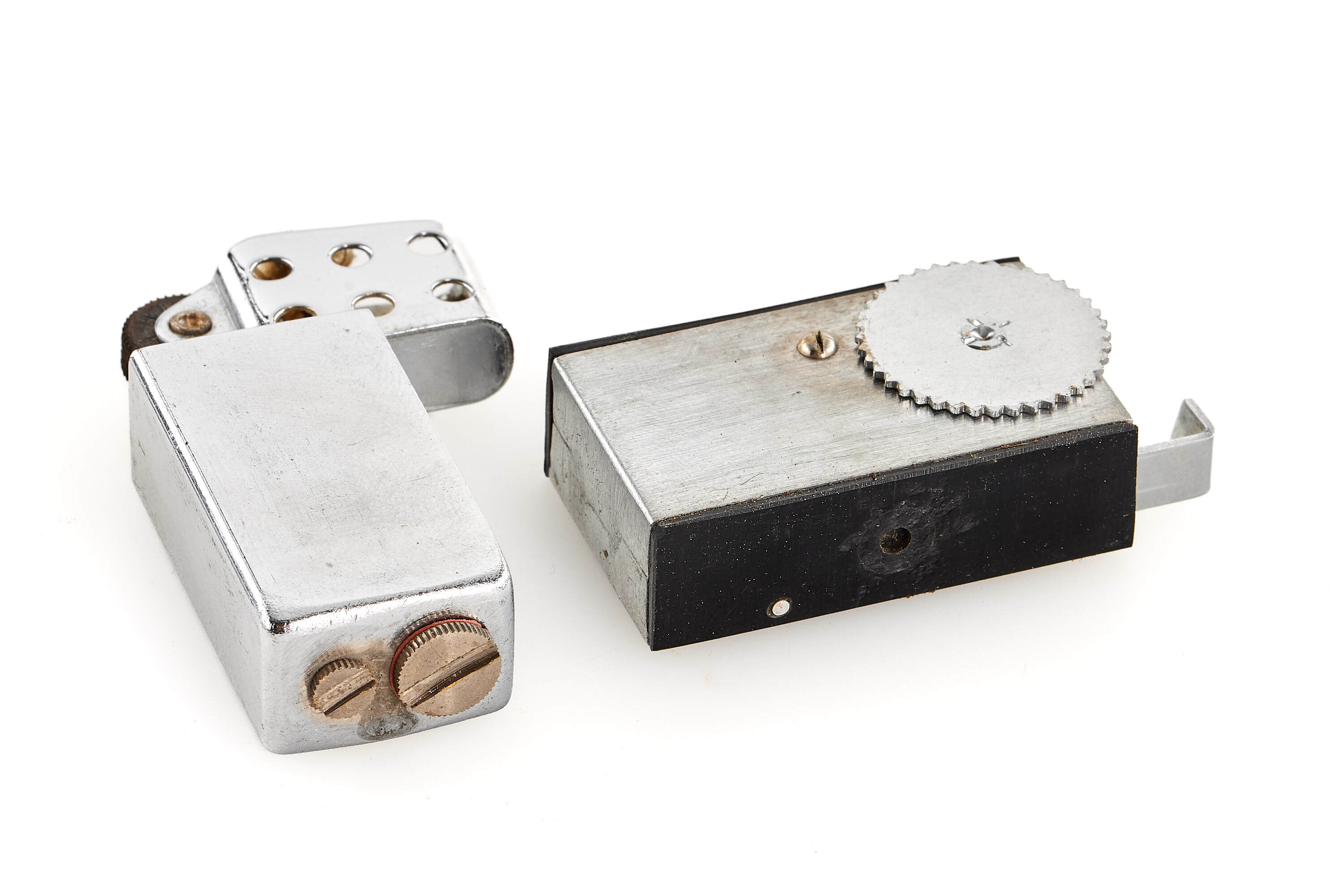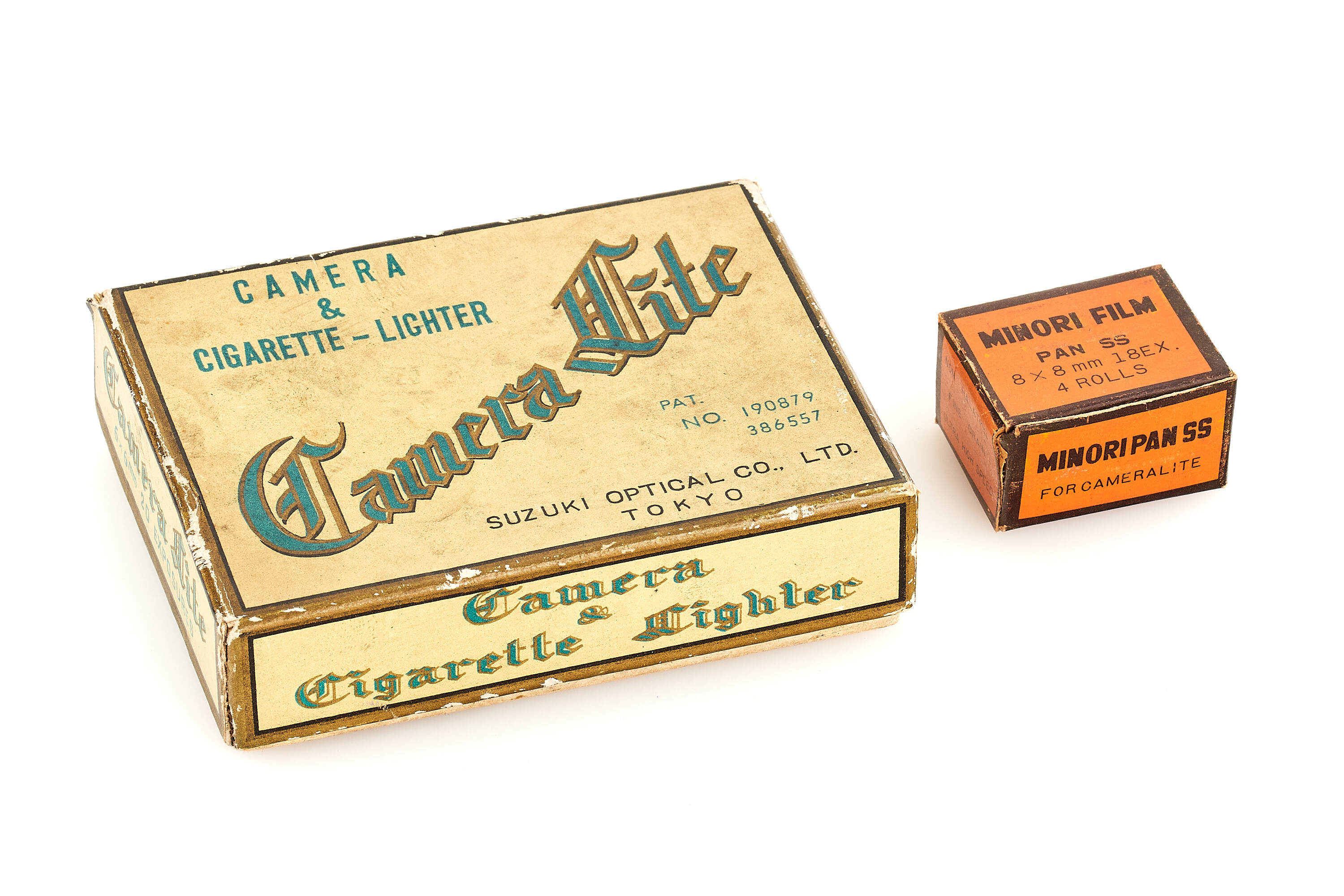 Rare Japanese lighter camera similar to the Echo 8, first version with single speed shutter, in mint condition, together with original maker's box and 4x unexposed 8x8 roll films (in maker's box).