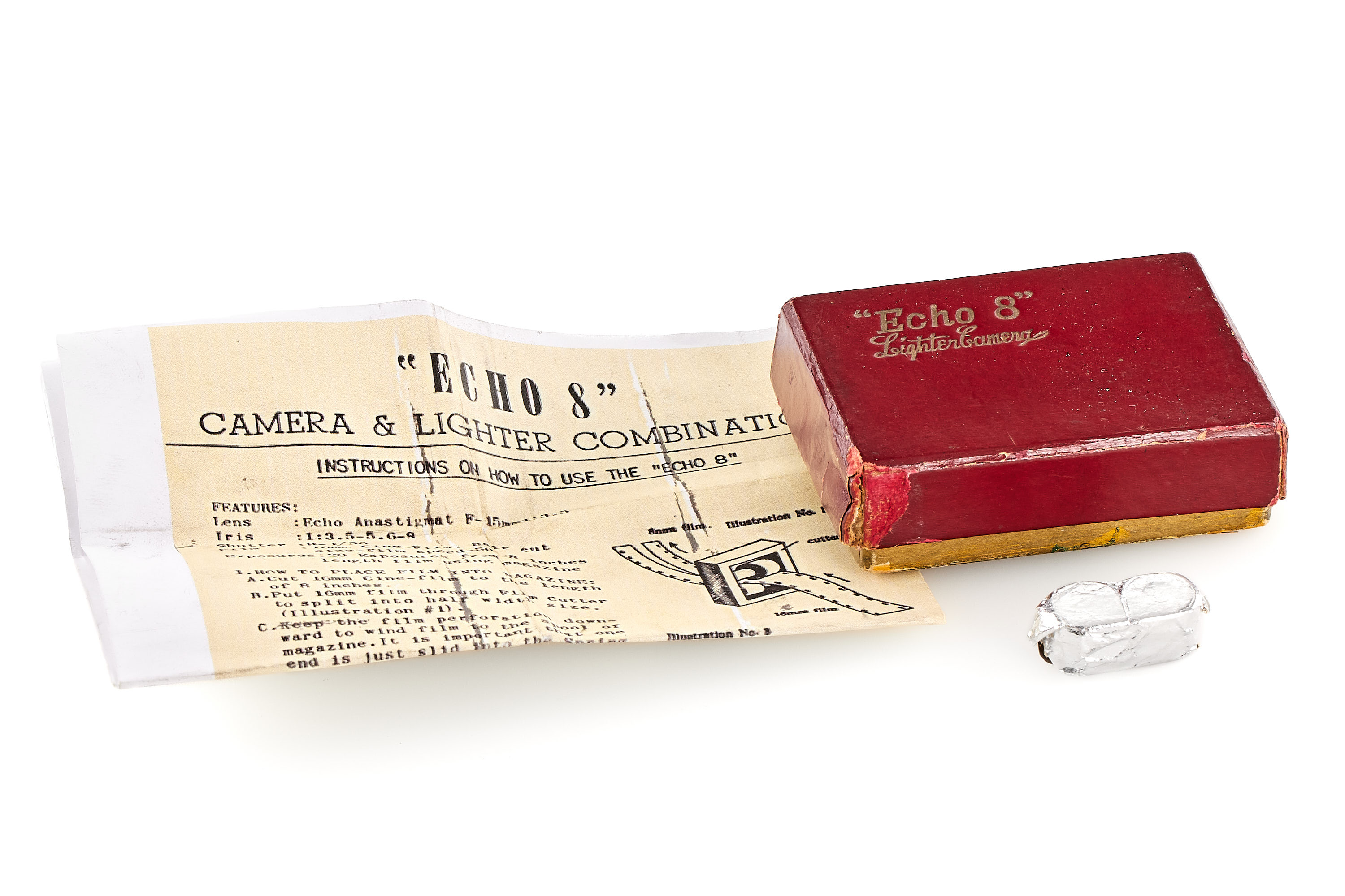 Rare Japanese lighter camera similar to the Echo 8, improved version with angle finder and I/B speed switch, Echor 3.5/15mm lens, in mint condition and working order, with spools and an additional sealed film pack, copy of instructions and Echo 8 red maker's box.
