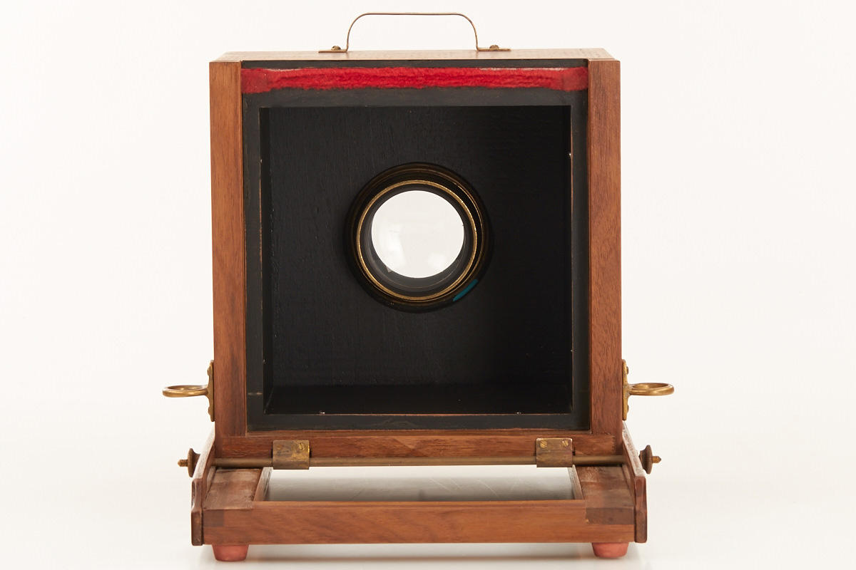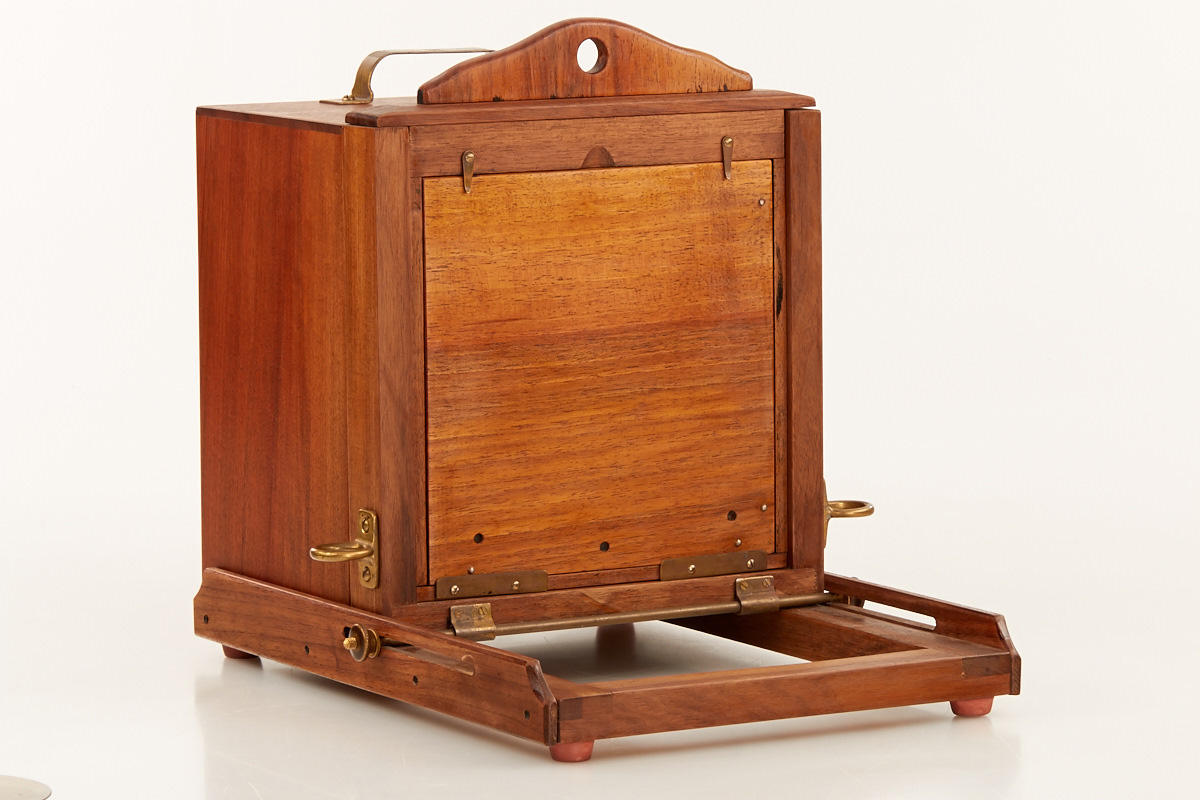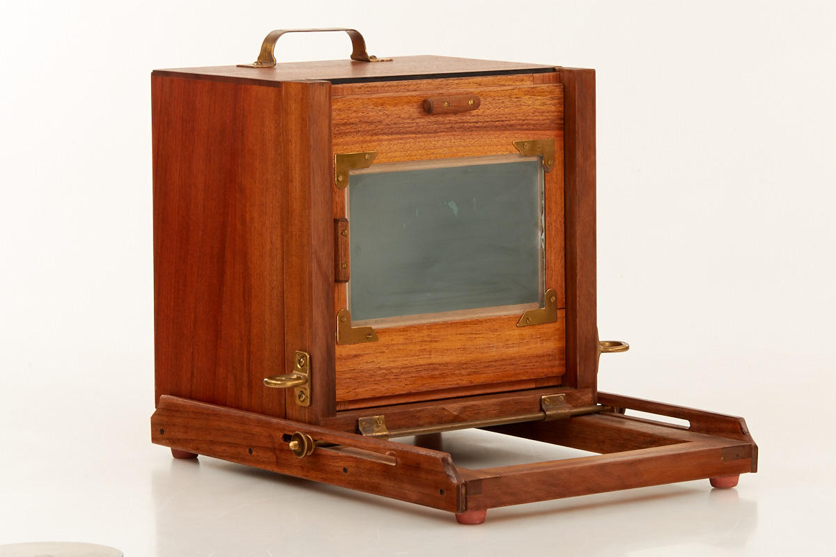 very well made modern wooden German wet plate camera for square 16.3x16.3cm plates, in near mint condition with vintage E.Francais Paris brass lens no.4748 (c.1870) with radial focusing, approx. 24cm focal length, with one film holder, original shutter cap and 5 matching water house stops