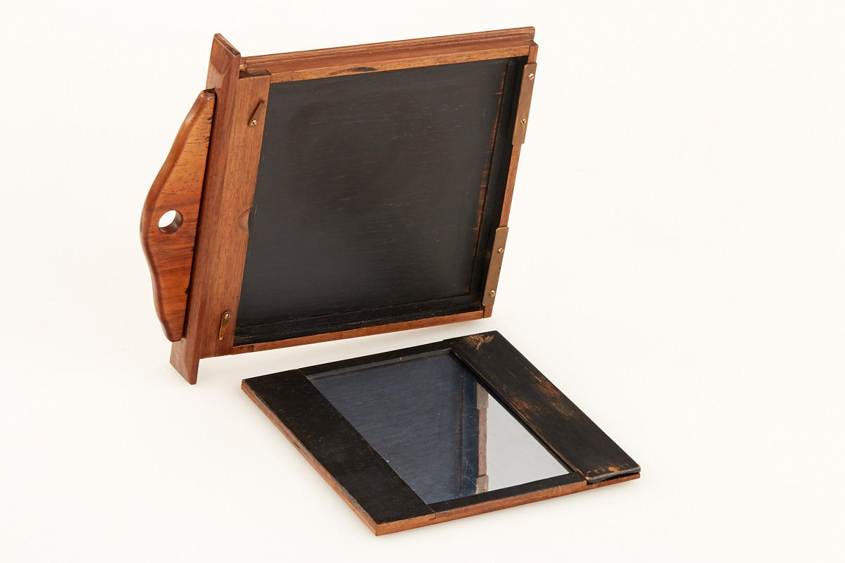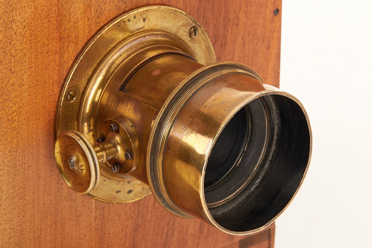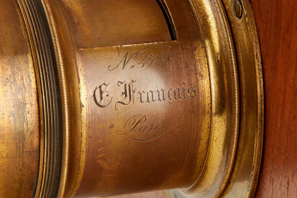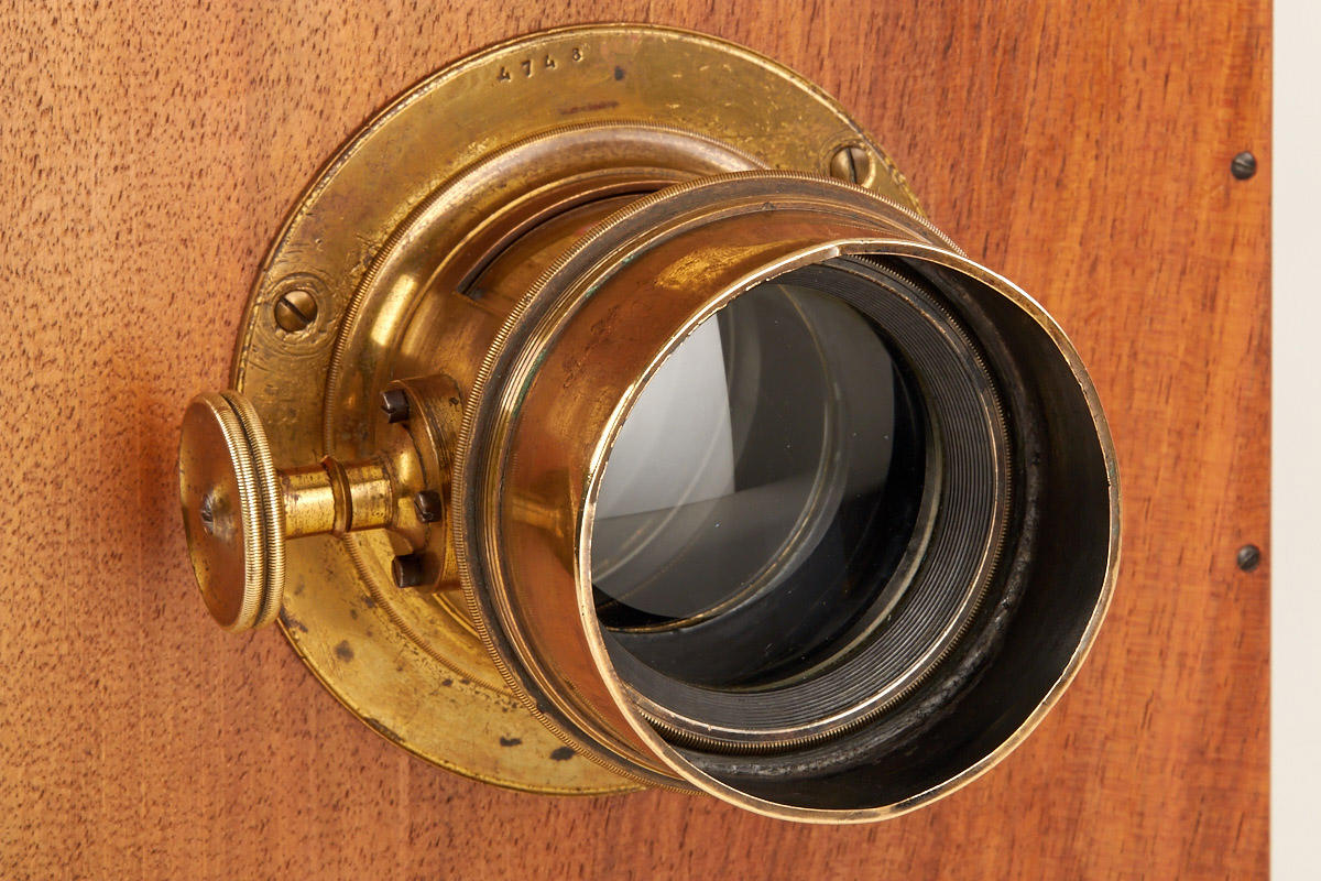 very well made modern wooden German wet plate camera for square 16.3x16.3cm plates, in near mint condition with vintage E.Francais Paris brass lens no.4748 (c.1870) with radial focusing, approx. 24cm focal length, with one film holder, original shutter cap and 5 matching water house stops