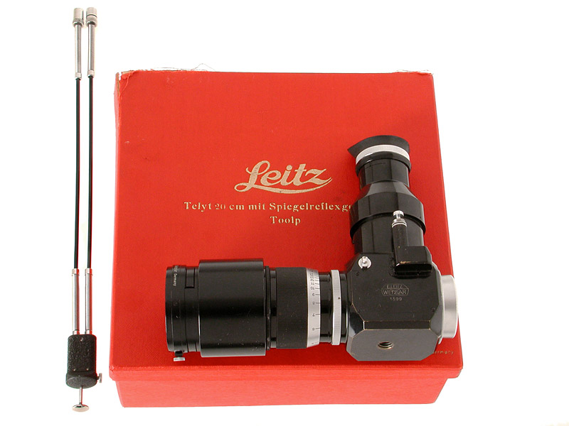 Early Telyt 20cm with mirror reflex housing, hood, double cable release in scarce red maker's box printed Telyt 20cm mit Spiegelreflexgehäuse Toolp