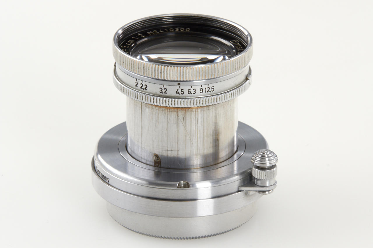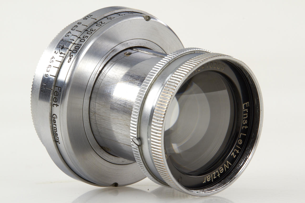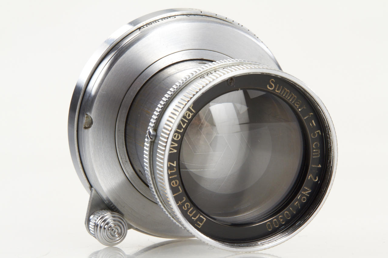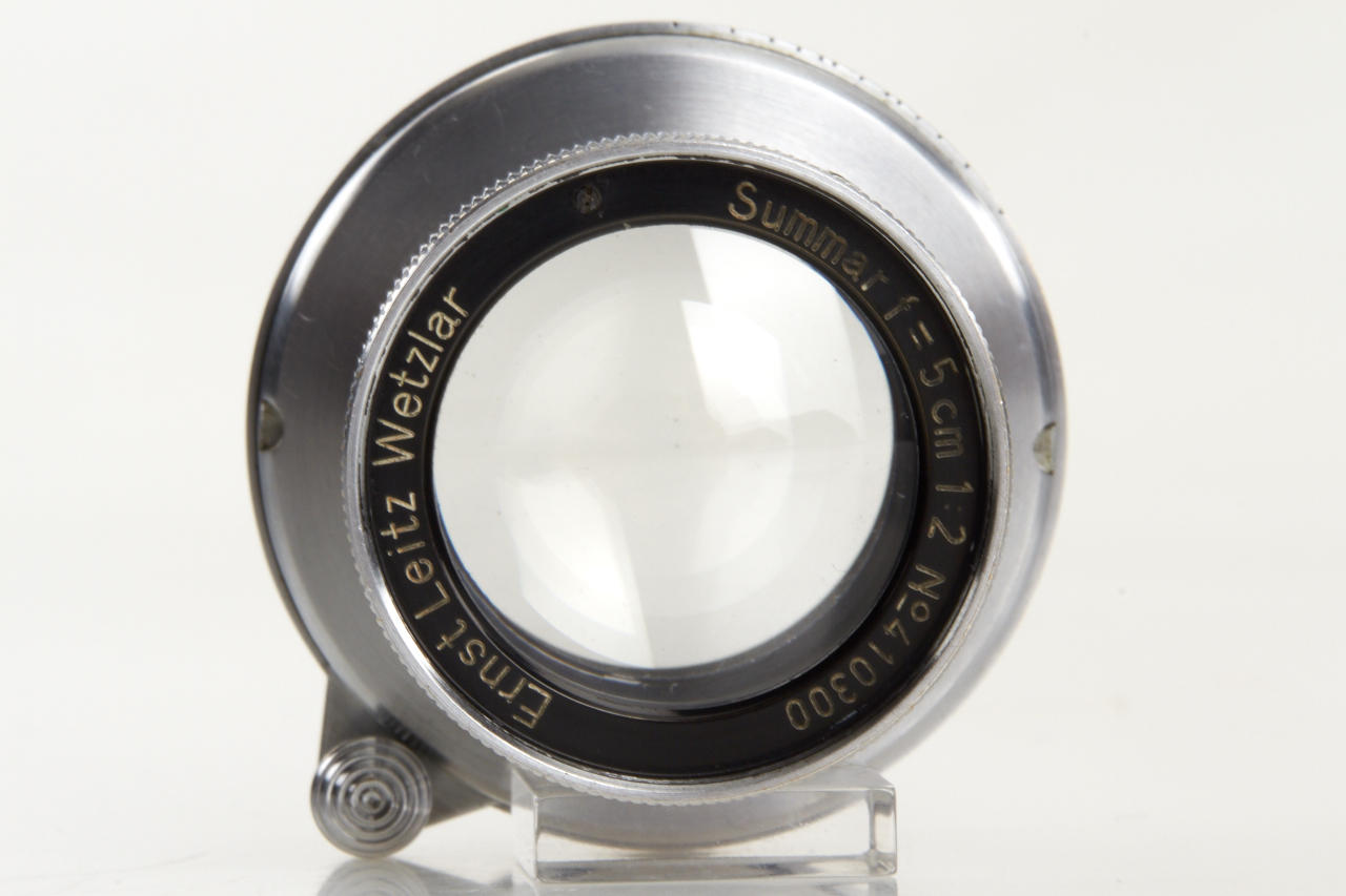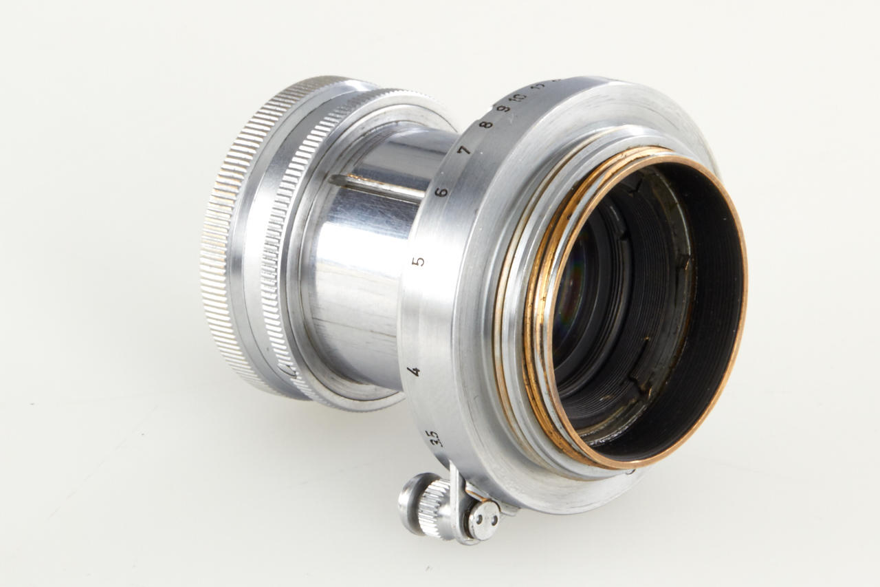 special Summar lens (Leitz product number 42214) designed for tropical conditions, very rare variant of the regular Summar (product number 42134) with an extra element at the front of the lens (optical formula B246a), which makes it a seven element construction, Leitz factory records indicate 'TROPEN' for these very few lenses, which are to be found among the late Summar lenses shortly before the introduction of the Summitar, the only difference visible from the outside is the groove along the collapsing barrel - same as in the Summitars, the offered lens is one of very few known to exist, see the James L. Lager article in Vidom no.85