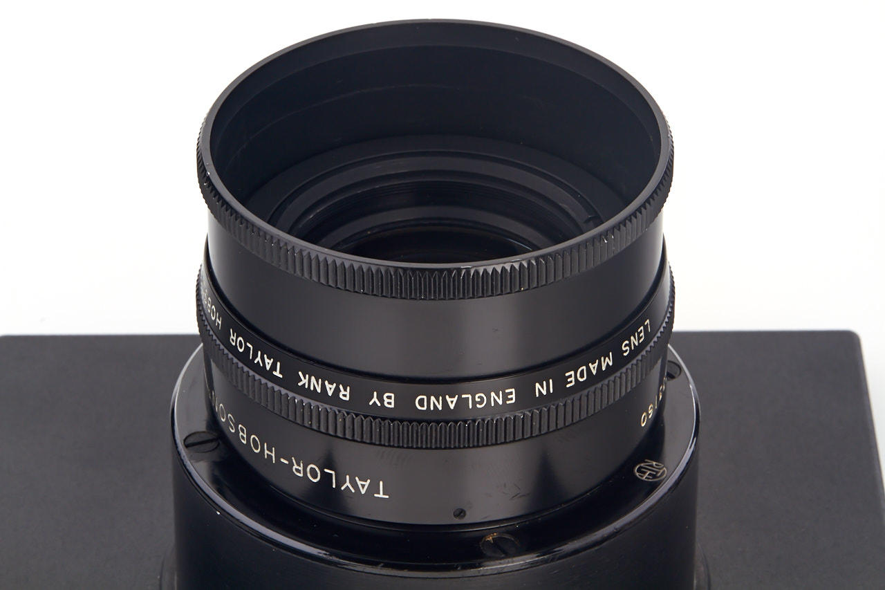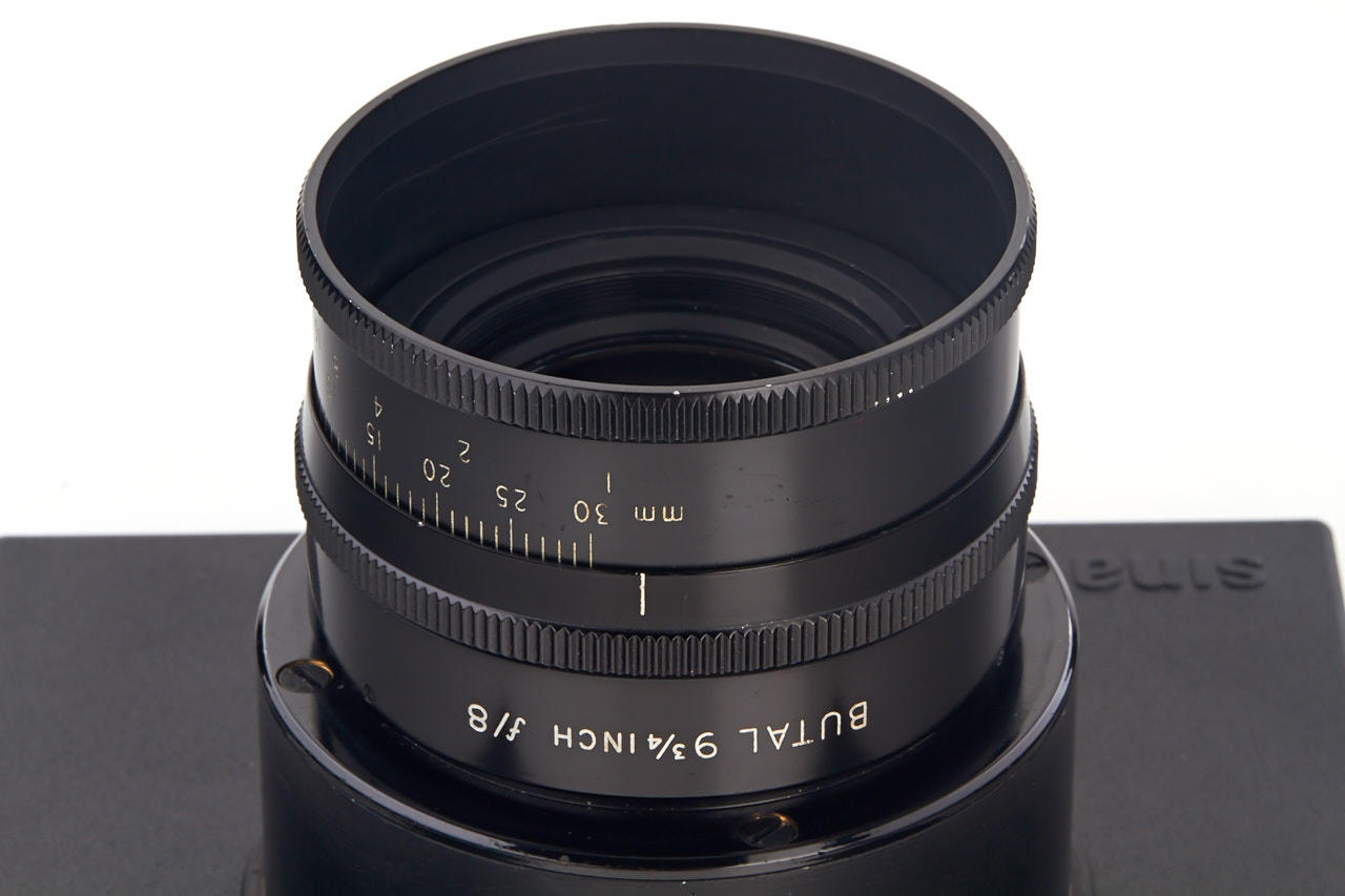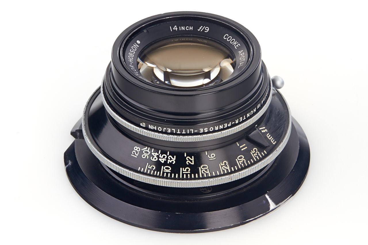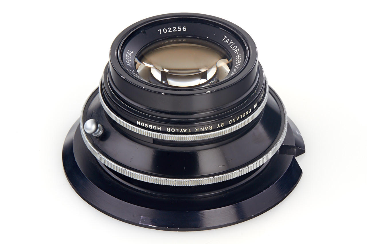 two Taylor & Hobson lenses: Cooke Apotal 9/14" no.702256 (clean, with front cap and mounting ring) and Butal 8/9 3/4" no.733160 (slight coating blemishes inside, on Sinar lens board, with front cap), both lenses engraved with f-stop scale and mm scale, both in excellent cosmetic condition