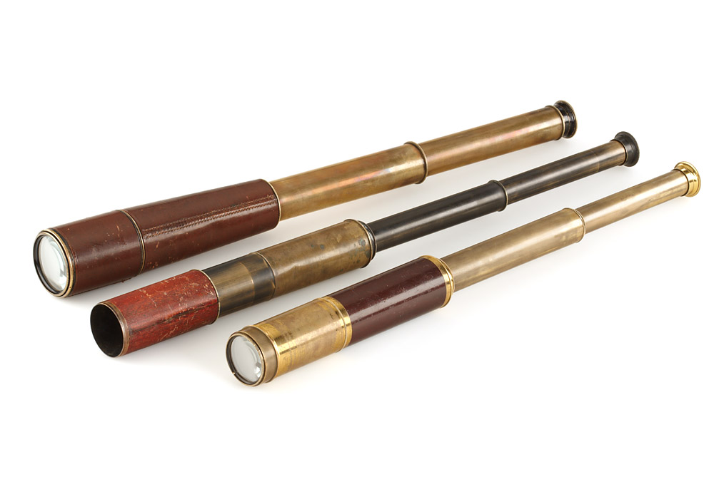 3 brass telescopes: (1) unbranded telescope by Ch.Chevallier, total length if pulled out 75cm, collapsed length 25cm, partly with mahogany wood covering, including a separated lens (Achromat, c.1820) with hand written notes by the previous owner, cap, (2) unbranded, total length pulled out 74cm, collapsed length 25cm, partly with wood covering, protection cap, (3) 'Signalling' Dollond London telescope no.12129, total length pulled out 78.5cm, collapsed length 26cm, with leather covering (3)