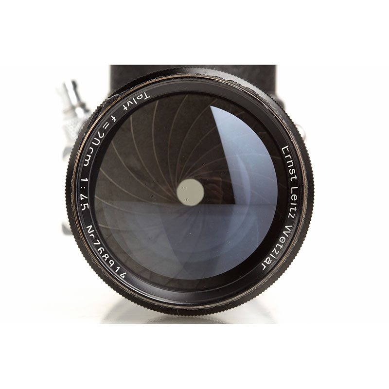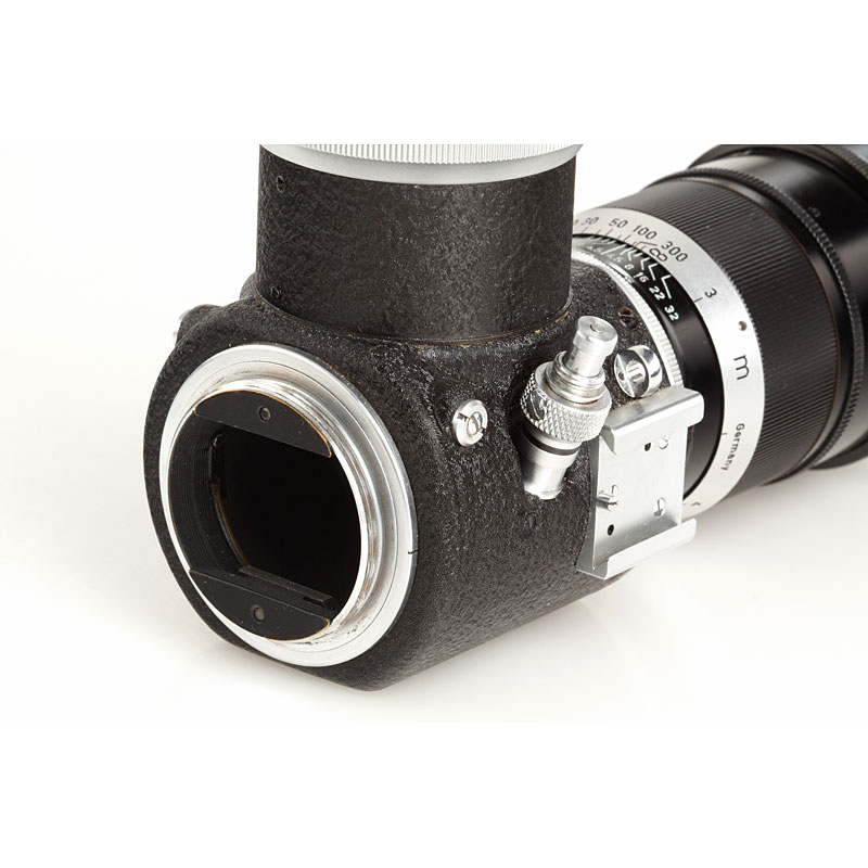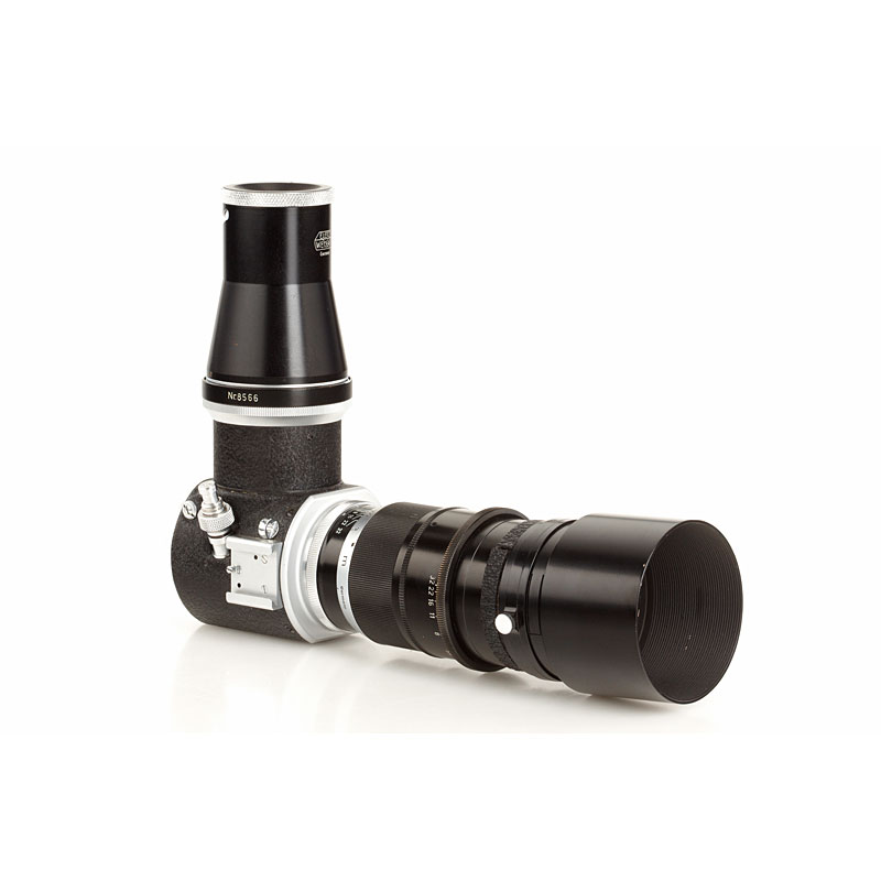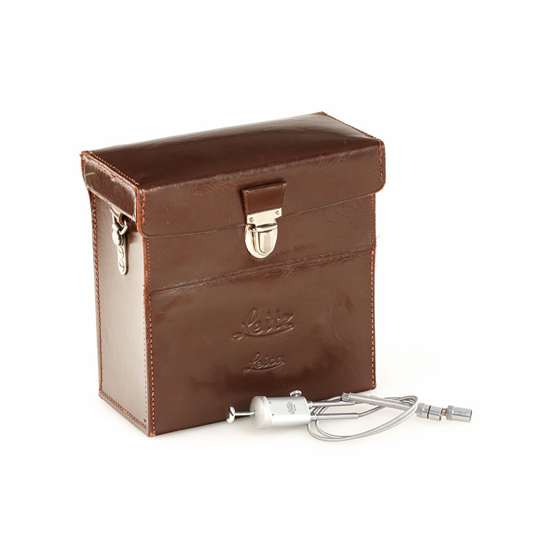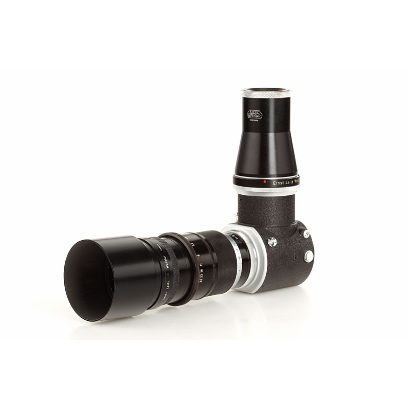 fine Telyt (clean lenses) with hood (cap), clean Visoflex I no.8566 (caps), double-cable release, all in fitted Leitz outfit case - included are two original invoices (1952) from 'CONRAD BARNACK Spezialhaus für Kleinbildphotographie'