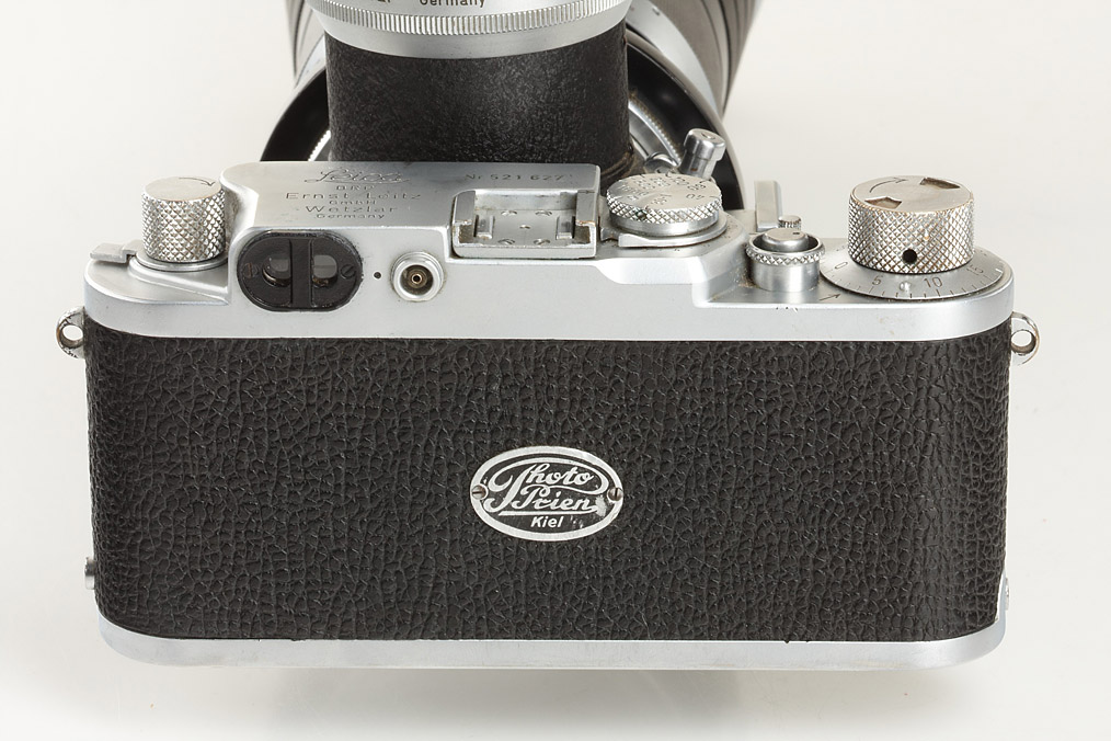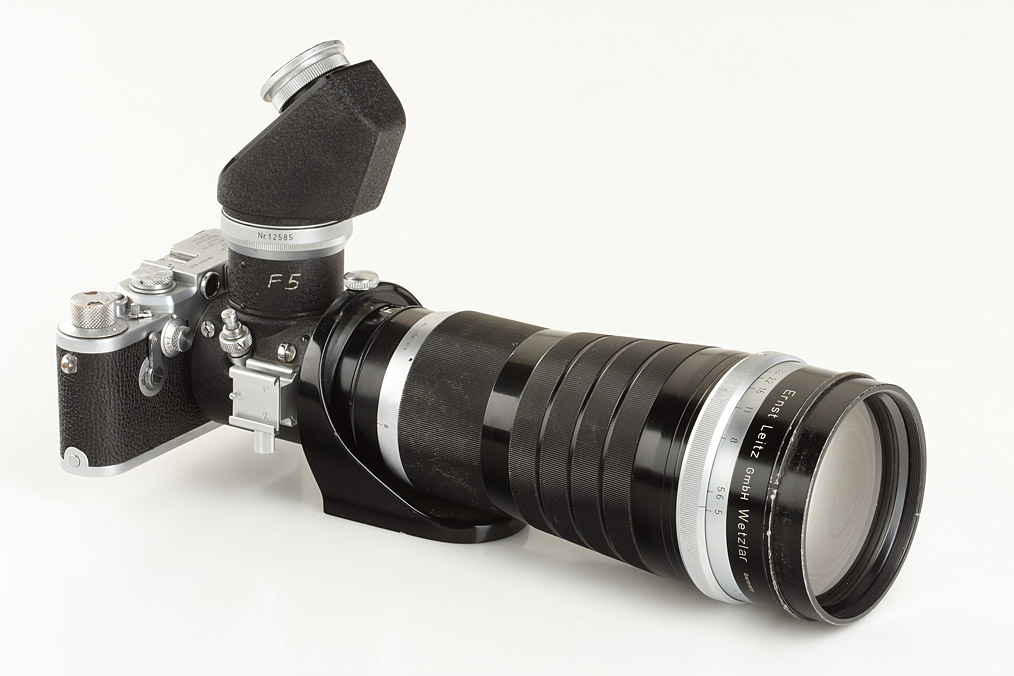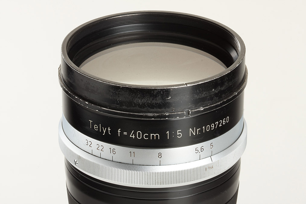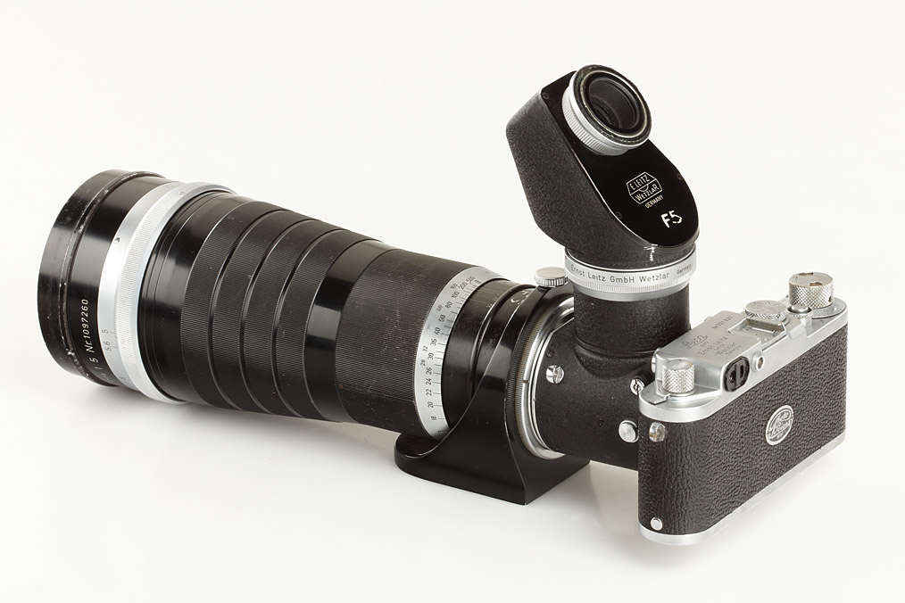 late first type Telyt 40cm with detachable hood, both caps (clean optics), Visoflex I with prism finder, double cable-release, Leica IIIf black dial body no.521627 (needs service), 3x Telyt filters in red maker's boxes, 40cm SQTOO finder - all in matching outfit case