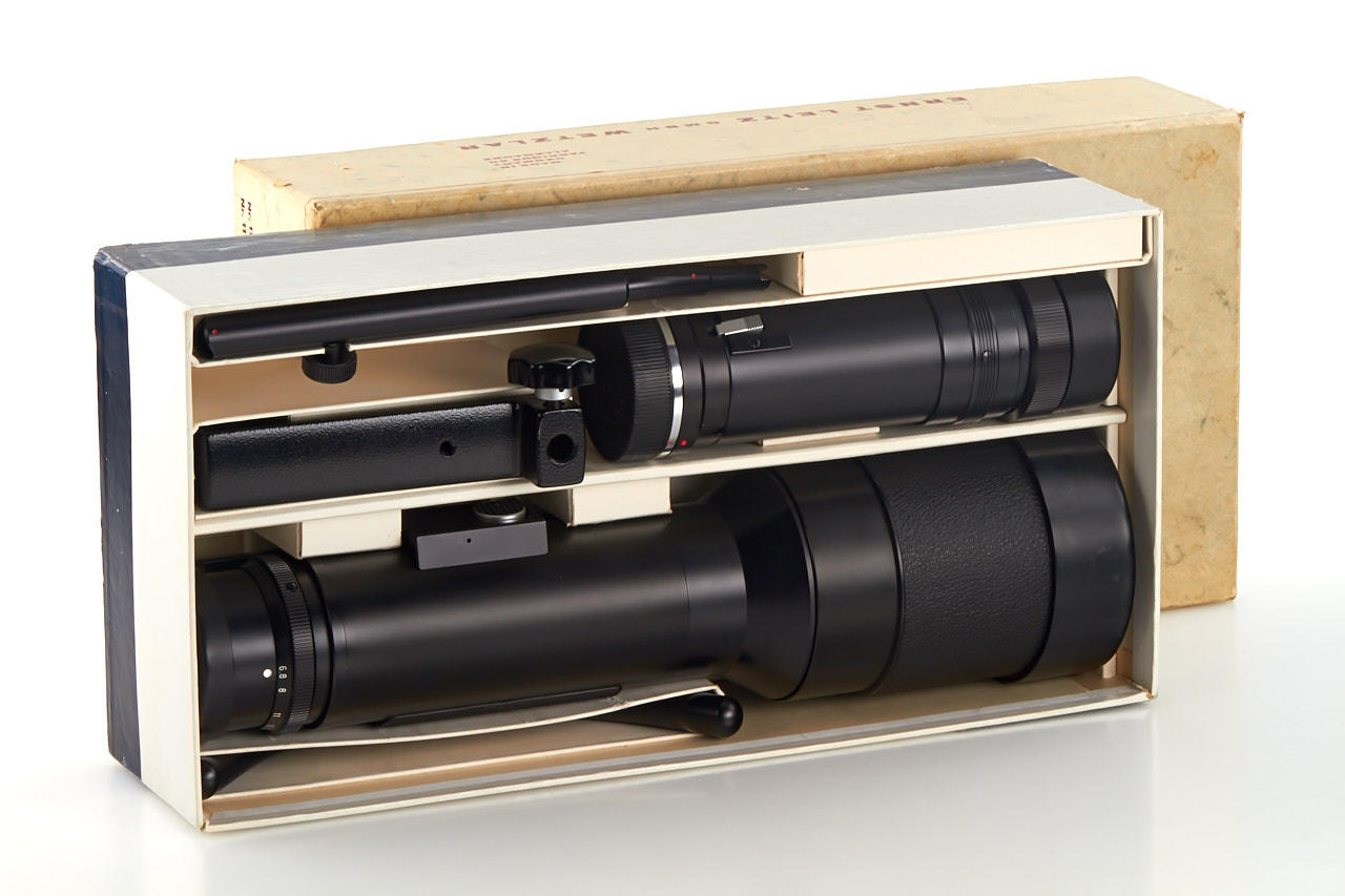for Leica R, in near mint condition with clean optics, complete with caps, shoulder stock, instructions, in maker's box