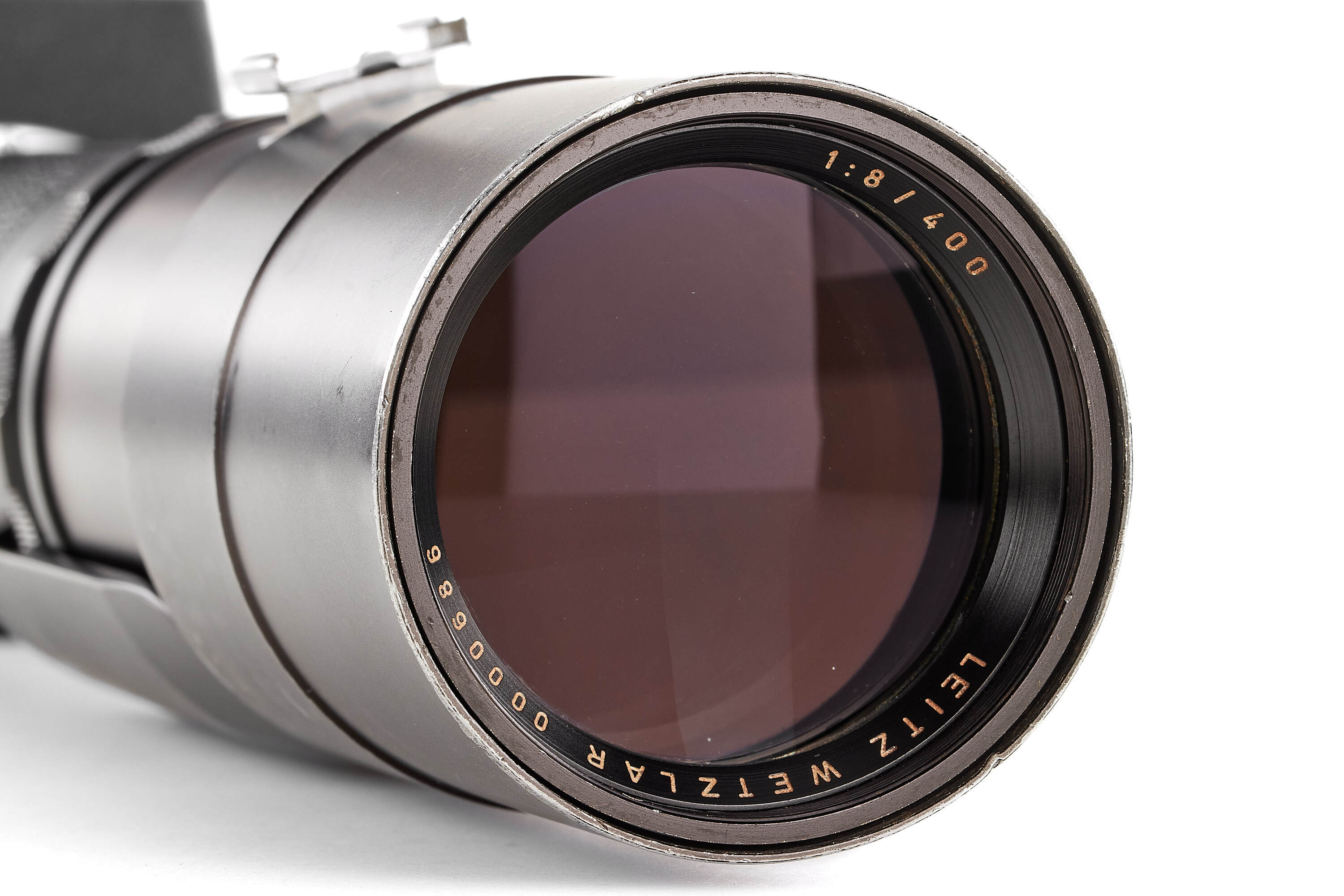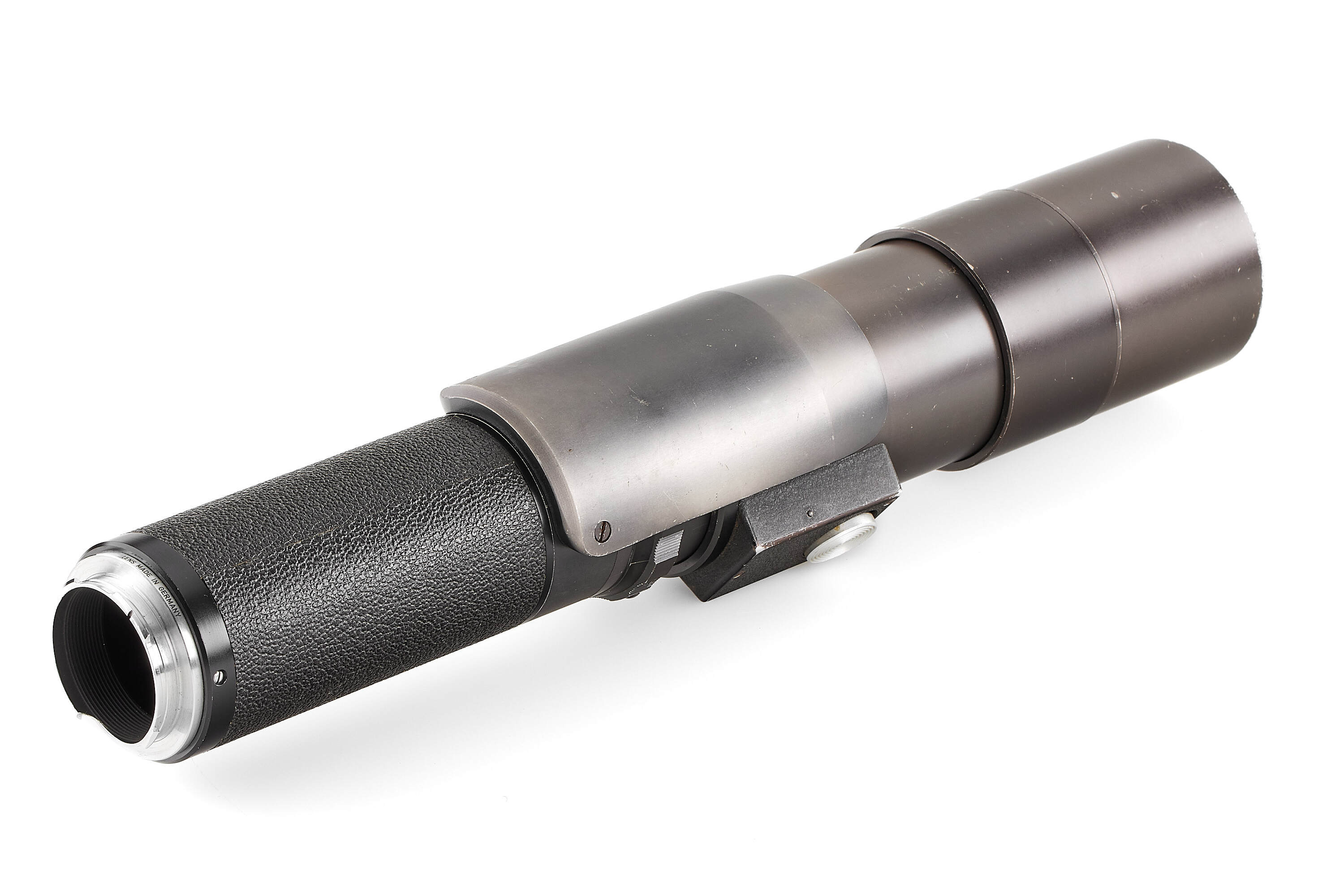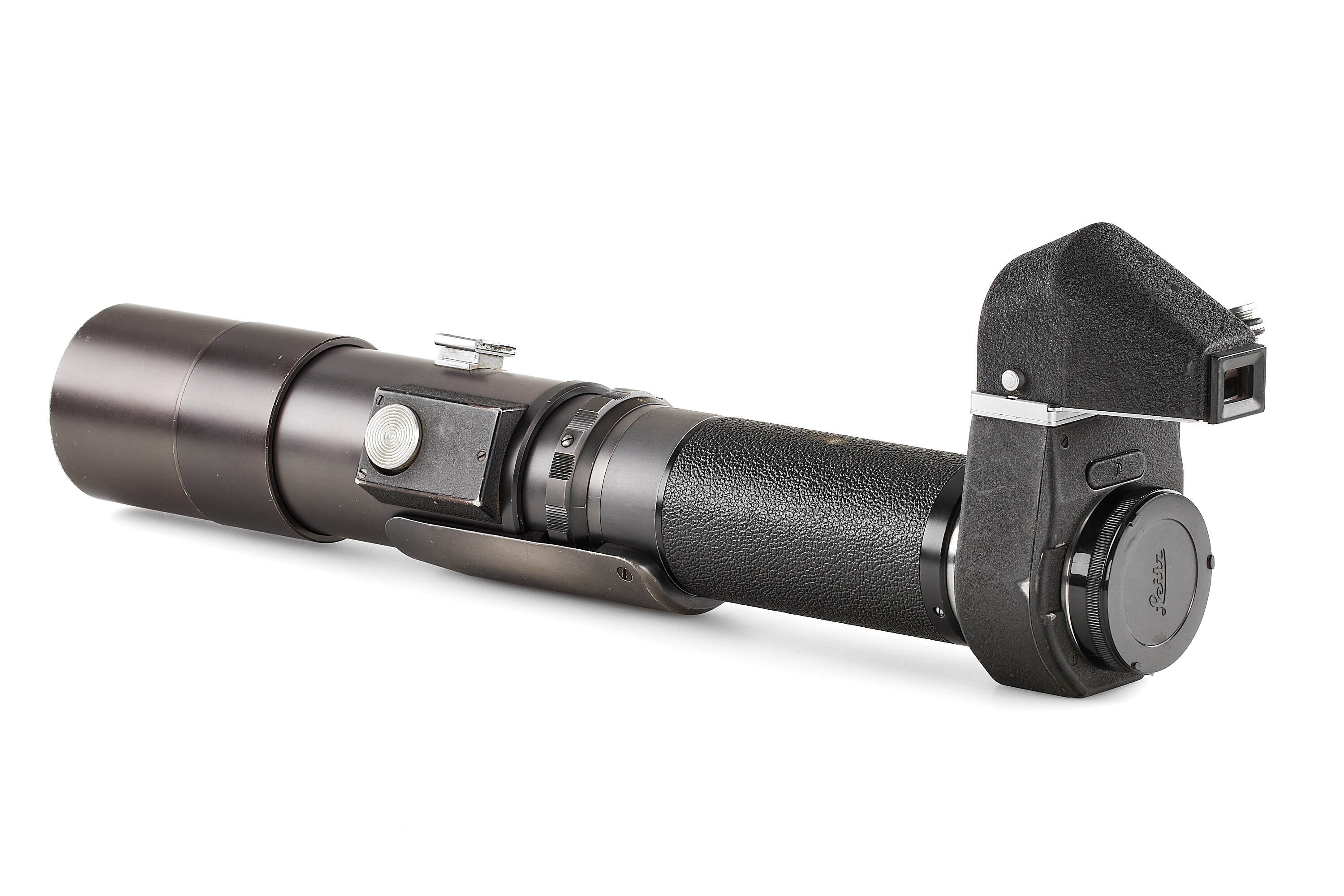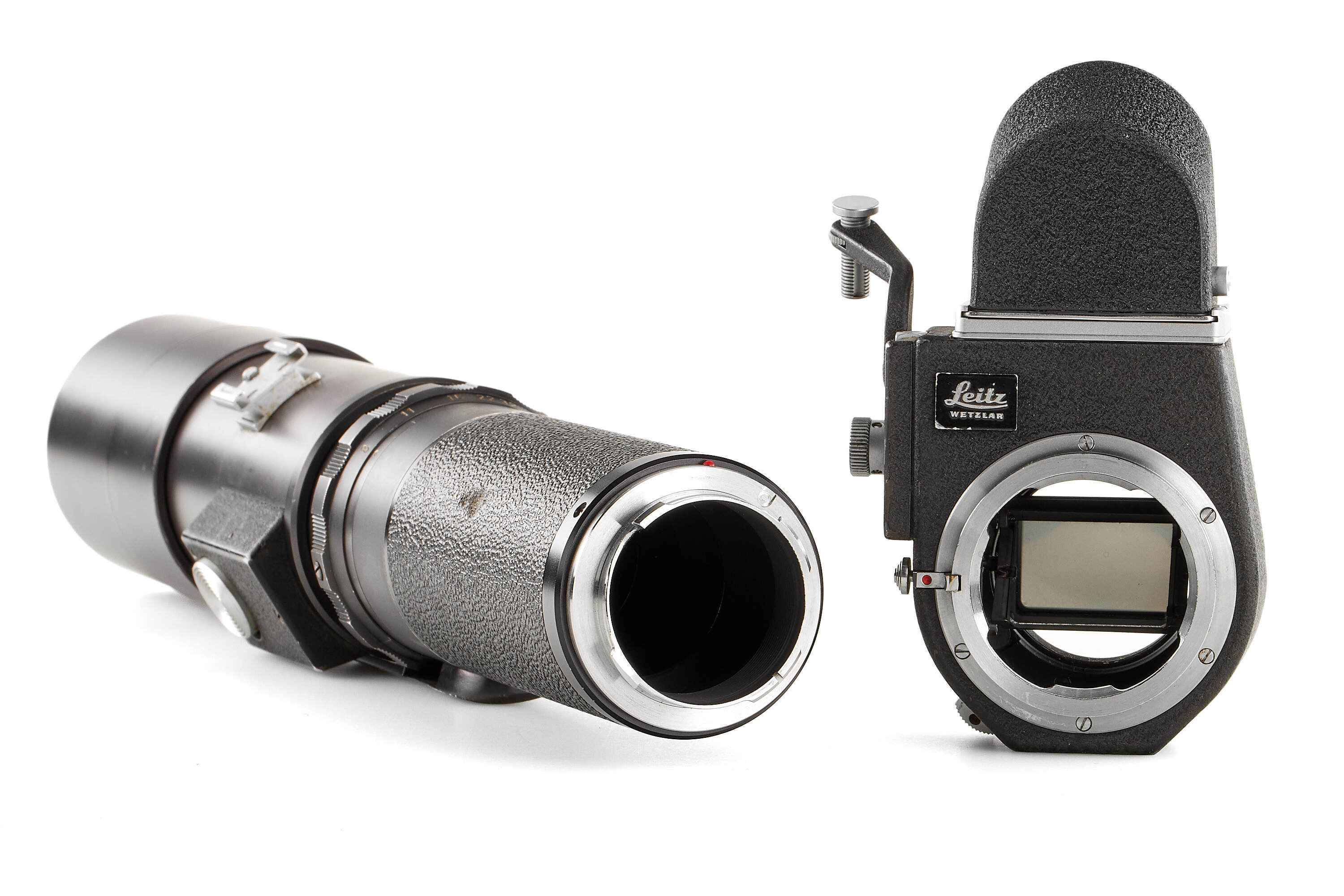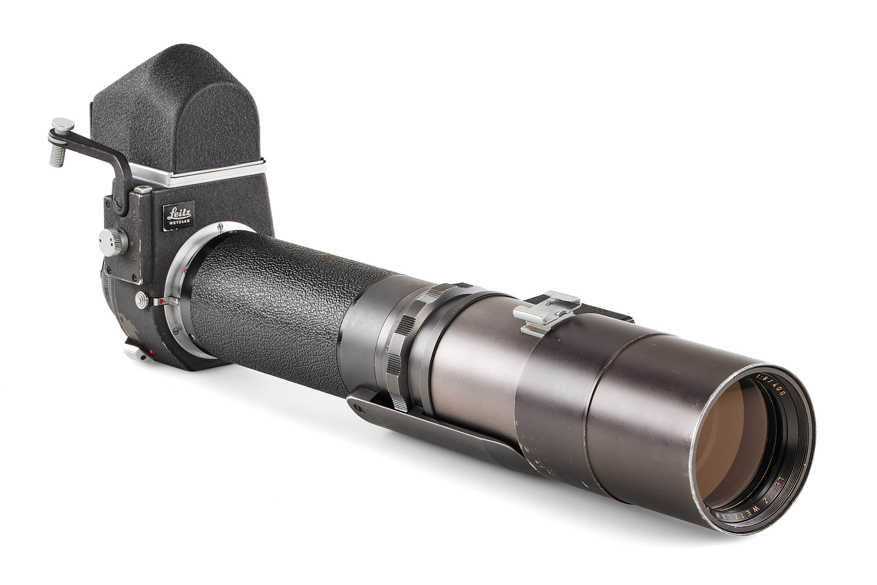 Very rare prototype Telyt 8/400mm for the Visoflex system, engraved '1:8/400 LEITZ WETZLAR 0000686'. Features a rapid-focus mechanism and a built-in retractable hood. Includes an additional lens mount for close-focus, Visoflex III, and shoulder support. In fine, well-preserved condition.