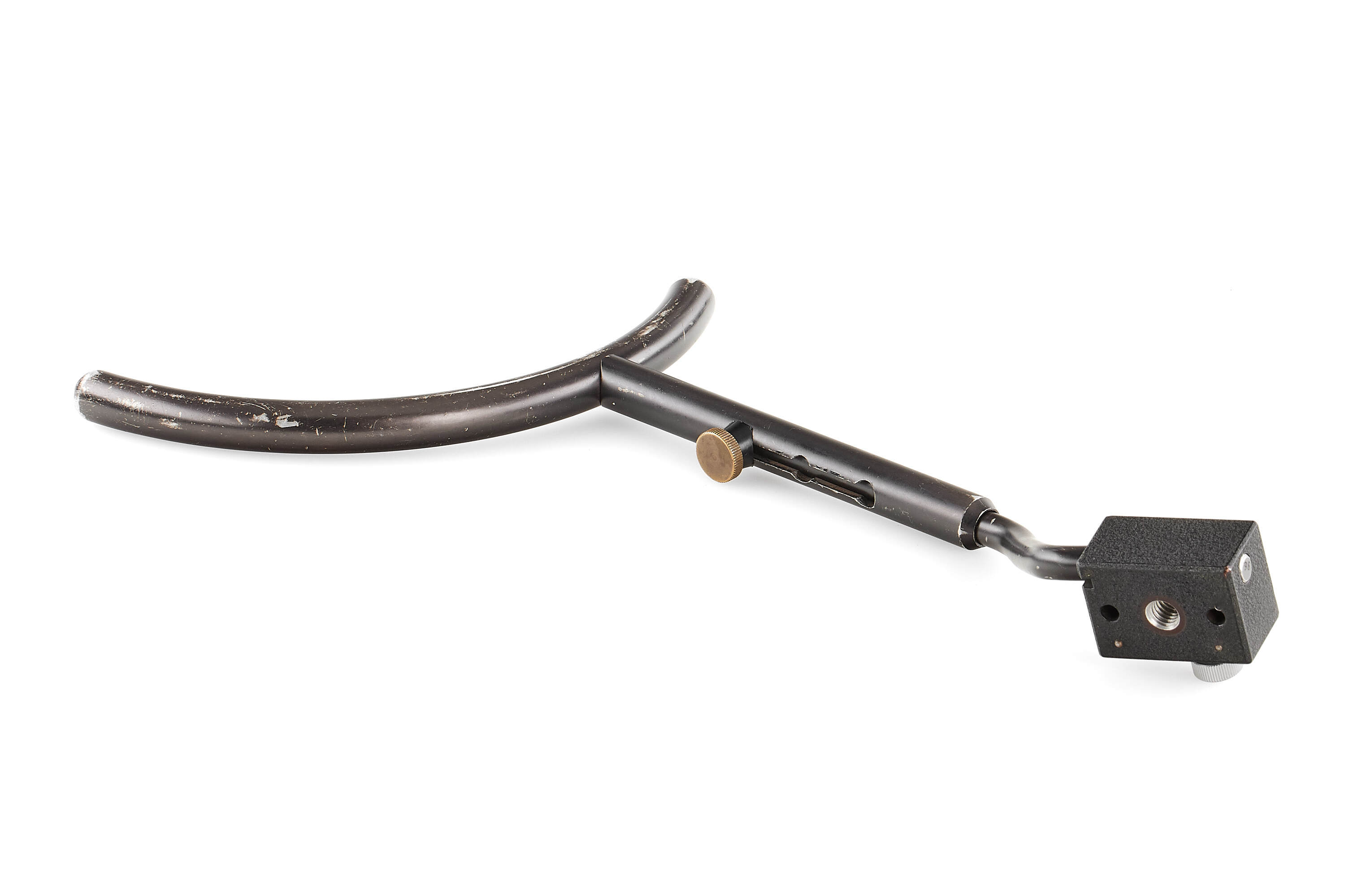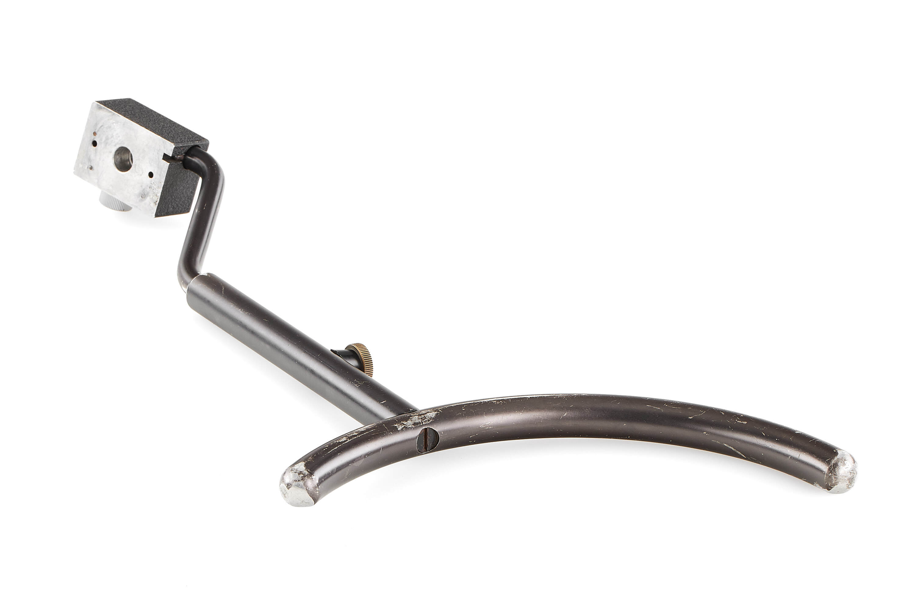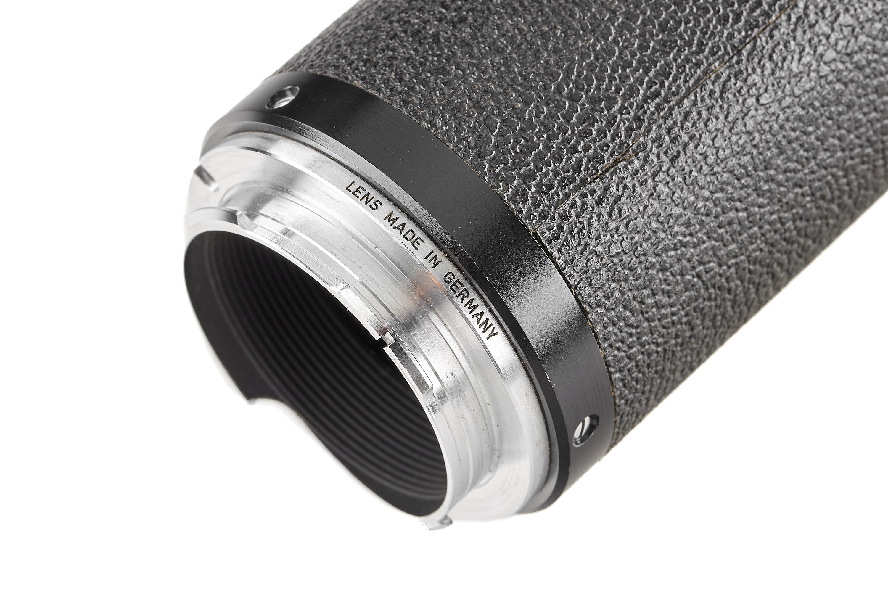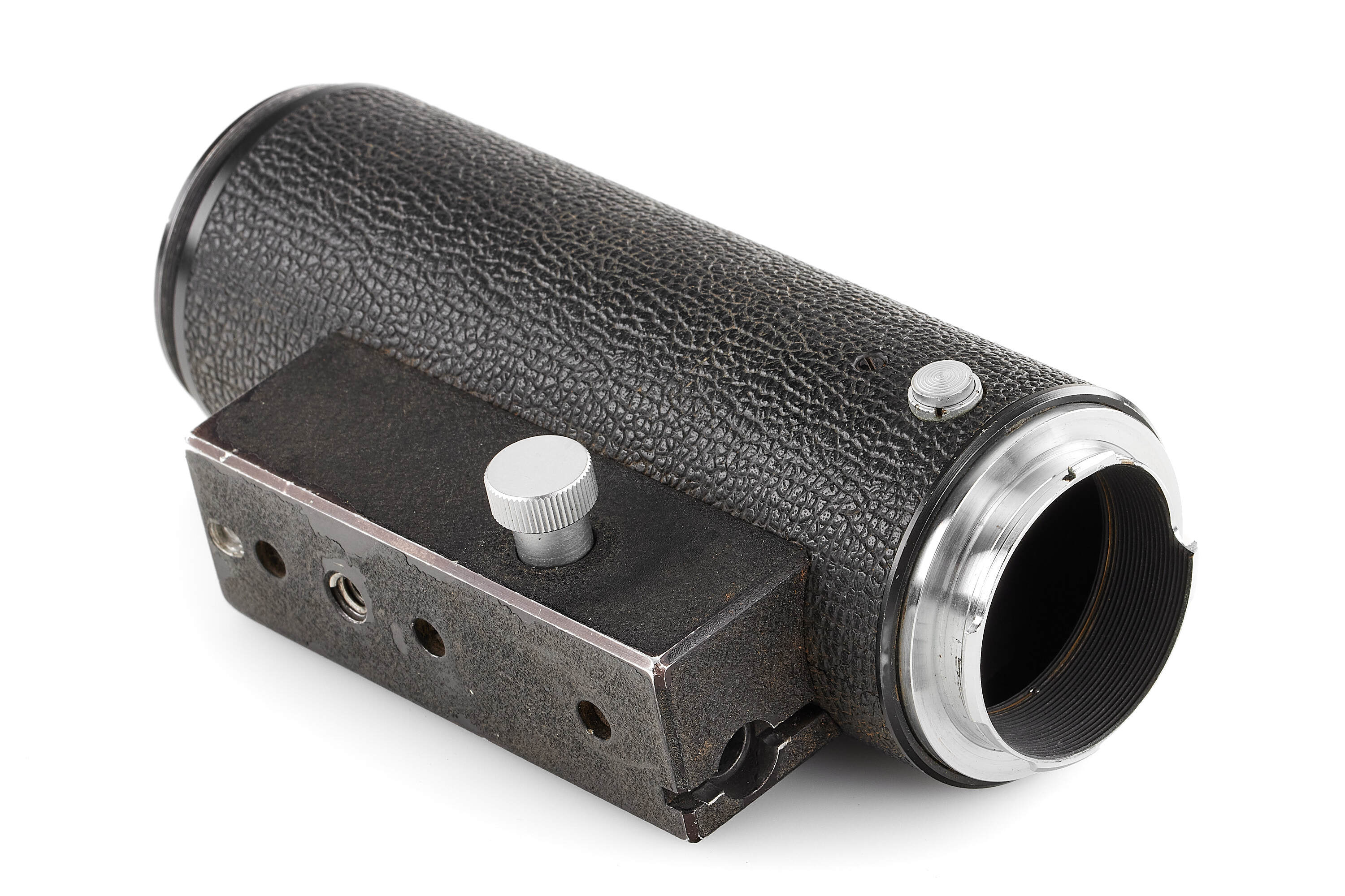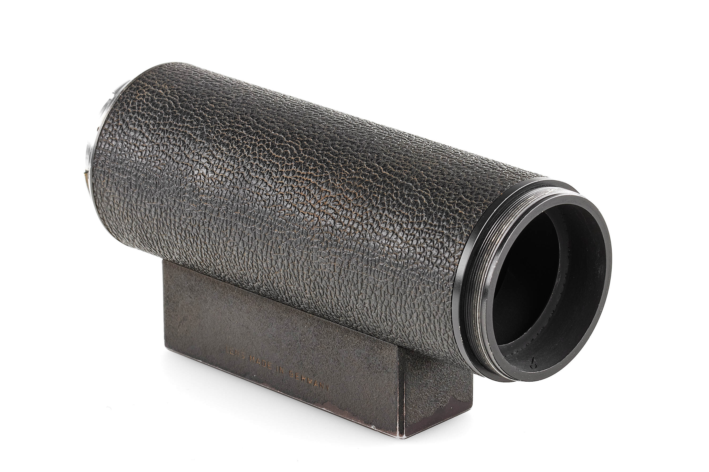 Very rare prototype Telyt 8/400mm for the Visoflex system, engraved '1:8/400 LEITZ WETZLAR 0000686'. Features a rapid-focus mechanism and a built-in retractable hood. Includes an additional lens mount for close-focus, Visoflex III, and shoulder support. In fine, well-preserved condition.