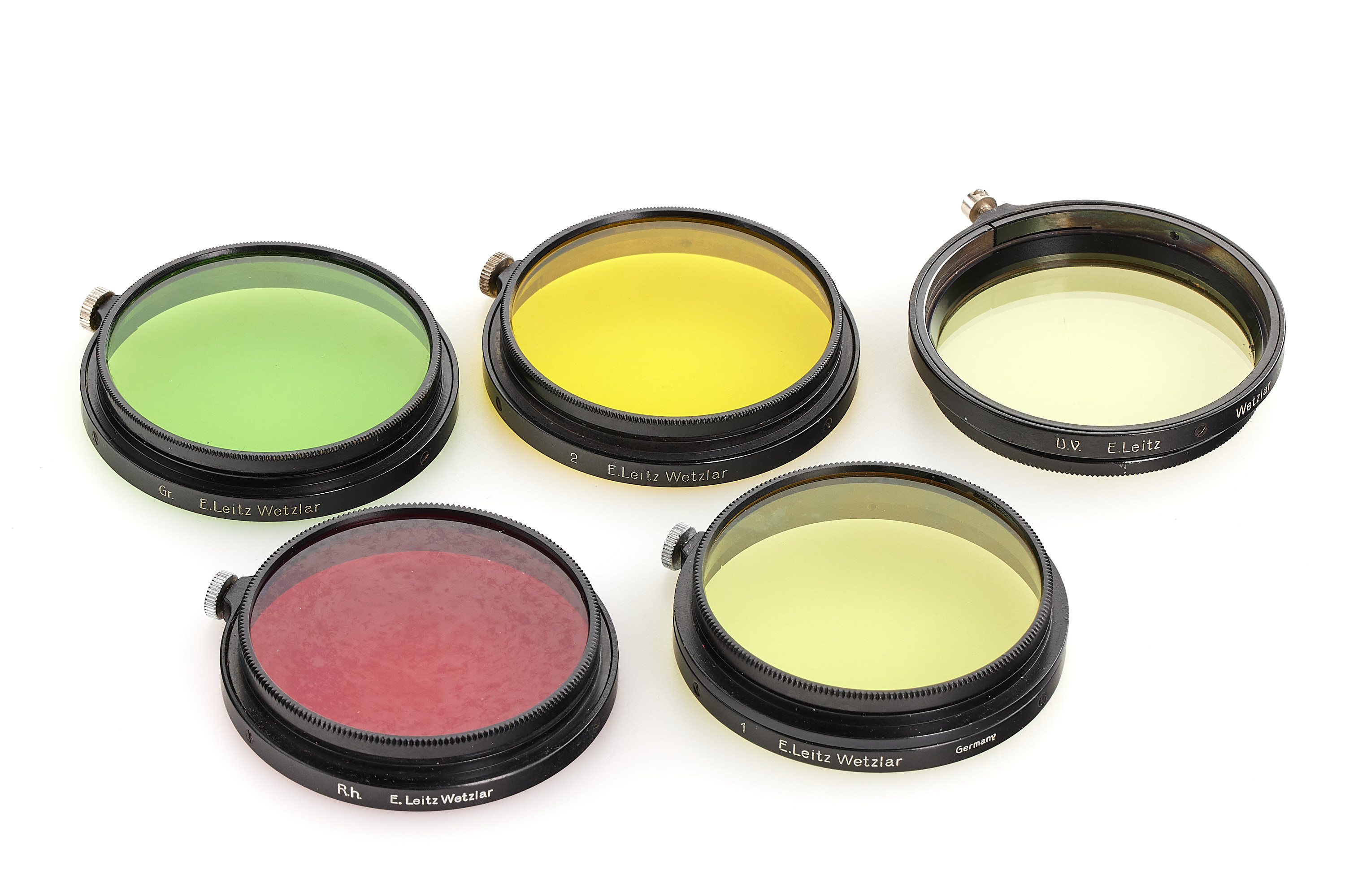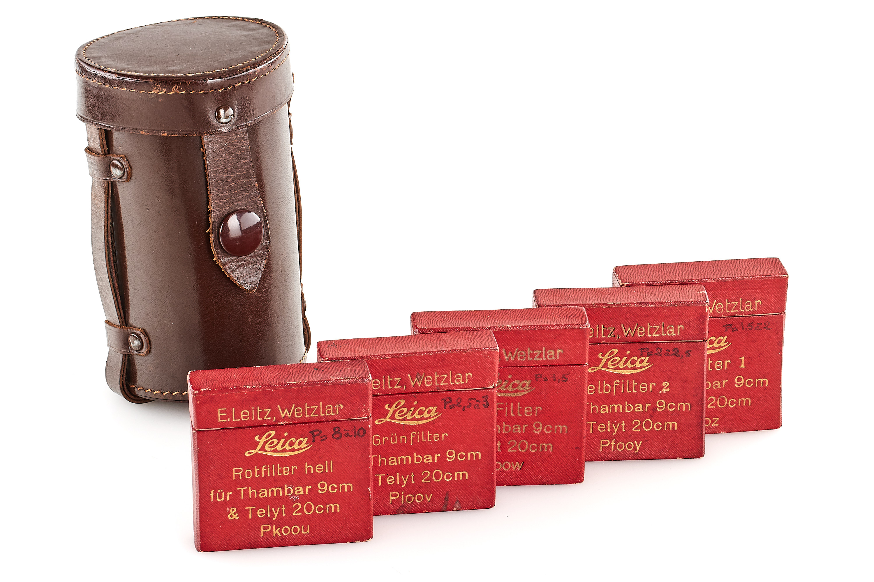 Classic and sought-after original soft-focus portrait lens, in very good condition, good lenses only showing some light cleaning marks and a discrete haze, later coated, complete set with spot filter, hood, 5x filters with their red maker's boxes (yellow 1, yellow 2, green, red and UV), leather case, and both front and rear caps.