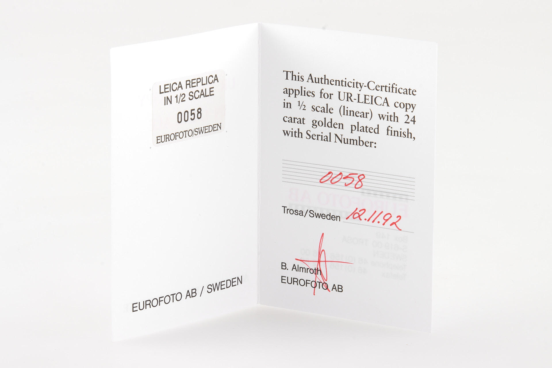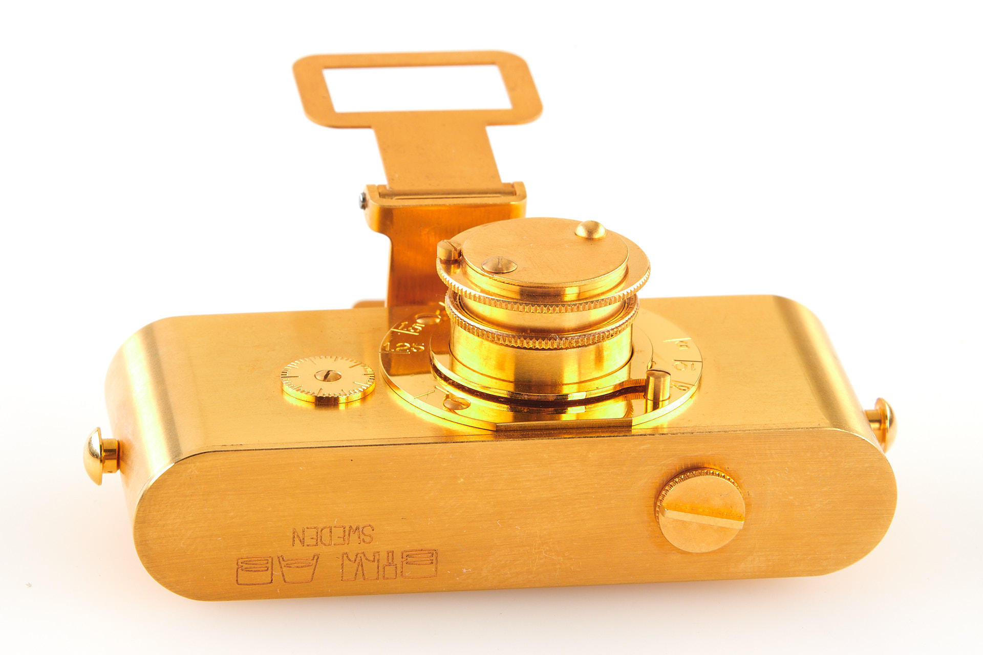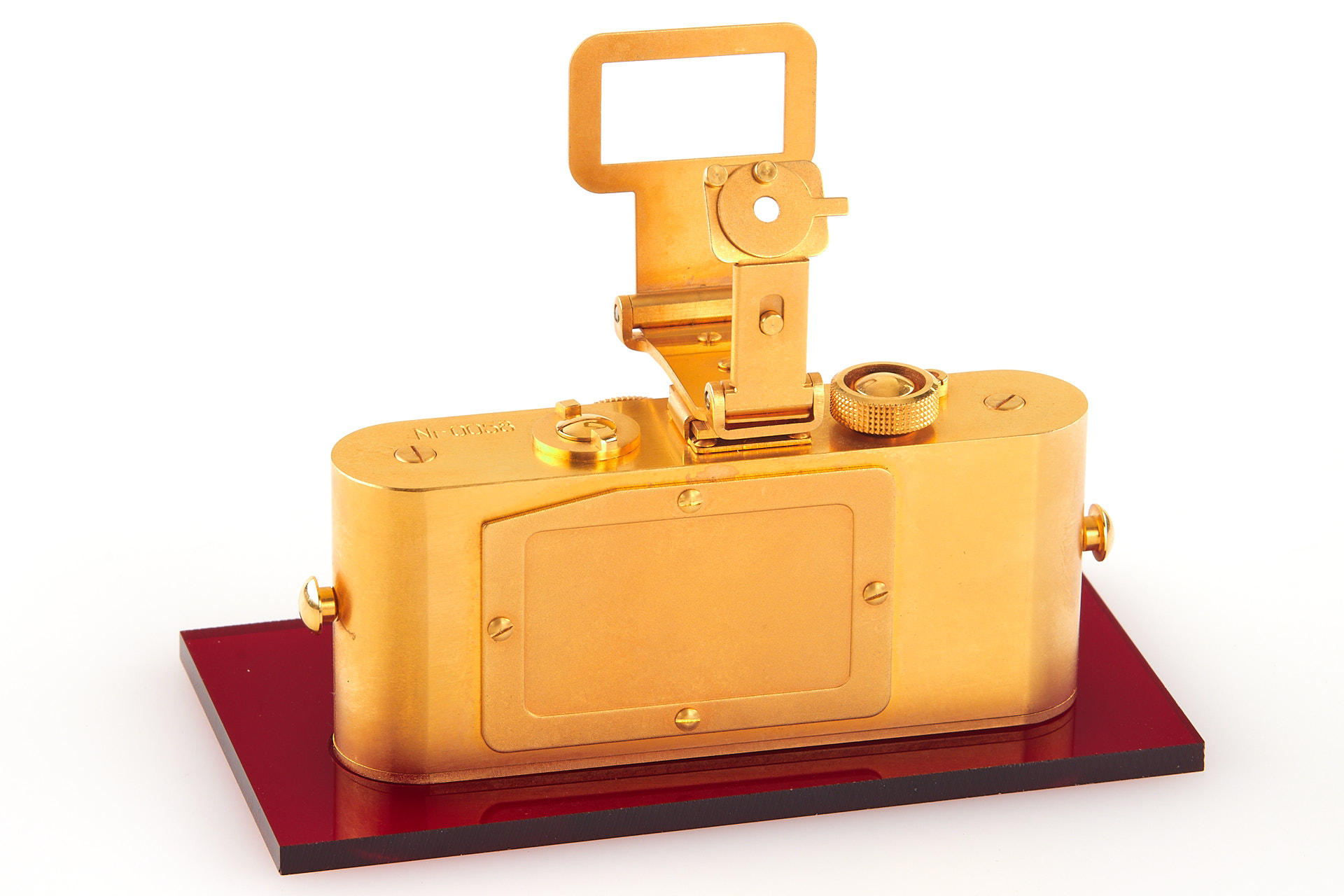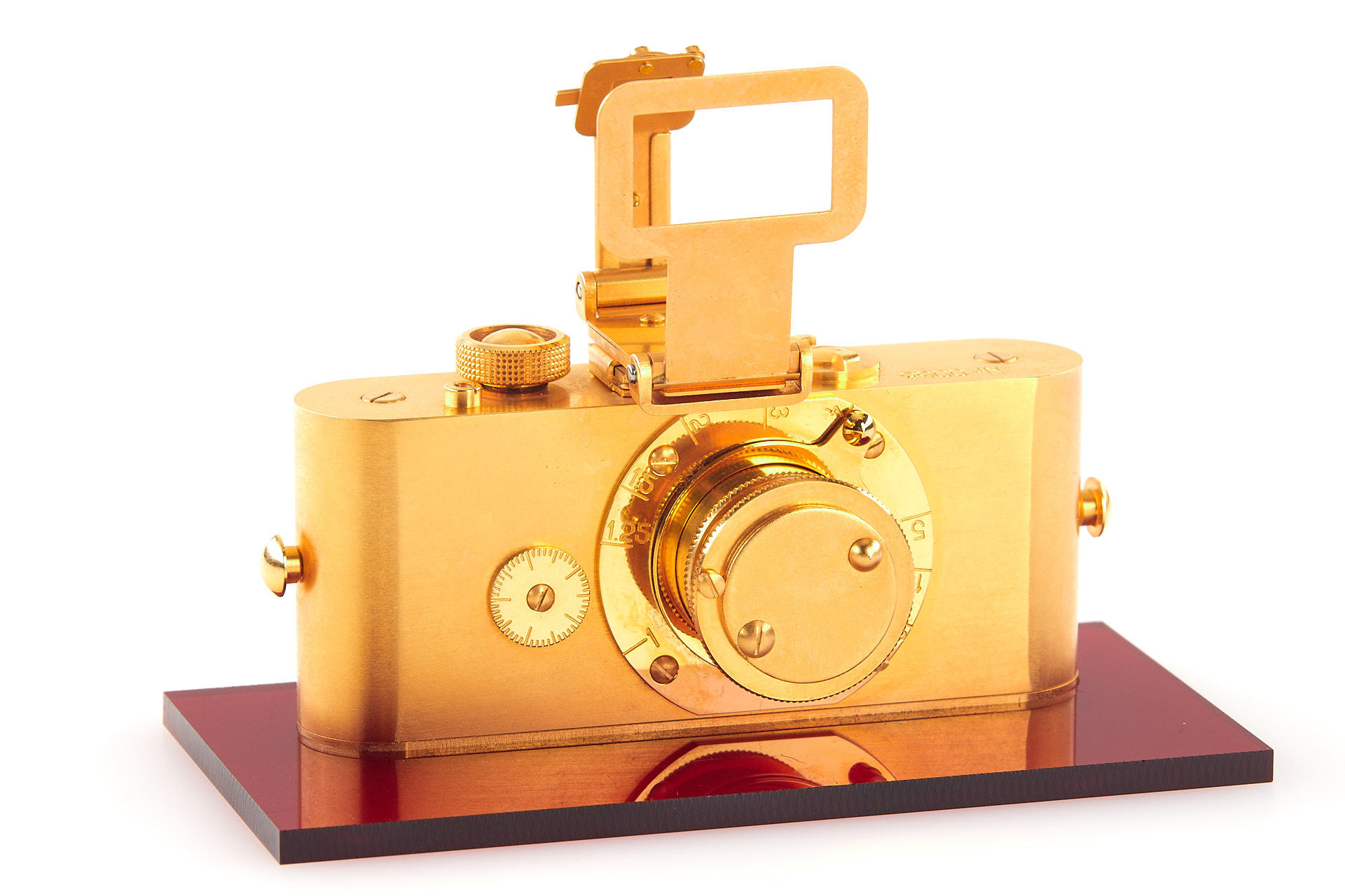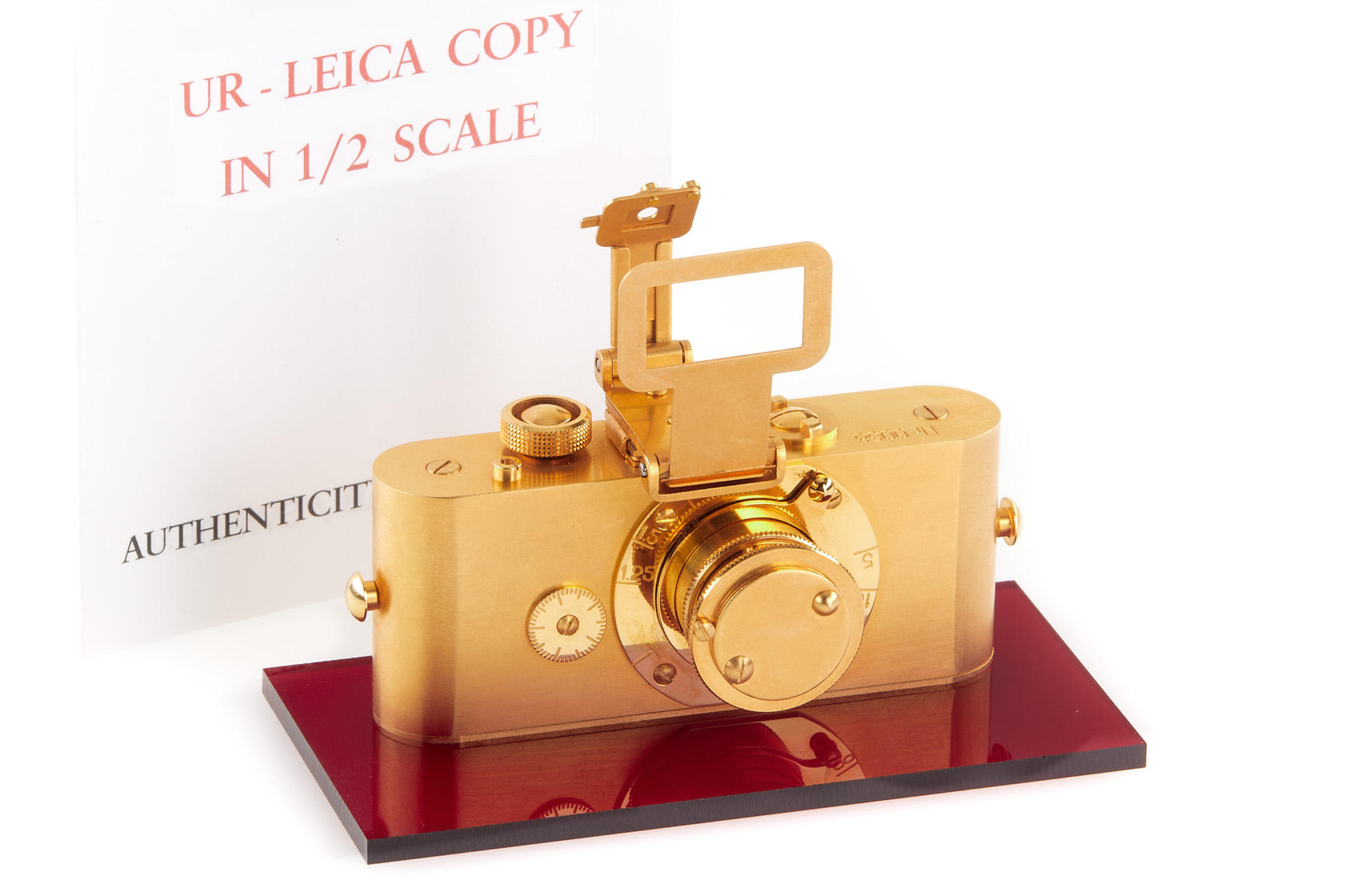 1/2 scale replica of a UR-Leica camera 24 carat gold plated made by Europhot in Sweden, in mint condition with stand, maker's box and authenticity certificate