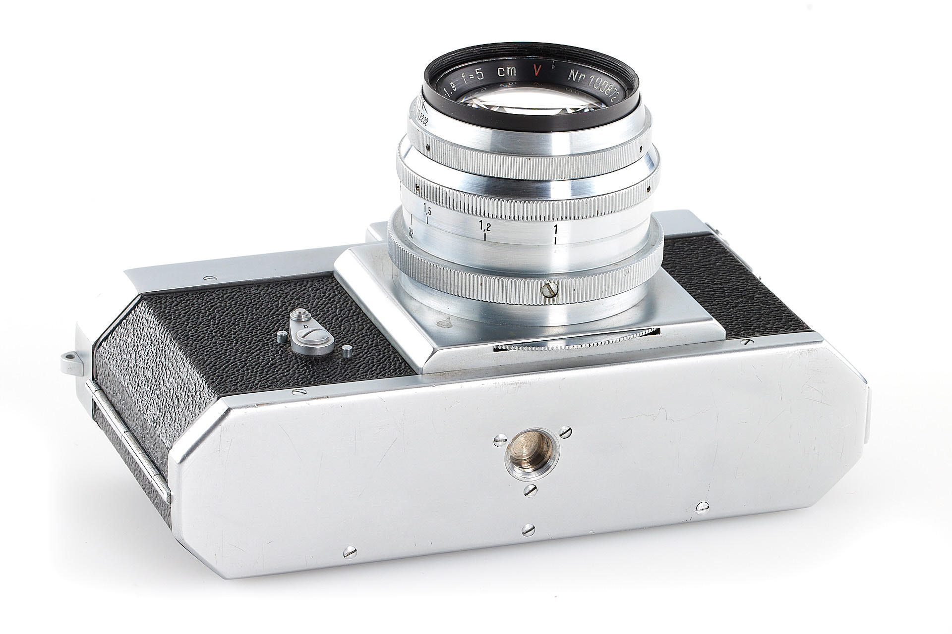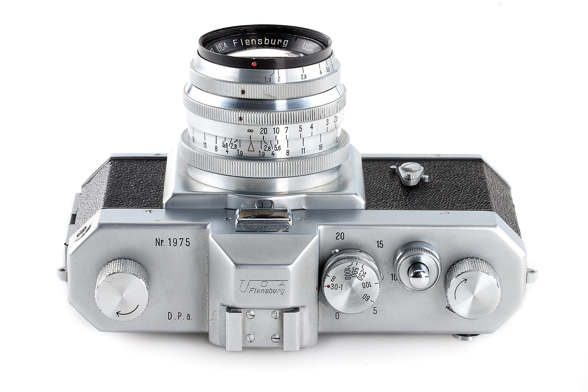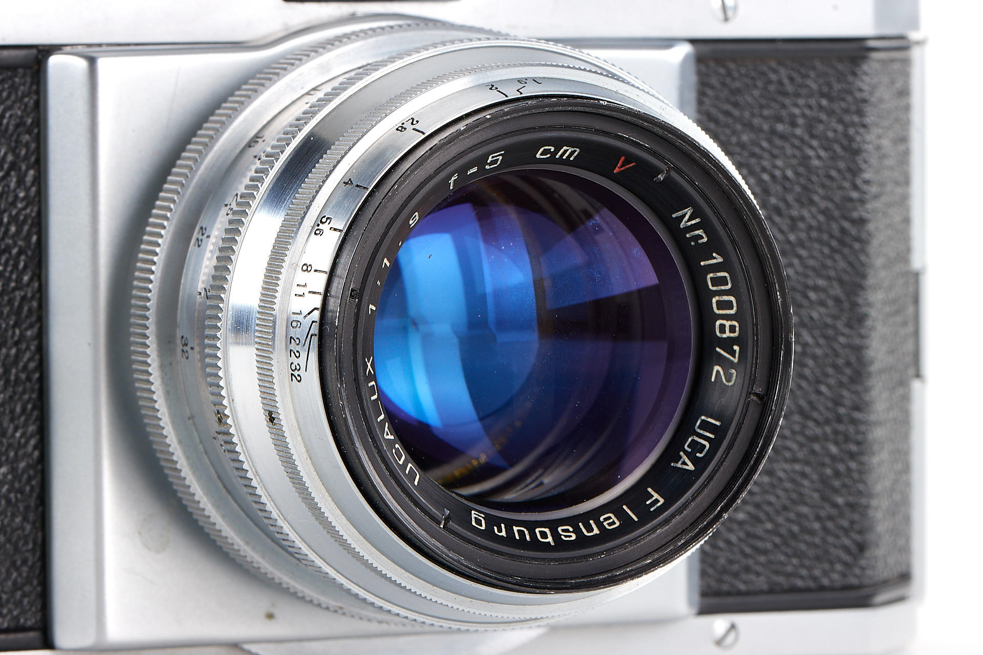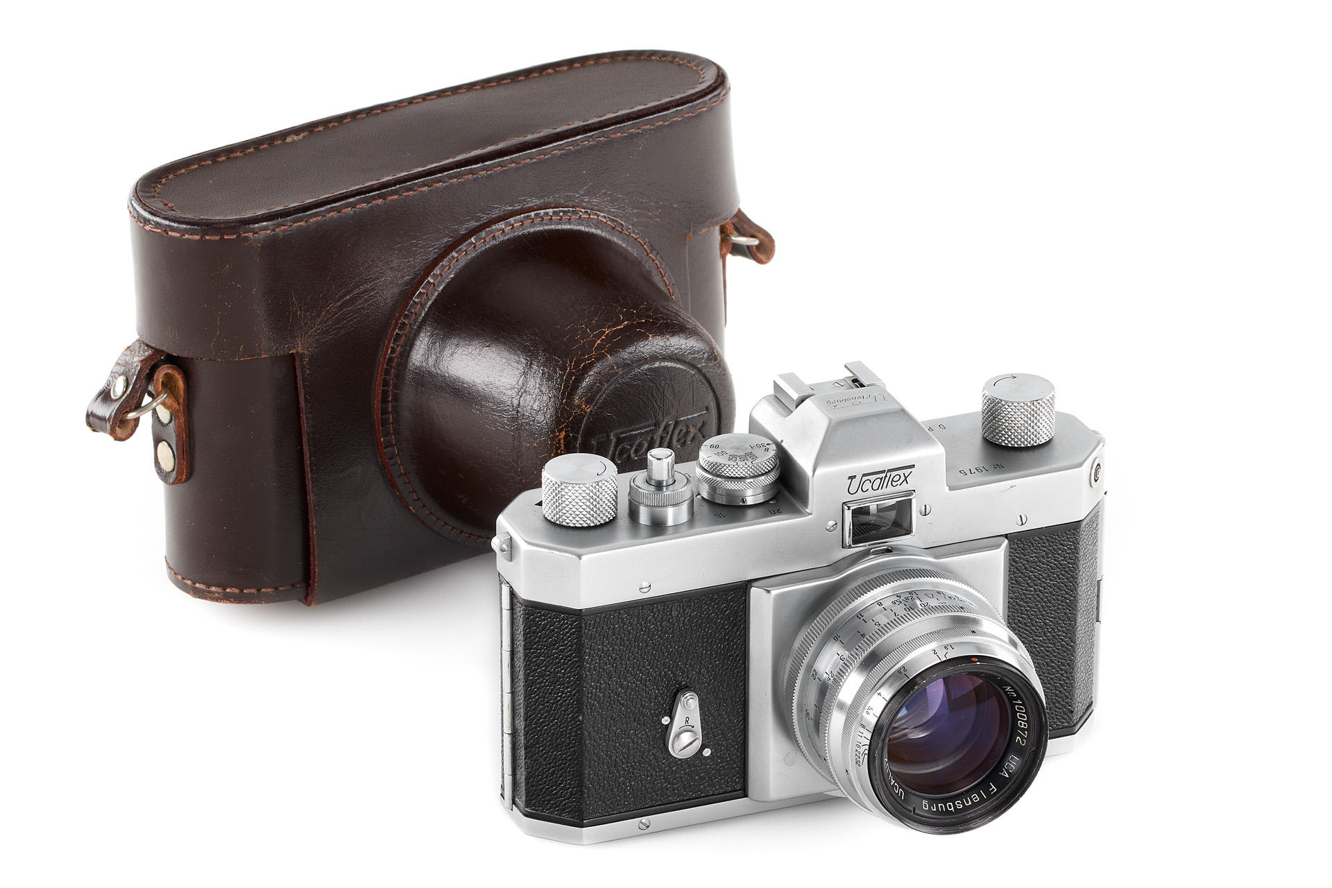 very rare 35mm camera combining features of SLR and viewfinder cameras, in near mint condition, with very rare M40 mount Ucalux 1.9/5cm no.100872, good optics only showing few and light cleaning marks, with original ever ready case