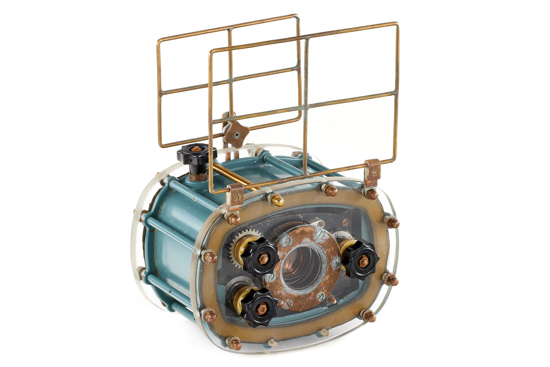 probably unique early underwater housing with well adapted camera for 35mm film, with Carl Zeiss Jena Tessar 2.8/5cm no.2240298 (1938) originally for Contax, here mounted in vario central shutter, brass construction with plexiglas front and rear windows and rubber joints, in good condition, showing signs of corrosion due to sea water