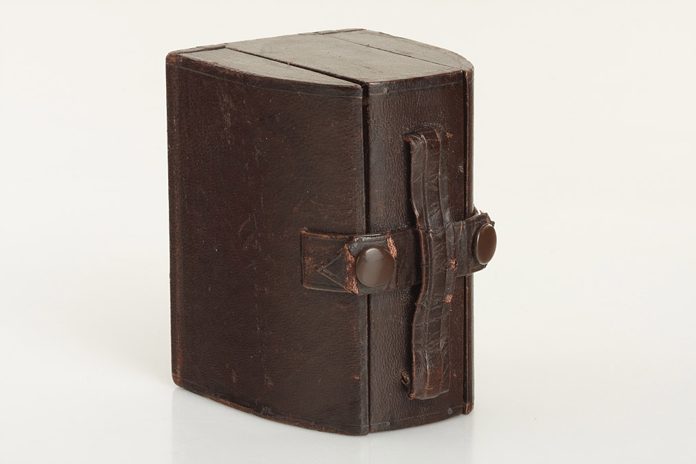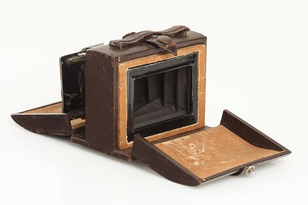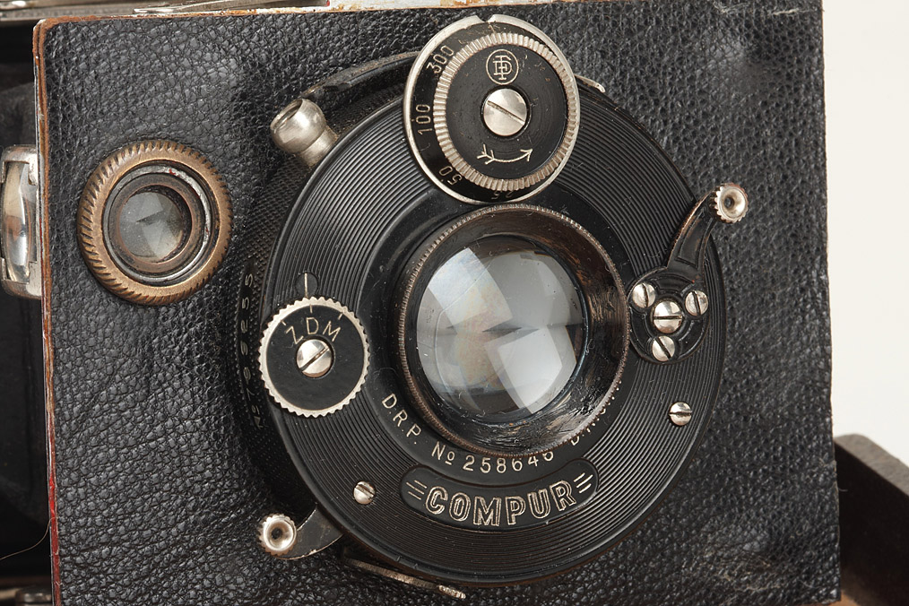 concealed strut-folding camera built into a leather pocket case for plates 4.5x6cm, lens in dial-set Compur shutter