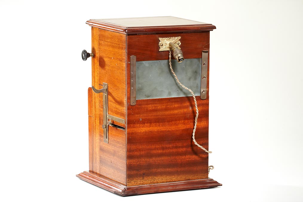 beautifully designed table-top viewer produced in the early 1920's by Mattey Paris, sold under the Unis label, the ‘Metascope’ replaced Mattey's earlier ‘Stereothéque’. A unique feature of the ‘Metascope’ is its ability to view either 45x107, or 6x13 format slides, this is done by using the appropriate size trays and inserting a metal mask behind the lenses (not included). Adjustable focus and eye base, image indicator, customized electrical illumination. A very interesting and decorative viewer.