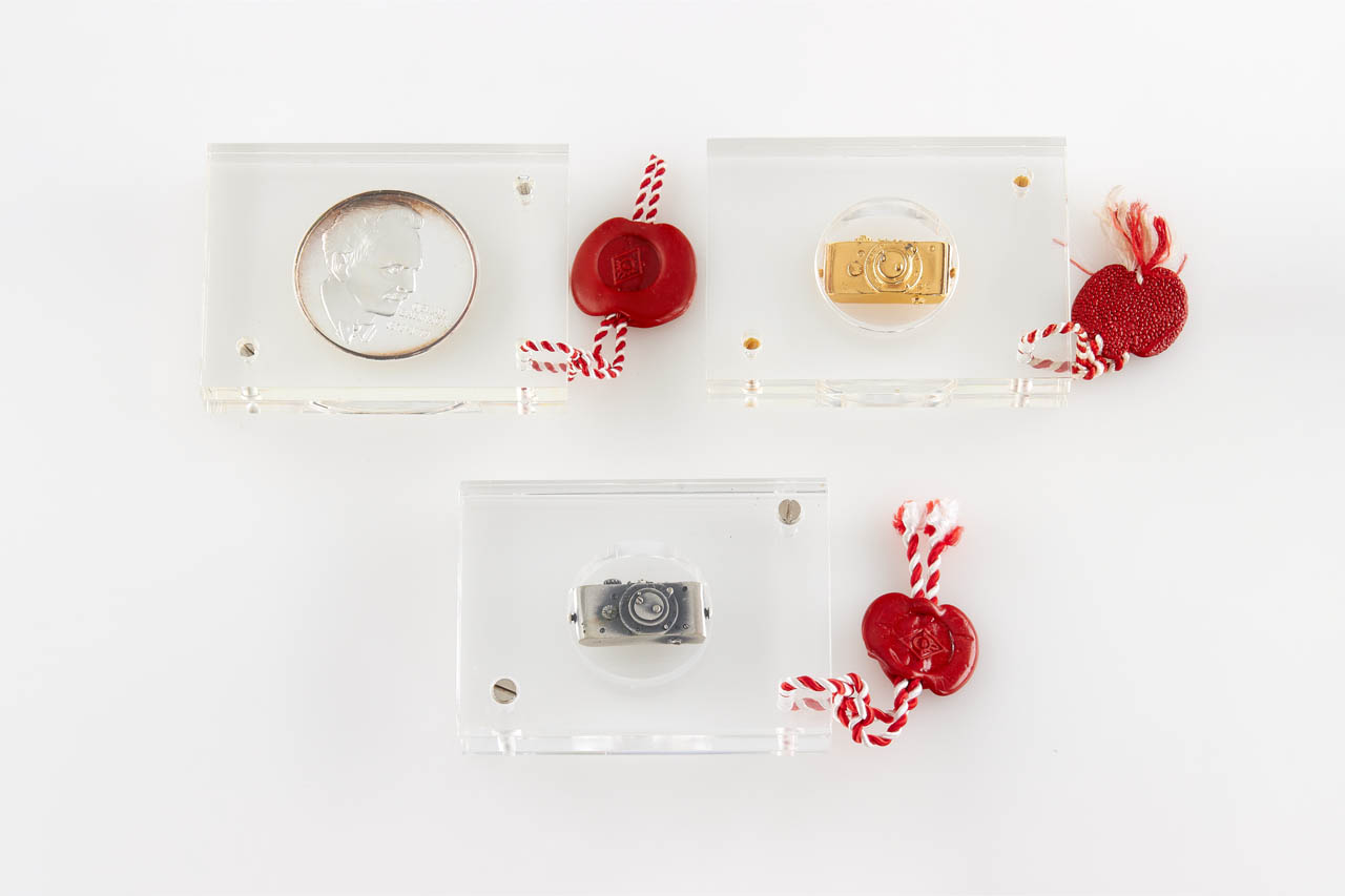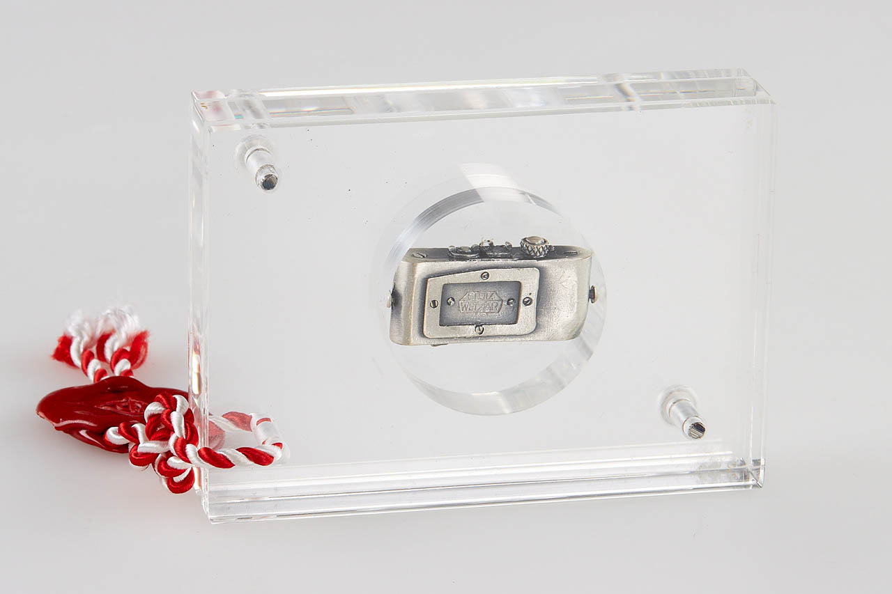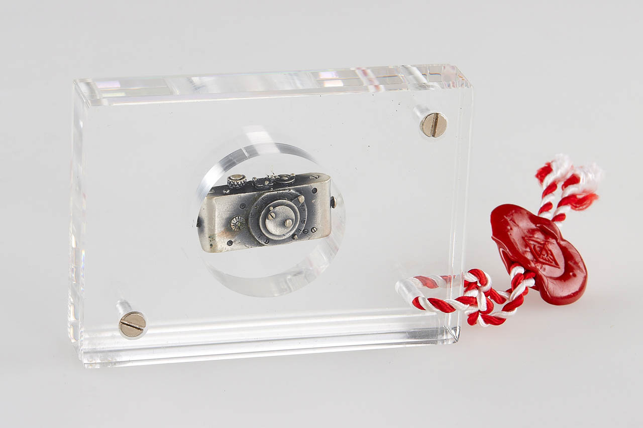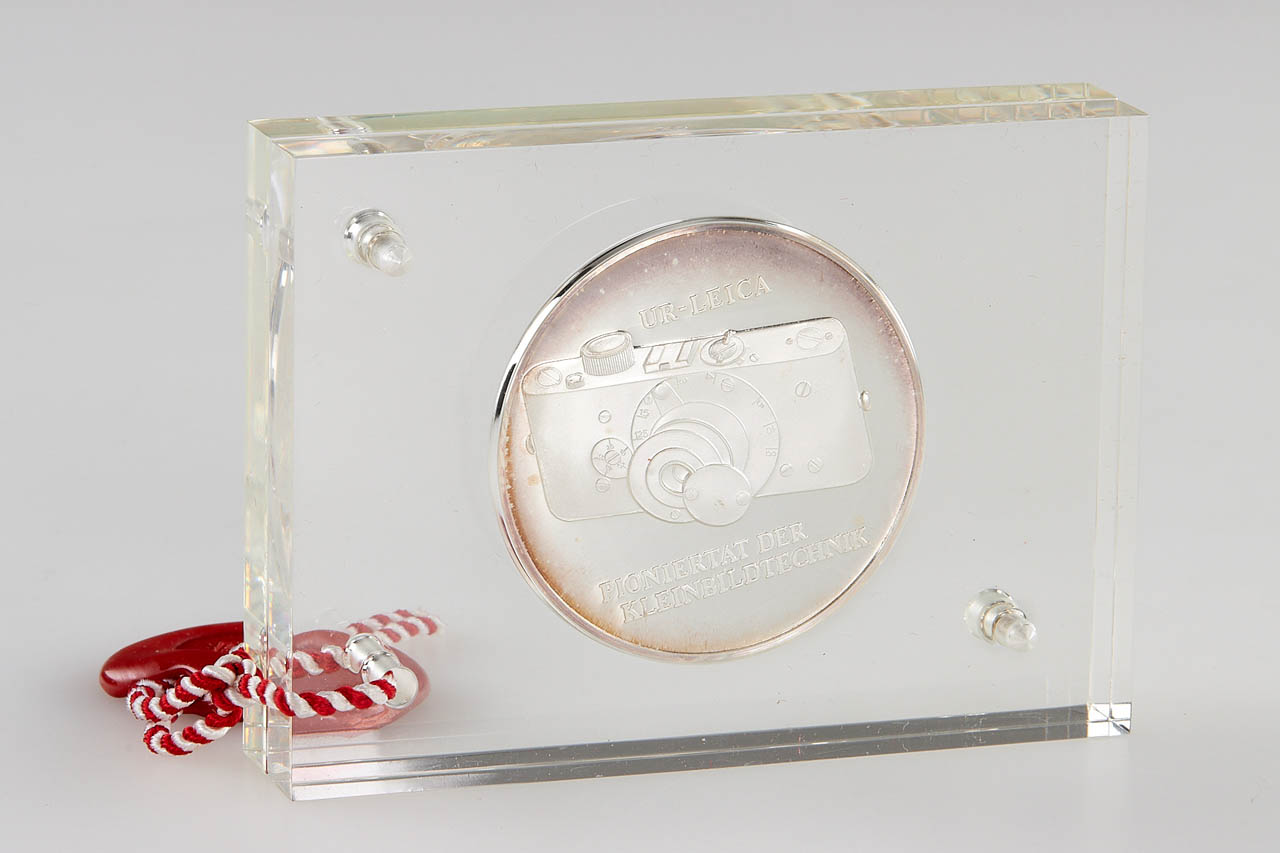 Very nice set including an Ur-Leica miniature in 800 silver gold plated, Ur-Leica miniature in 800 silver and commemorative silver coin 'Oskar Barnak 1879-1979', all in acryl glass and plastic boxes.