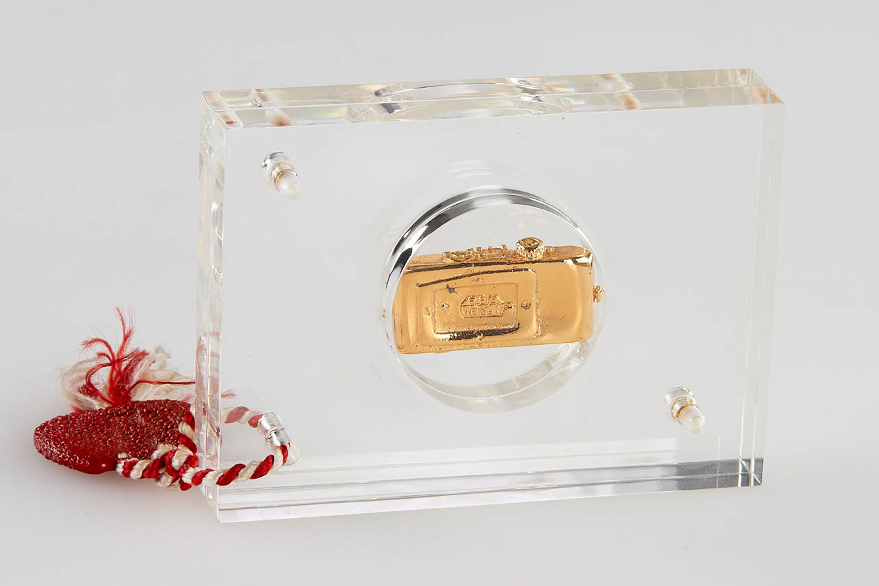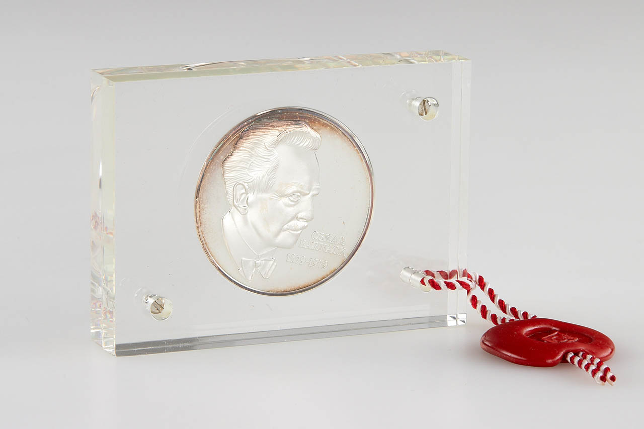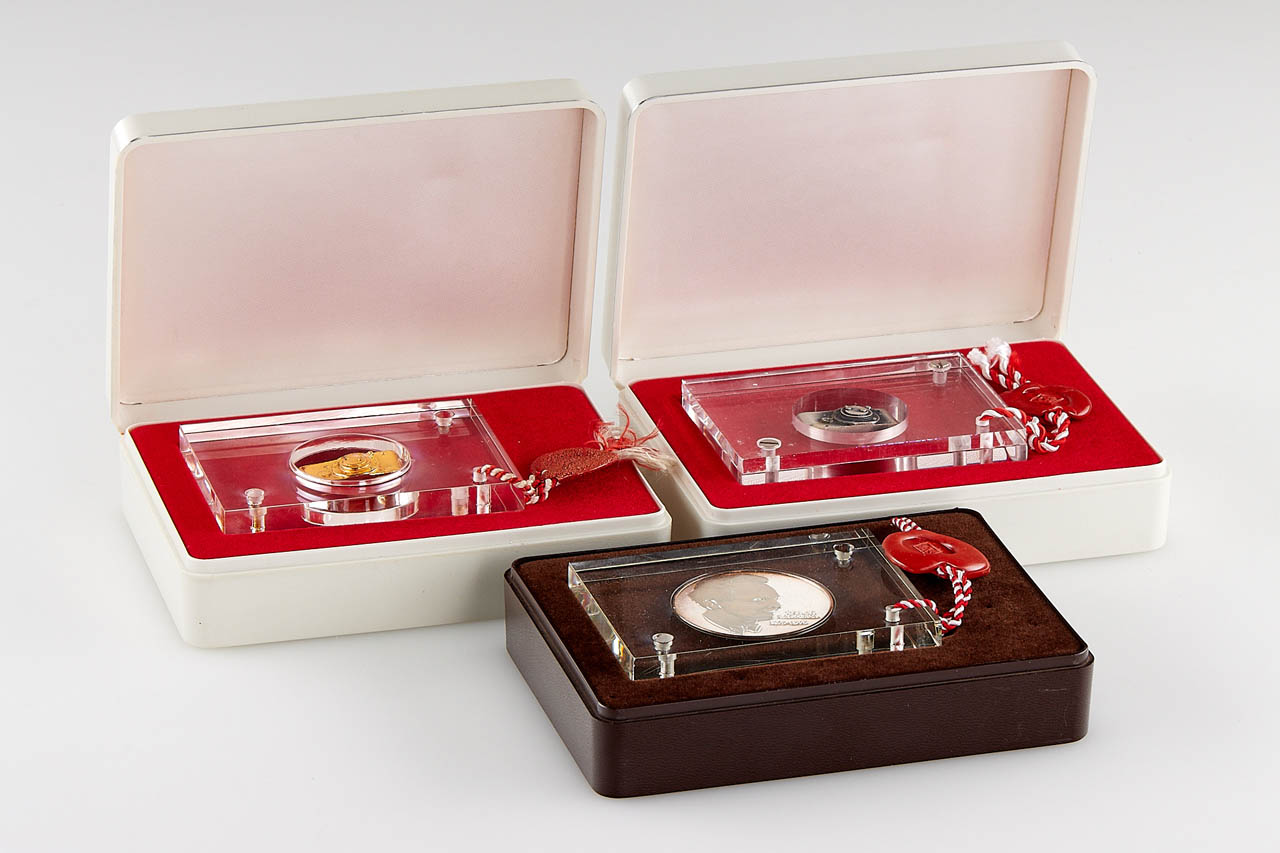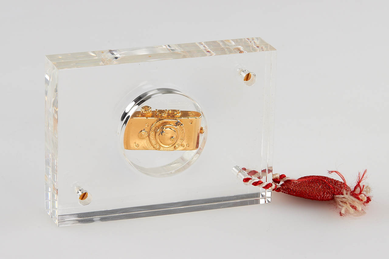 Very nice set including an Ur-Leica miniature in 800 silver gold plated, Ur-Leica miniature in 800 silver and commemorative silver coin 'Oskar Barnak 1879-1979', all in acryl glass and plastic boxes.