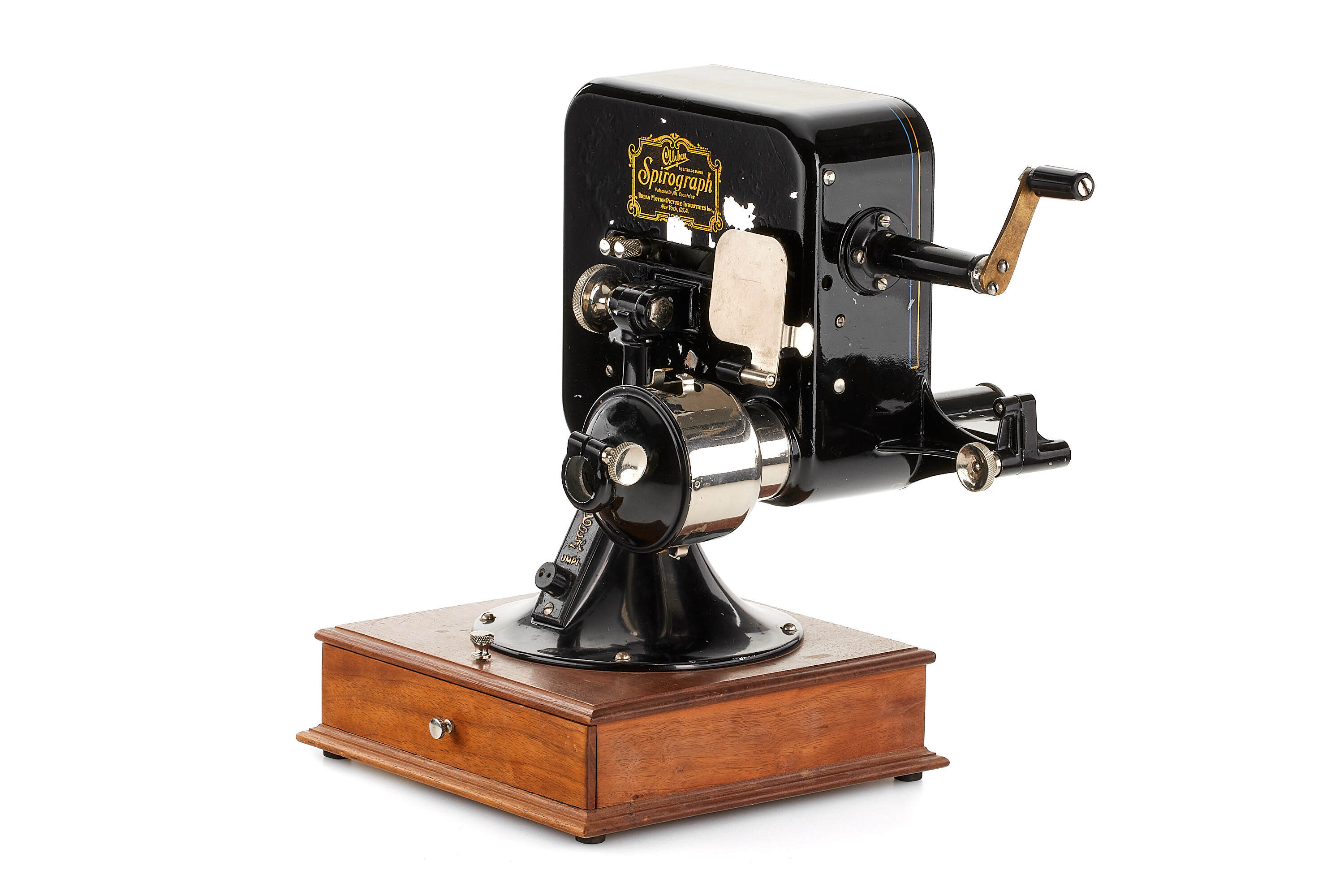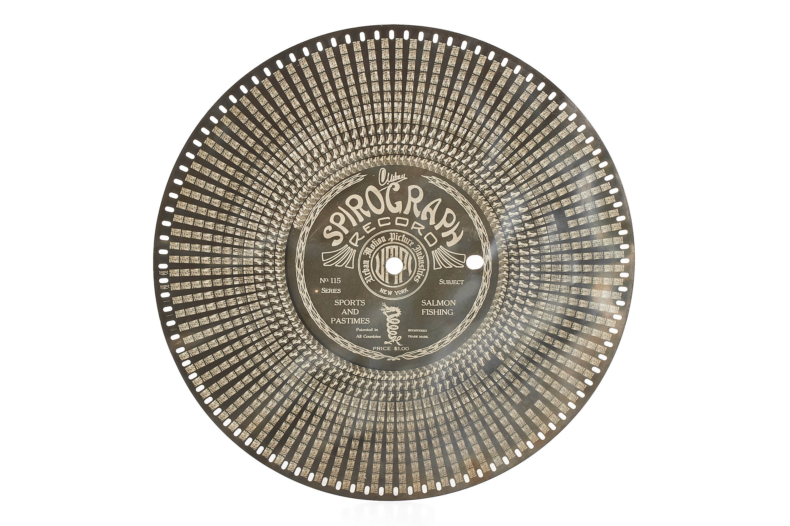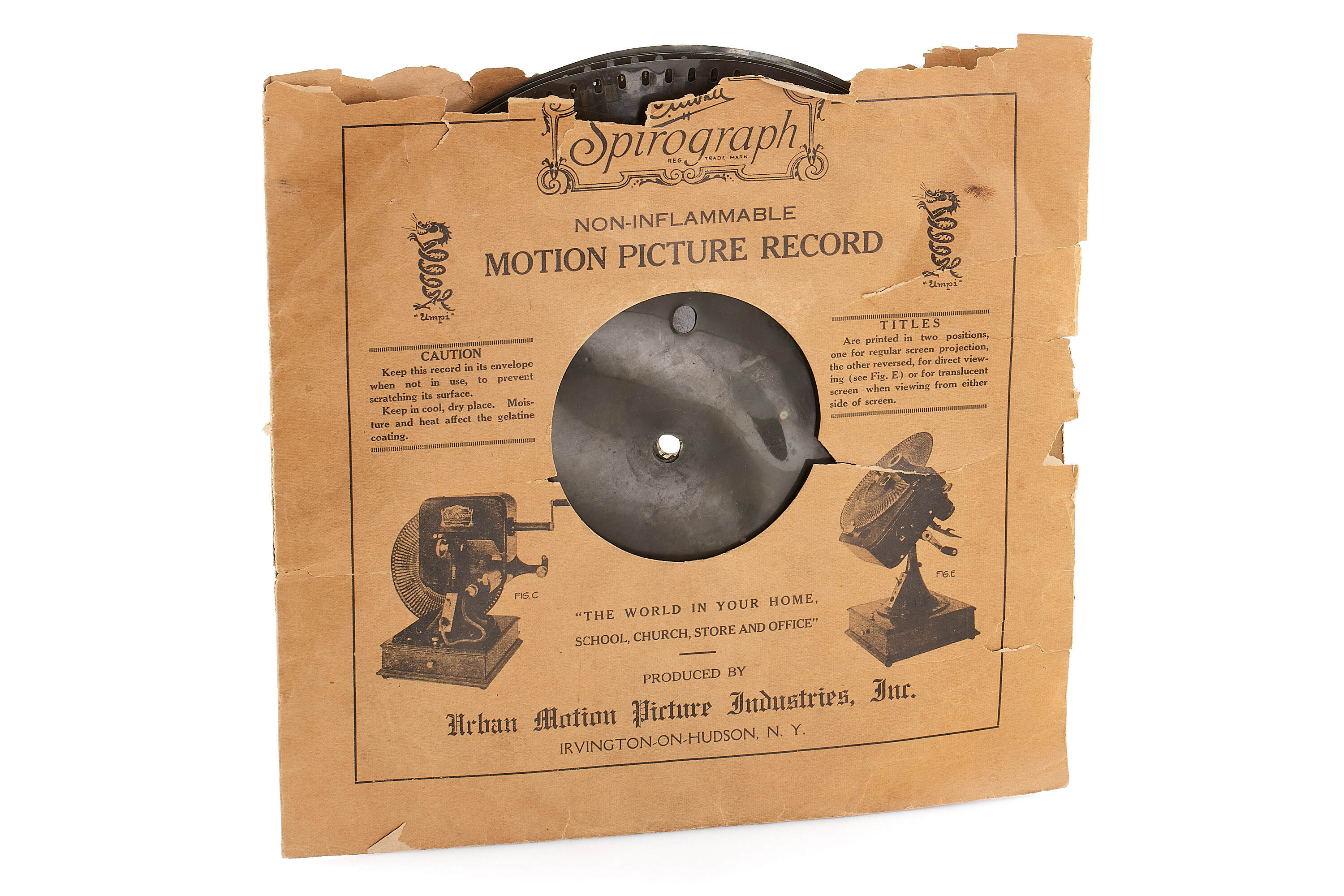 The Spirograph is a hand-cranked mechanical device designed to play 10½-inch “motion picture records.” Each disc contains 1,200 frames of silent film arranged in a spiral. When operated at the correct speed, the films run for approximately 1¼ minutes. These films were never intended for theatrical release; the Spirograph was conceived as a personal home entertainment system.