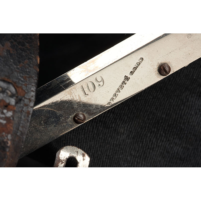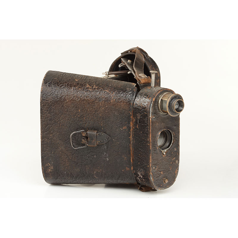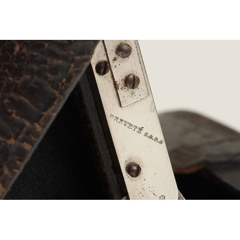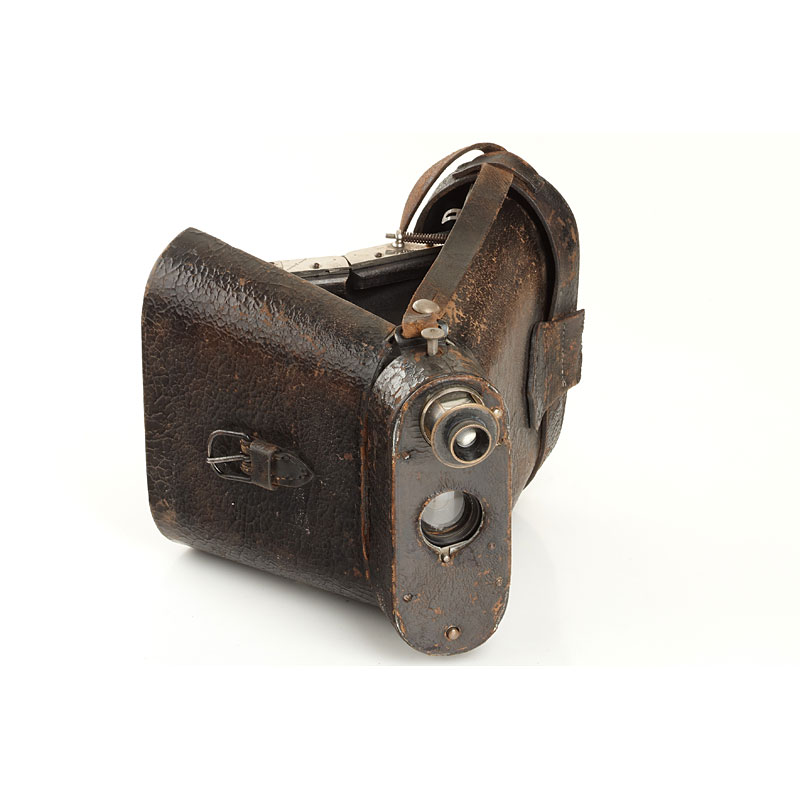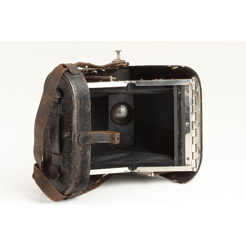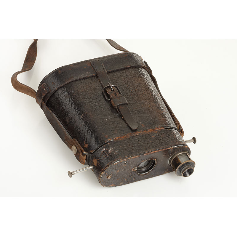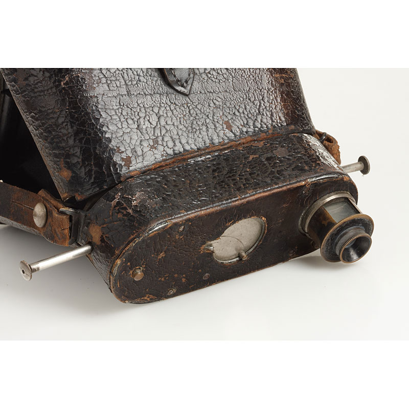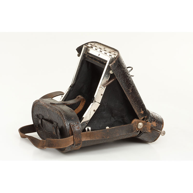 Detective camera disguised as a binocular case. Patented in 1891 by Franck Valéry. The formed sheet-metal body is covered with leather. To use the camera, you open the cover of the “binocular case” and spread the two sides apart. Two knee-struts hold the back open and accept a film holder. Rapid Rectilinear lens, non-self-capping guillotine shutter. This is one of the rarest of the disguised cameras. They were made for only a short time, with limited success. Very few examples have survived. The leather shows signs of age typical for this camera - ex Jim McKeown Collection