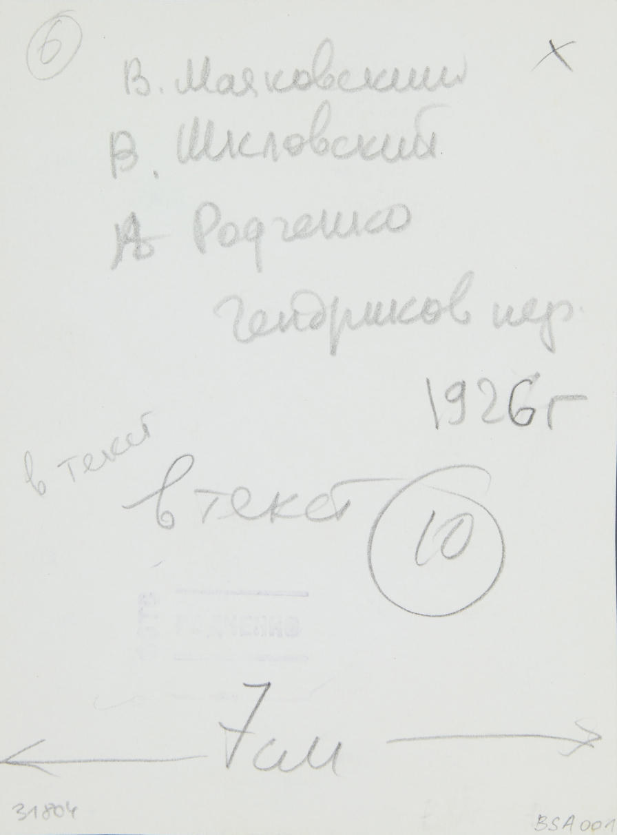 Gelatin silver print, printed in the 1960s 13,9 x 10,4 cm Photographer’s stamp on the reverse, annotated “V. Mayakovsky, V. Shklovski, A. Rodchenko, in Gendrikov side street. 1926” in an unidentified hand in pencil on the reverse PROVENANCE Howard Schickler Fine Art, New York LITERATURE Alexander Lavrentiev, Rodchenko Photography 1924–1954, Cologne 1995, p. 76; Rodtschenko, Stepanova, Die Zukunft ist unser einziges Ziel…, Vienna 1991, p. 35.