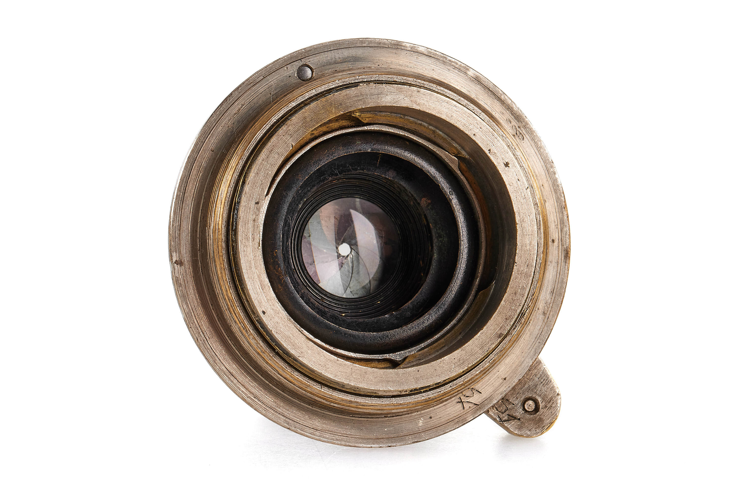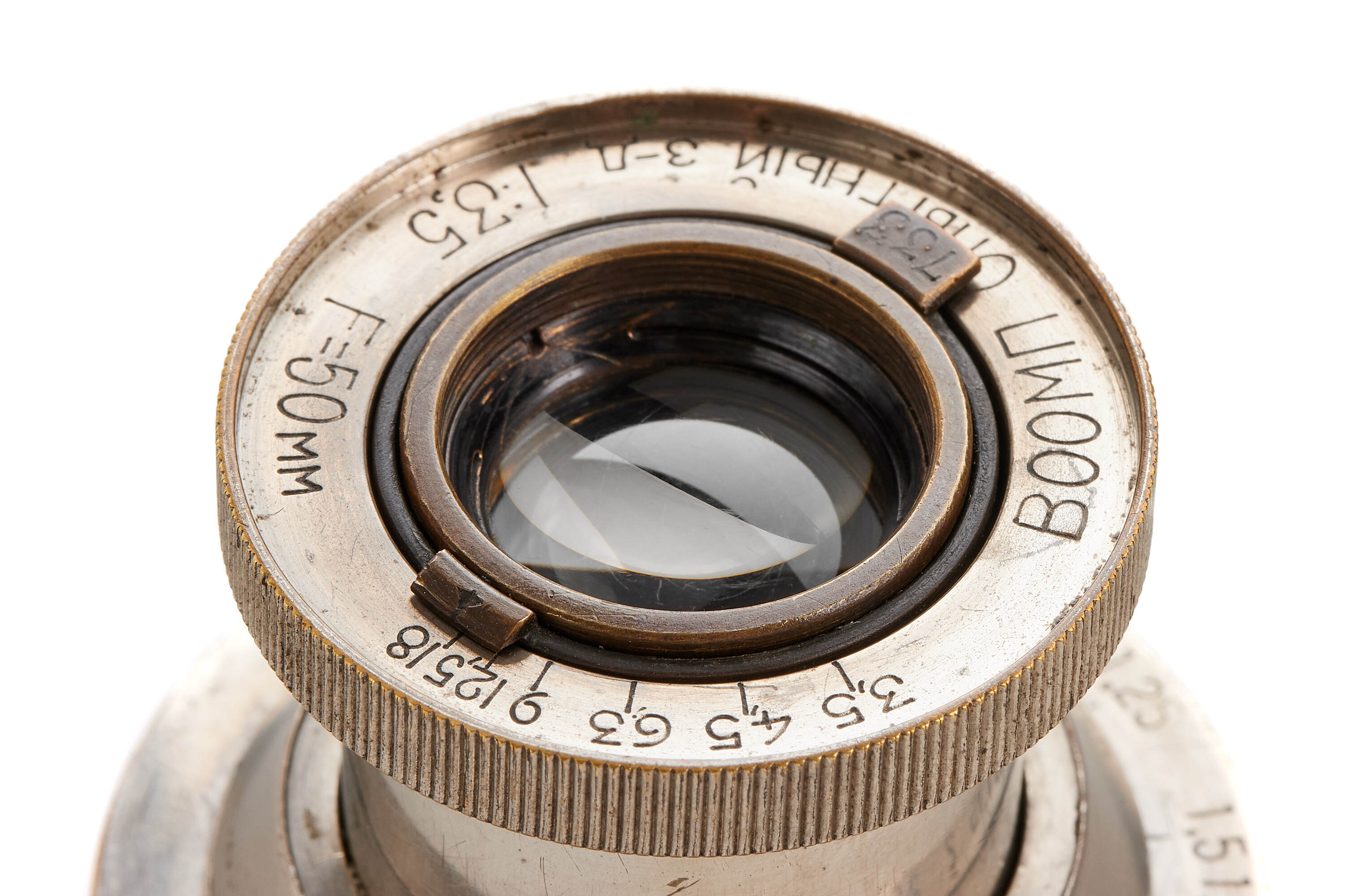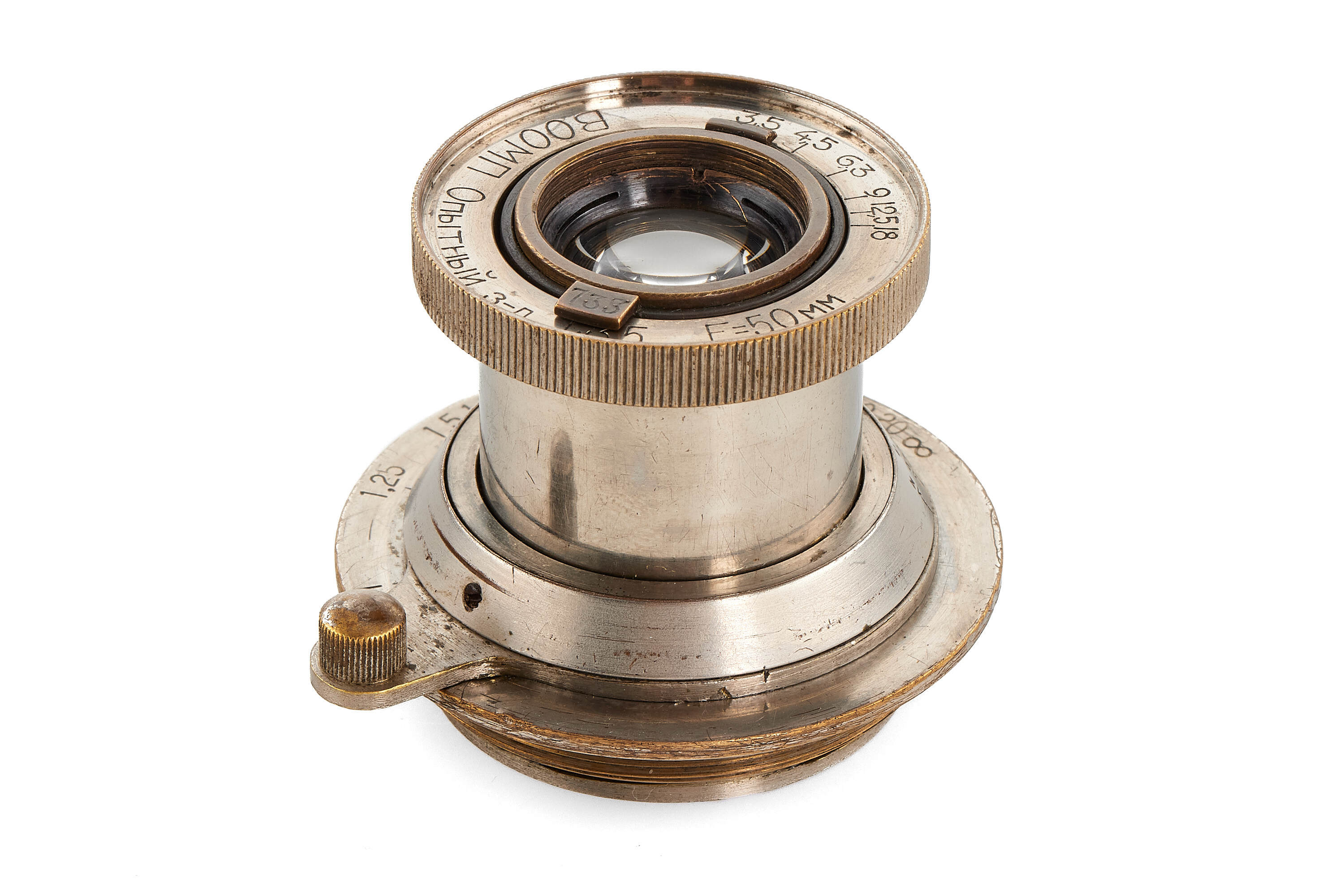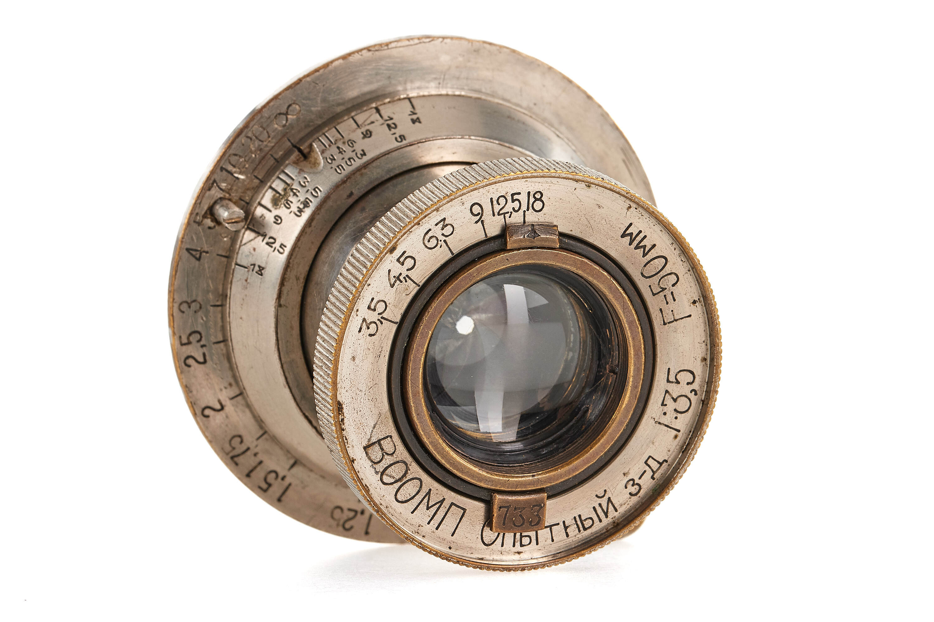 Standard lens for the famous Soviet Leica copy VOOMP, nickel finish, engraved on the aperture tab with the serial number 733, good condition, with nickel lens cap. Very hard to find separately - a perfect opportunity to complete the outfit.