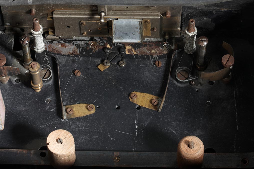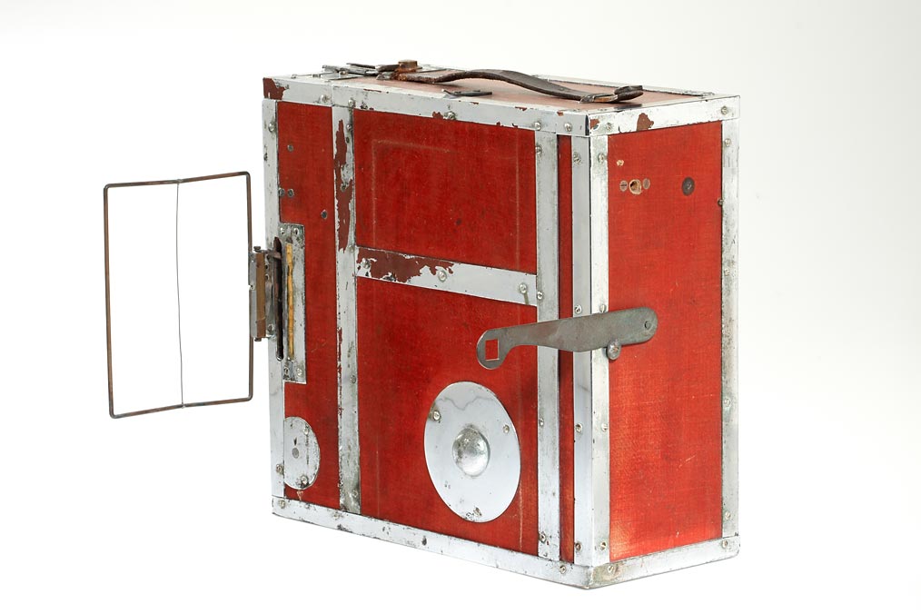 earlier model of the extremely rare Belgian 35mm hand-cranked movie camera, the box-shaped body with metal enforced edges is covered with red fabric, prominent winged makers label is mounted below the metal tube which covers the lens, on the right side a large portrait-orientated frame finder, all mechanical parts are clearly adapted from another professional camera and it evident that this camera is from a small handcrafted series. Very little is known about the Van Rees Brothers, their company or their cameras. Only two different models are documented, which are both offered in this auction.