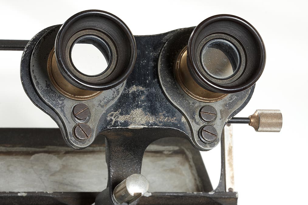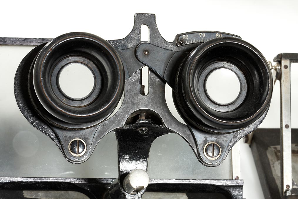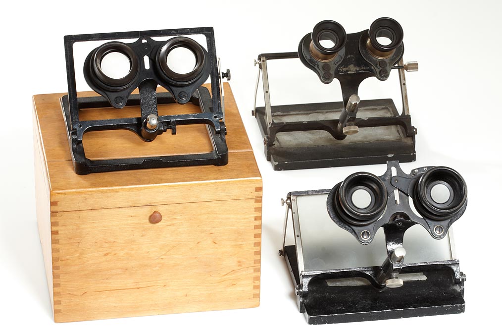 interesting compilation of three table model open stereoscopes built for scientific and military purposes, all with adjustable focus and eye base, functional all-metal construction for cards and slides, (1) early version of the Carl Zeiss Jena 'Verant' viewer with tubular oculars and a solid cast aluminium base, in used condition, (2) later version of the same model in good condition, neither Zeiss viewer has its ground glass, (3) boxed French viewer of a similar construction in original fitted box. (3)