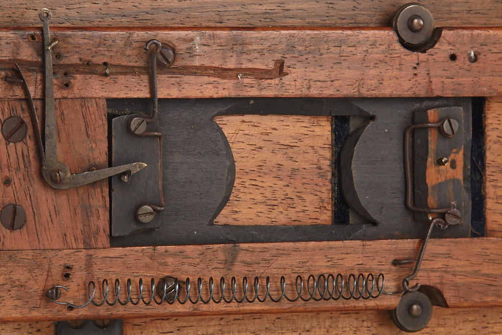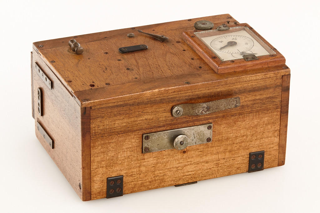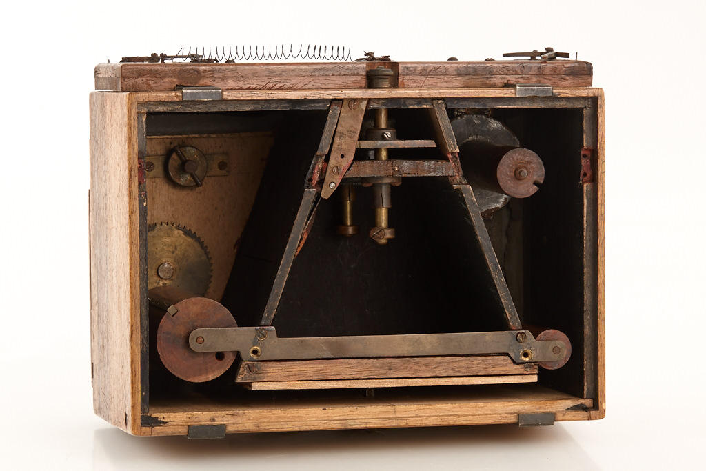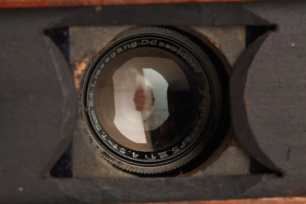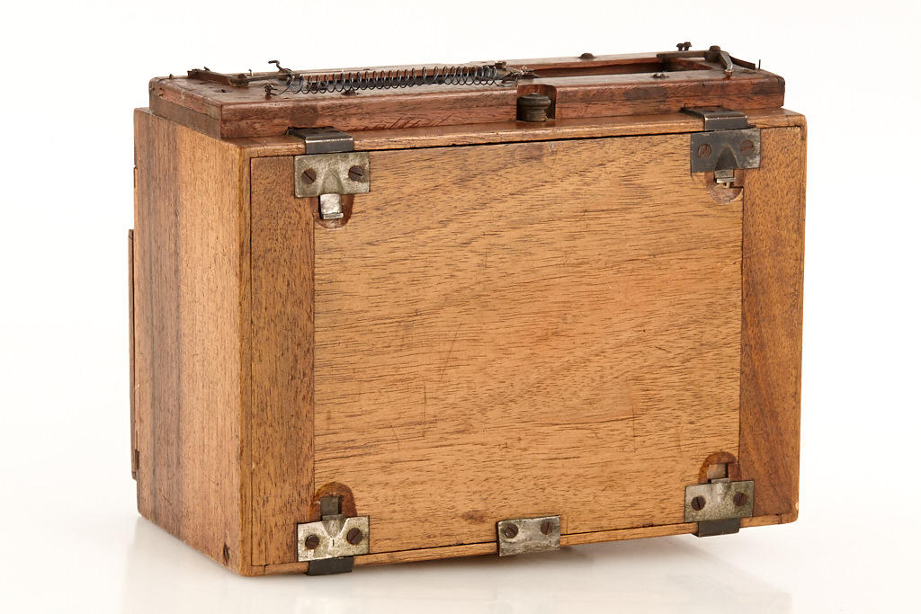 probably unique, early rollfilm camera without name or type markings, probably of Austrian origin, metal guillotine shutter with rounded edges which is tensioned with an external spring, Liesegang Peplostar S.III 4.5/7.5cm lens, adjustable film pressure plate, for 6.5x9cm exposures, footage counter for 60 exposures, size: 9x12.5x18cm