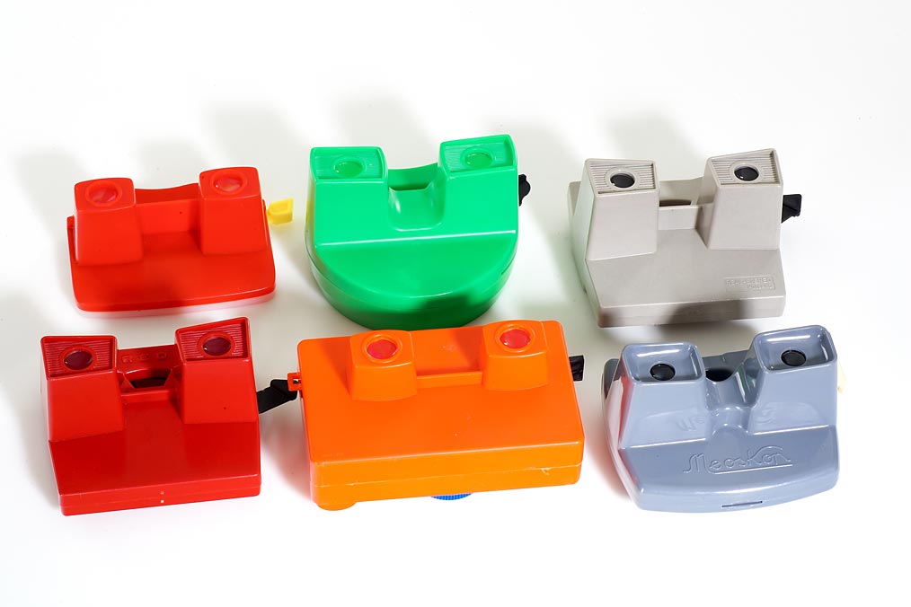interesting lot of six different View Master copies from various makers, all in very good working condition, (1) light grey plastic viewer made by Real-Stereo Holland, (2) a similar viewer labelled ‘Stereobox’ made of red plastic, (3) dark grey Meoskop viewer made by Meopta, (4) an unlabeled circular shaped viewer made of green plastic, (5) red plastic viewer with translucent front, ladled ‘Made in China’, (6) ‘Stereo Camera’ viewer produced in the GDR in orange plastic. (6)