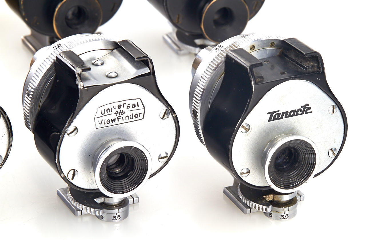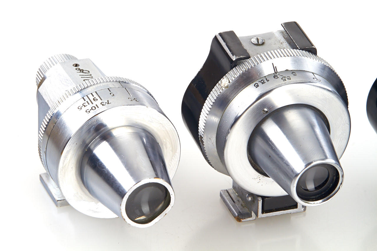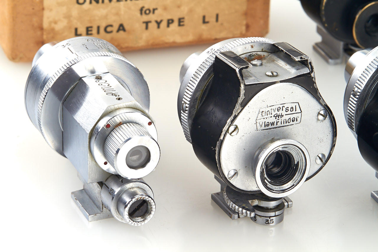 6 Leica VIOOH + VIDOM copies: (1+2 ) Wray London finders nos.274 + 1006, (3) Japanese Tanack viewfinder, (4+5) Japanese Universal Viewfinders, (6) rare all-chrome VIDOM copy Amco (with original maker's box)