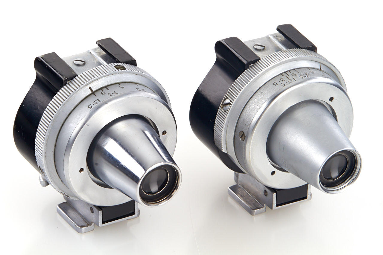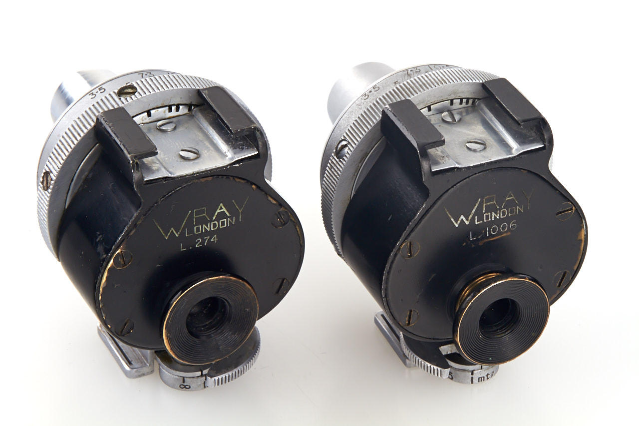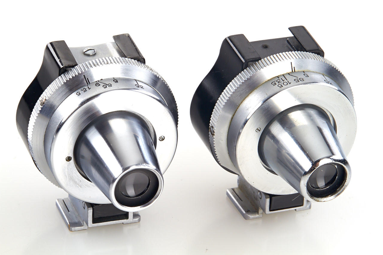 6 Leica VIOOH + VIDOM copies: (1+2 ) Wray London finders nos.274 + 1006, (3) Japanese Tanack viewfinder, (4+5) Japanese Universal Viewfinders, (6) rare all-chrome VIDOM copy Amco (with original maker's box)