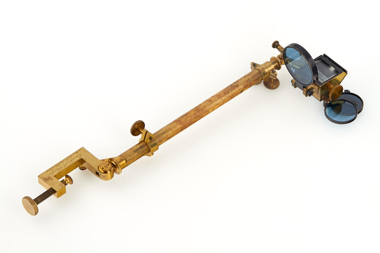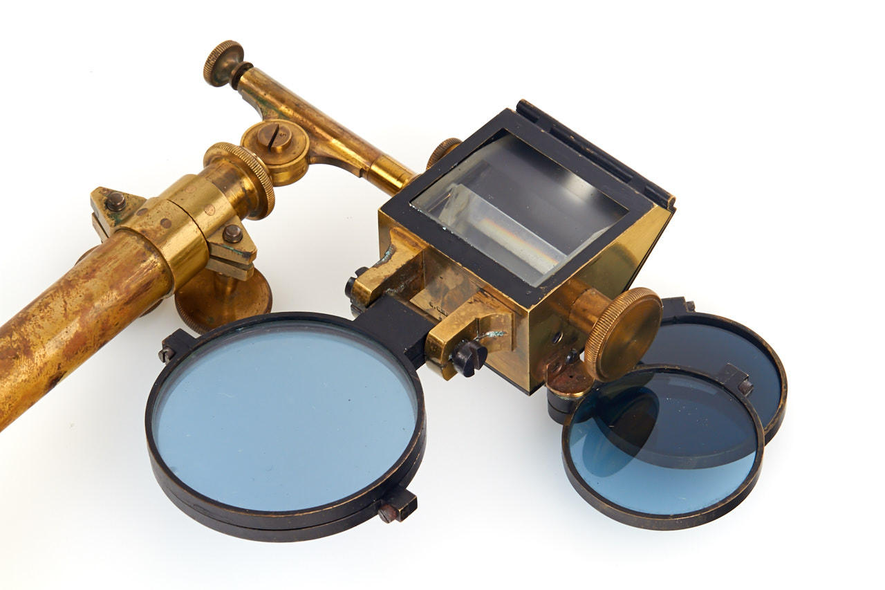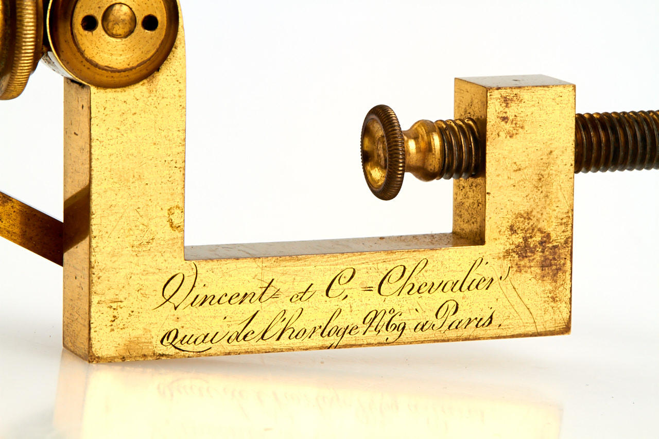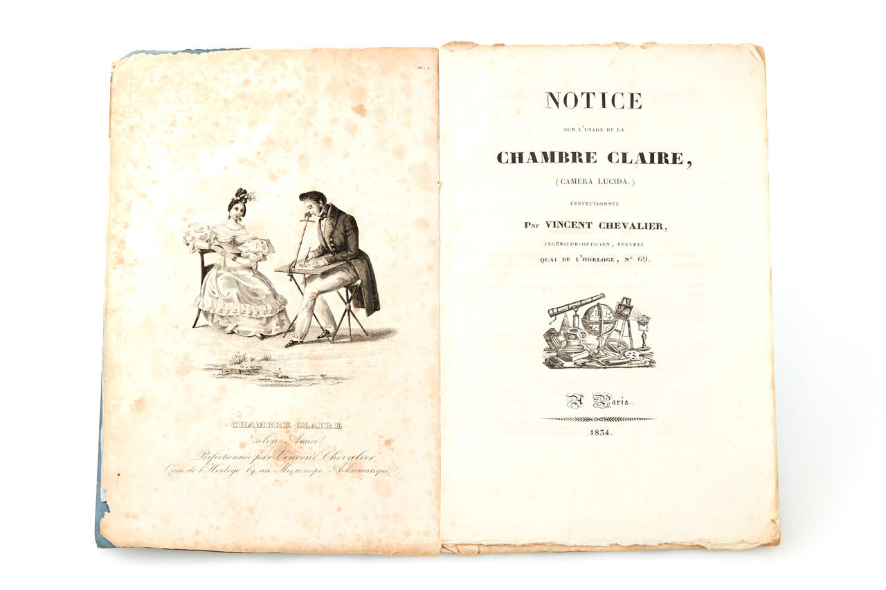 extremely early and historically important Camera Lucida, one of the earliest known and one of the earliest optical instruments made by Vincent and (his son) Charles Chevalier, varnished brass body in very good original condition, no missing parts, with extremely rare original French instruction booklet from 1834 (14x22cm, in good condition, with no missing pages), original fitted mahogany box, an important piece of the history of photography