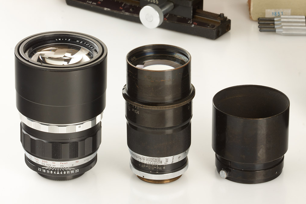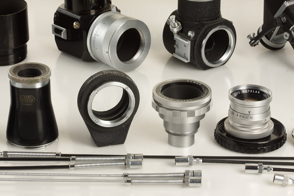 large outfit included 4 lenses and a lot of accessories: near mint chrome Elmar 3.5/65mm no.2067495 (cap), Elmar 4/90mm E39 lens head no.1829353 (cap, keeper), Telyt 4.5/20cm no.416409 (cond.B, hood), Telyt 4/200mm no.1899520 (clean lenses, caps), 2x bellows I (1x in maker's box), bellows II with UOOND M adapter, PLOOT reflex housing, Leitz New York focusing mount, 2x Visoflex I with PEGOO magnifier, 2x Visoflex II with prism (1x in maker's boxes), 16466 adapter, different cable releases, TZFOO extension tube, 20cm finder SFTOO, 16558Z ring, 16472 extension ring, OUAGO focusing mount, DOOBC adapter, BOOWU repro device in maker's box, BELUN copying device with ring in maker's box, MIKAS 1/3x micro attachment in maker's box - all in good condition