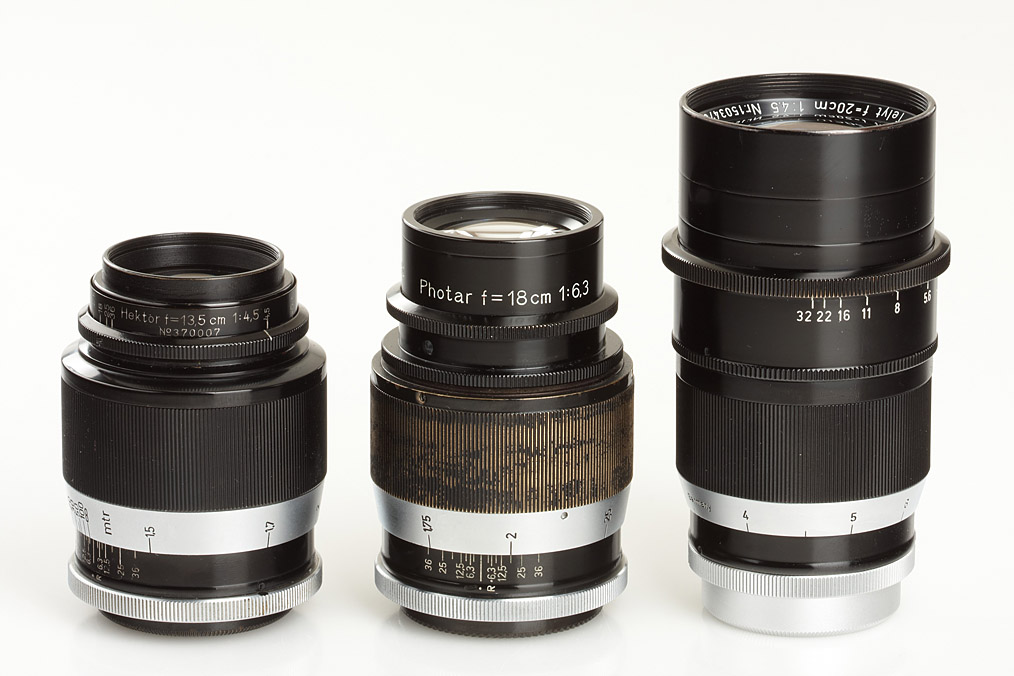 Visoflex I with LVFOO magnifier (maker's box), PEGOO 4x magnifier (maker's box), OHEBO Hektor 4.5/13.5cm no.370007 in short focusing mount (maker's box), Photar 6.3/18cm in short focusing mount ZOOAN, Telyt 4.5/20cm no.1503476 (caps, hood), SFTOO 20cm finder, TZFOO extension ring