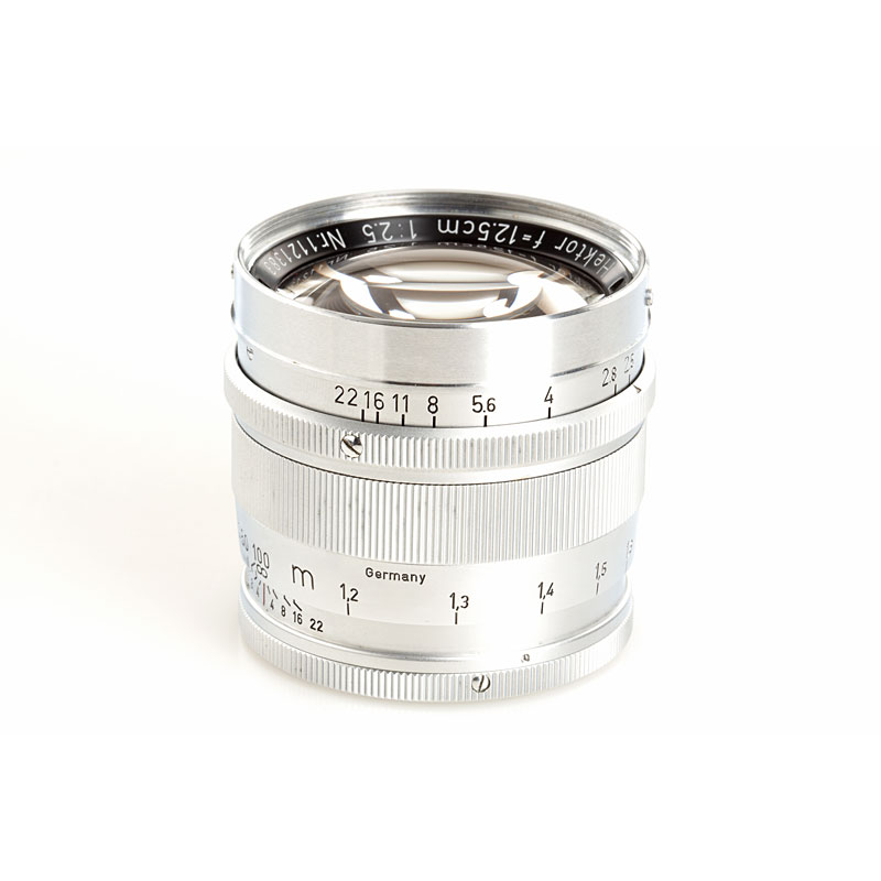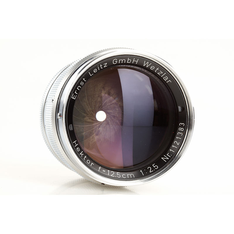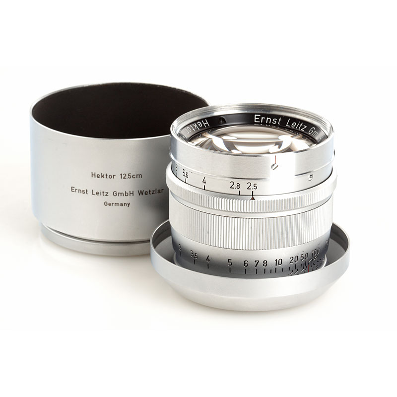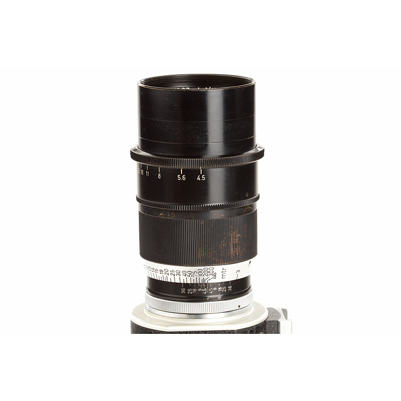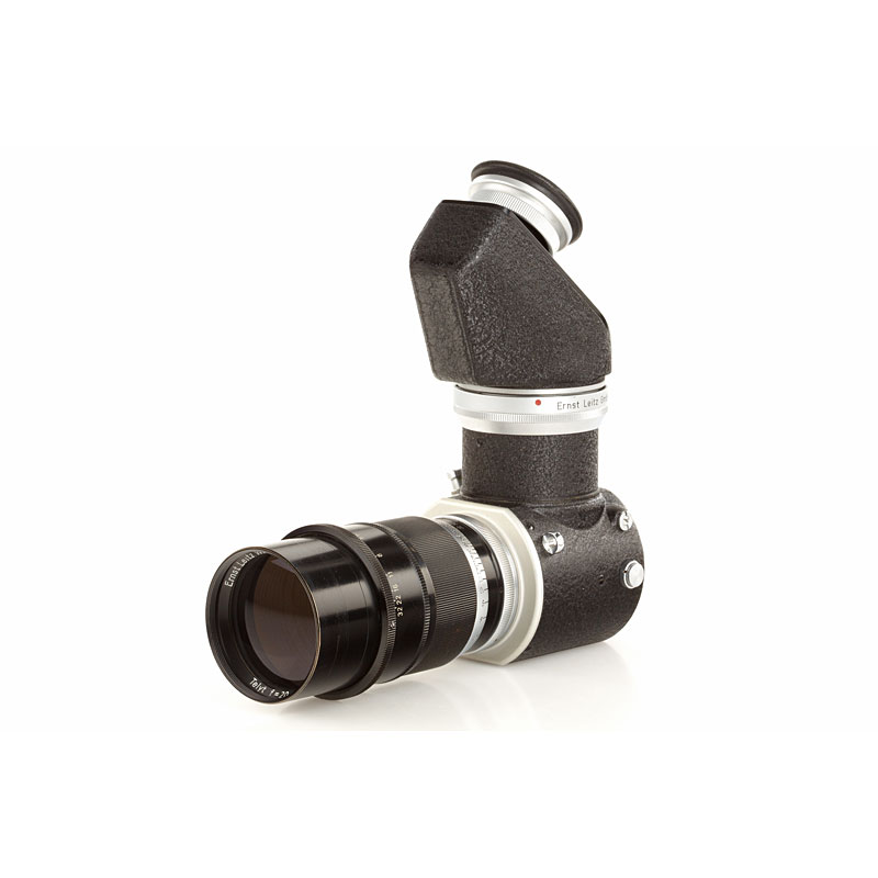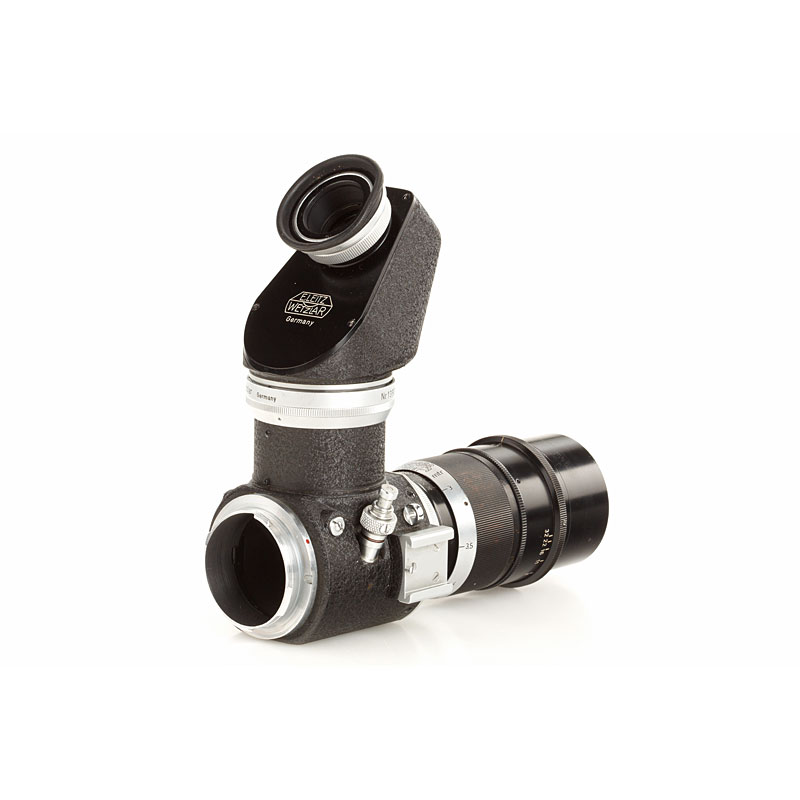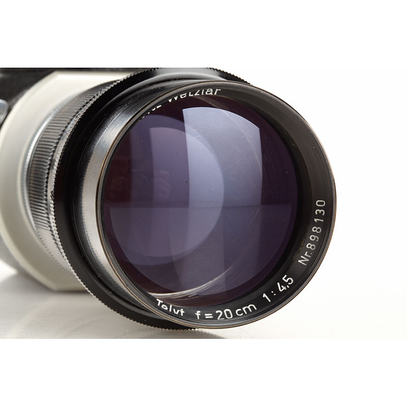 Visoflex I no.13901 for Leica M with 45° PEGOO prism, LVFOO finder, caps, Wetzlar Hektor 2.5/12.5cm no.1121383 (complete with hood and caps), Telyt 4.5/20cm no.898130 (caps, hood) and VEHIG ground glass housing with 5x magnifier LOOCG with maker's box