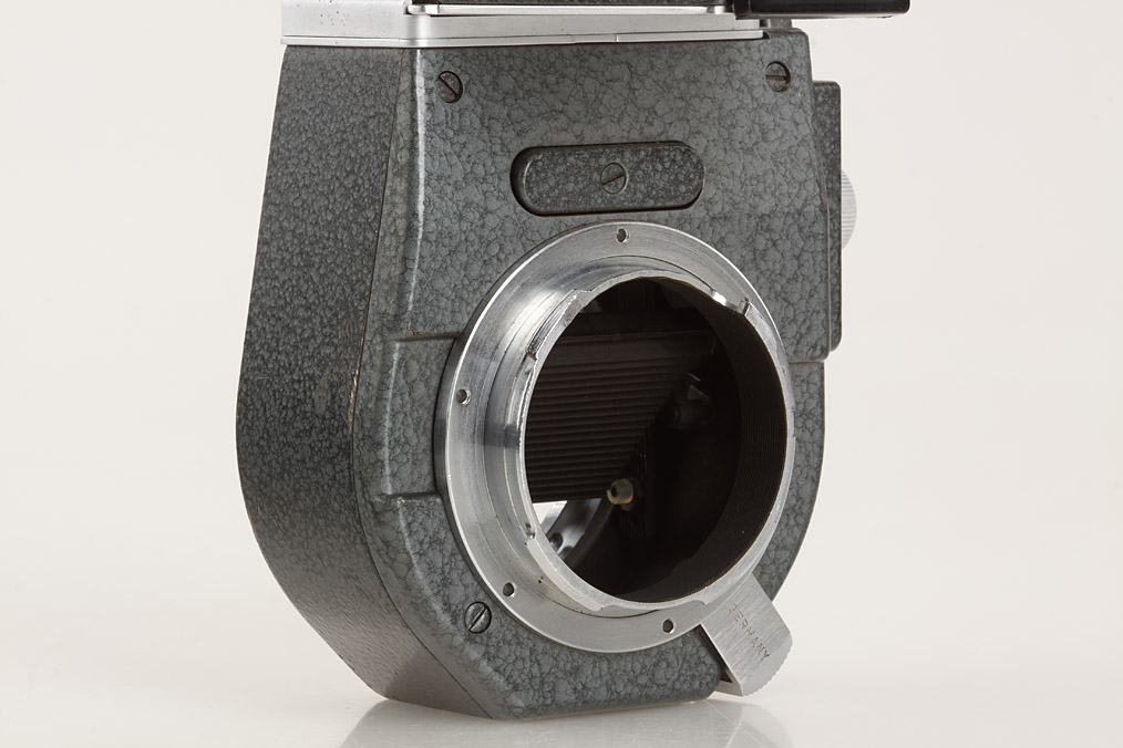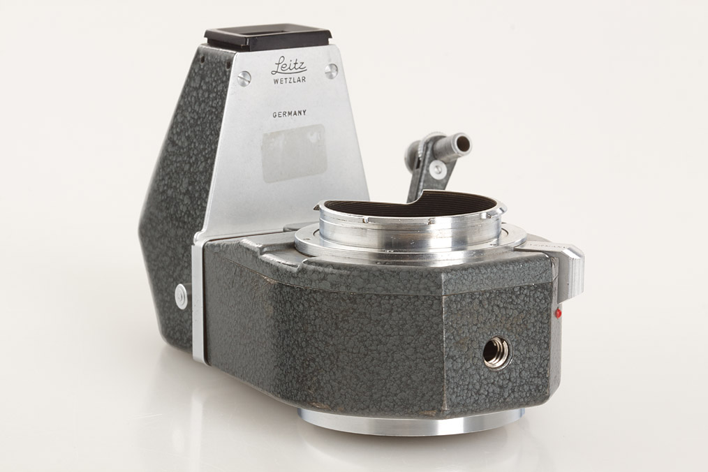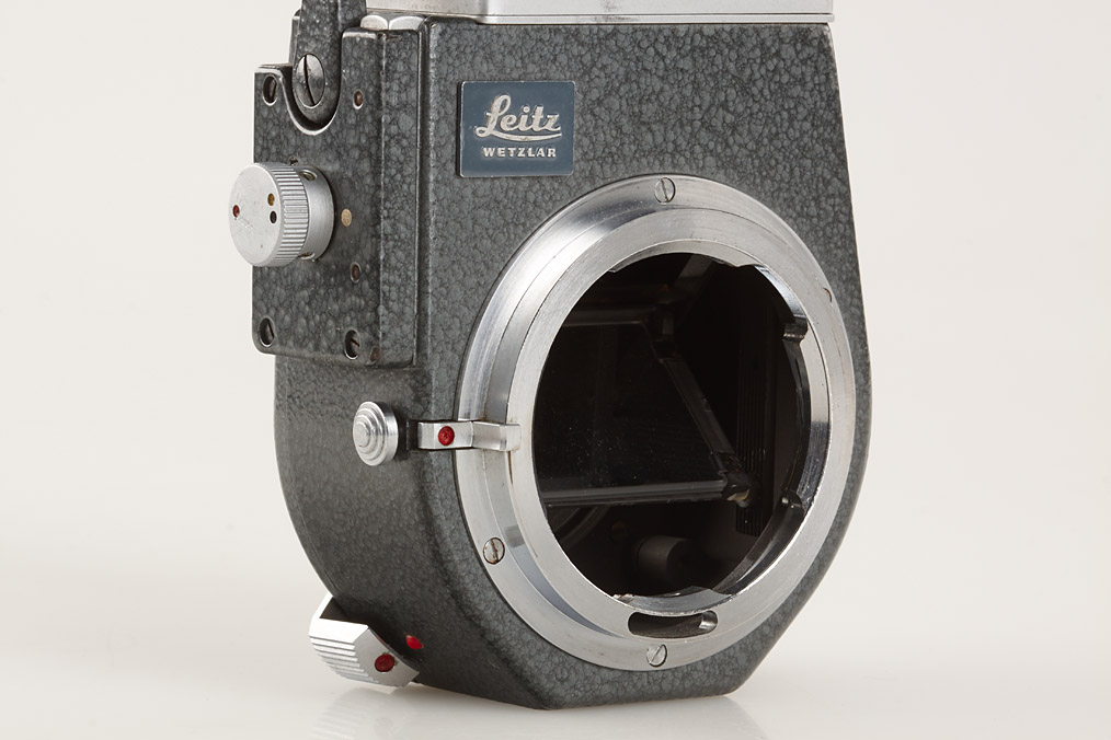 100% original grey hammer tone Visoflex III with matching prism for grey MD, in mint condition, 6 o'clock cut-out on flange (purpose unknown), see 'Lager Vol.I' p.221, Wilhelm Albert 'Geburtstage der Leitz-Foto-Konstruktionen ab 1927' p.220