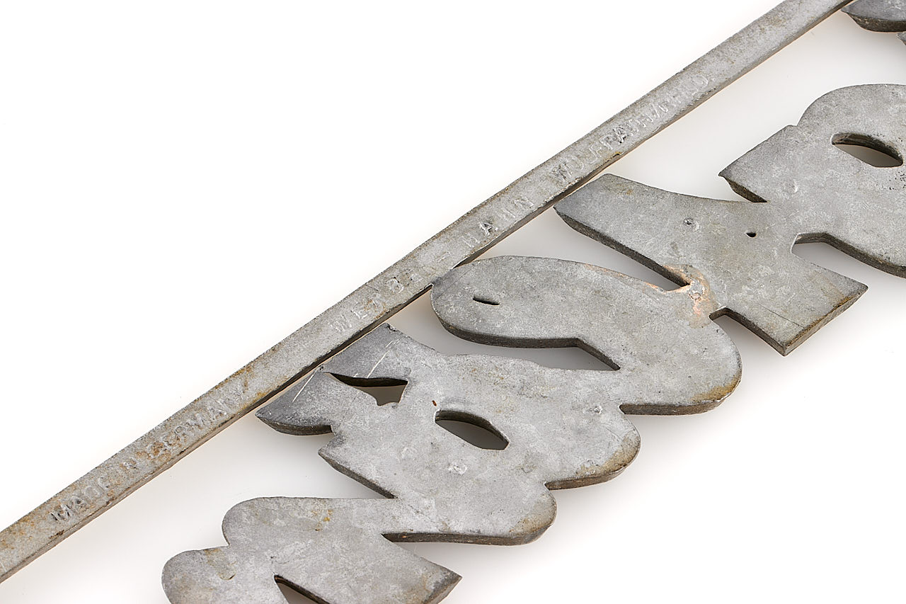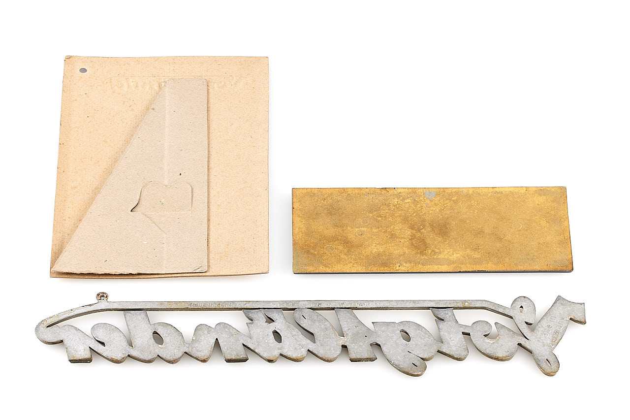 Very nice classic advertising grey metal sign (38x7cm) for Voigtländer, with a gold/blue 'Voigtländer Specialist' metal sign (20x8cm) and a gold/blue cardboard sign (22x15cm), all in original and almost mint condition.