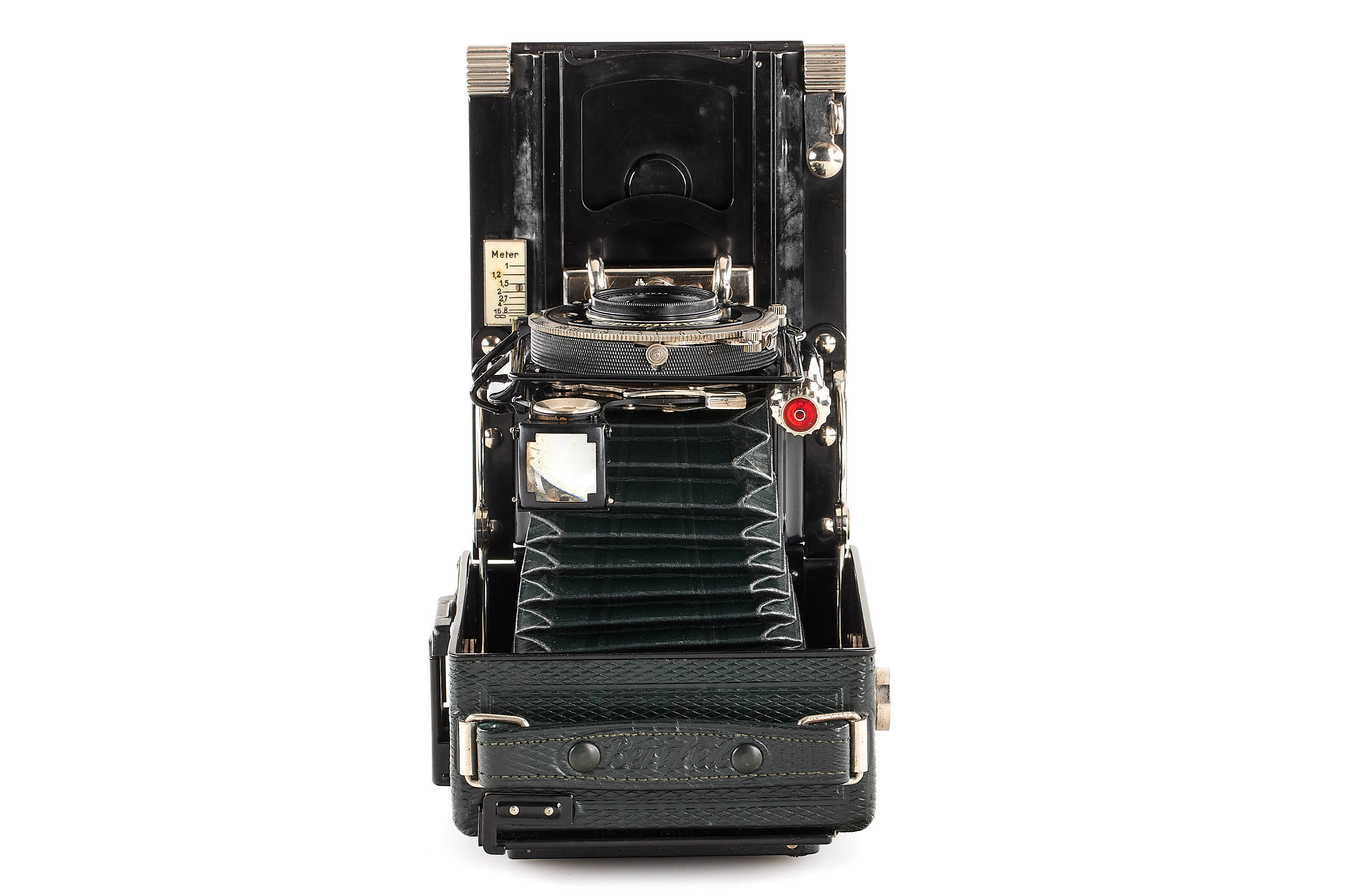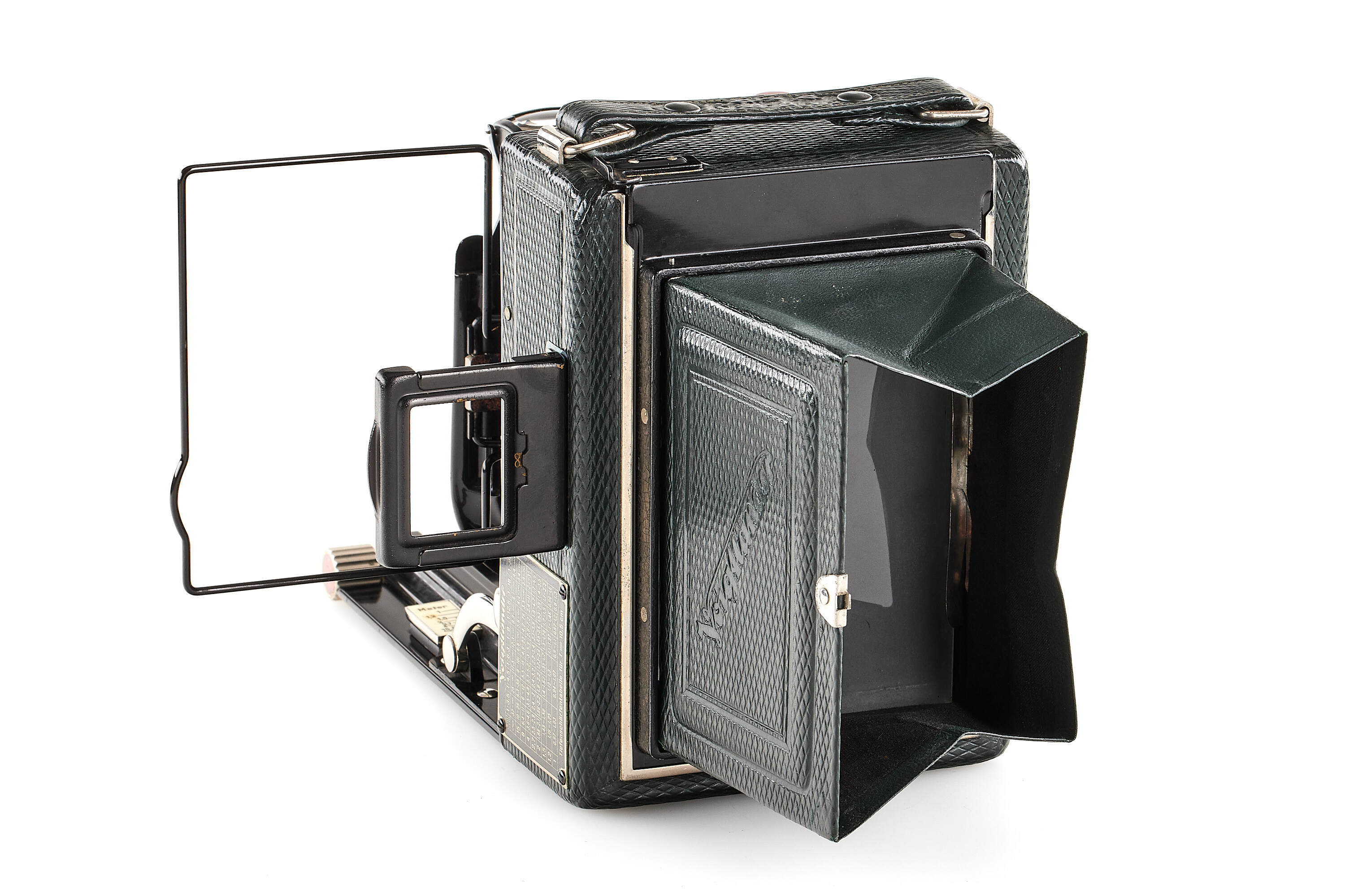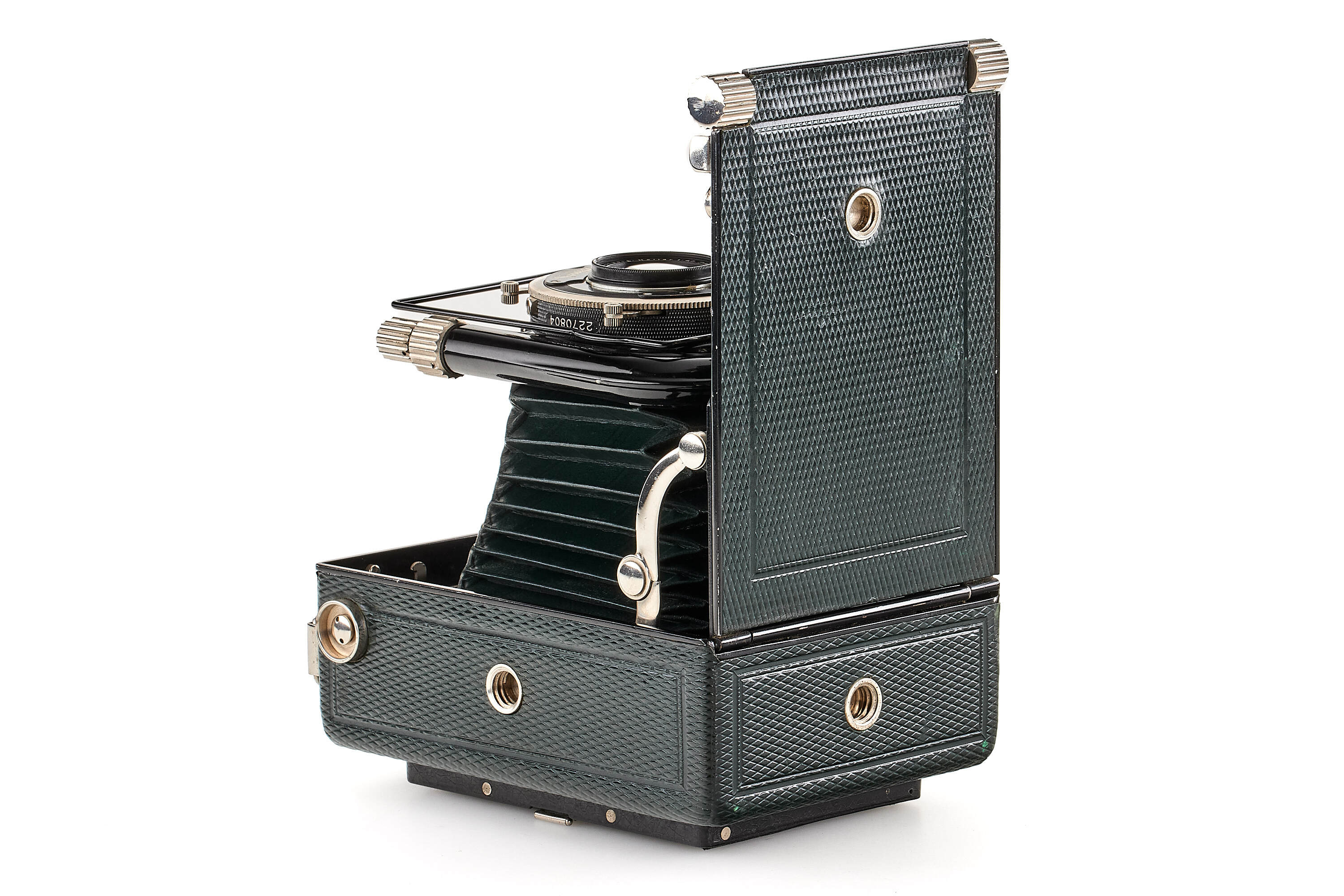 Beautiful 6.5x9cm Bergheil camera with green leather covering, diamond pattern, in very good condition, with Heliar 4.5/10.5cm no.728634 mounted in Compur shutter, with focusing back, 3x film plate holders, exposure table, Focar 3 tele adapter (leather case) and leather case.
