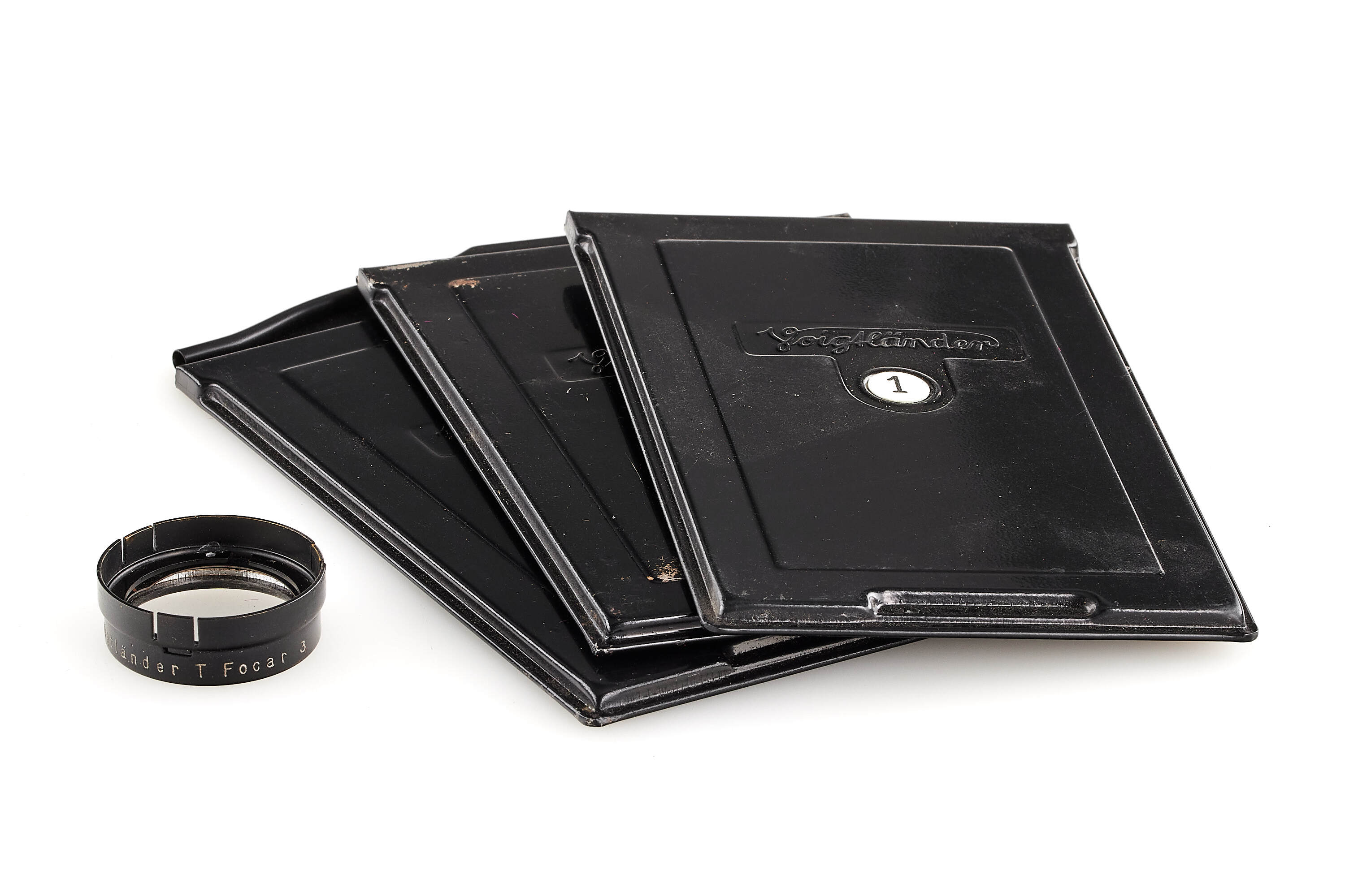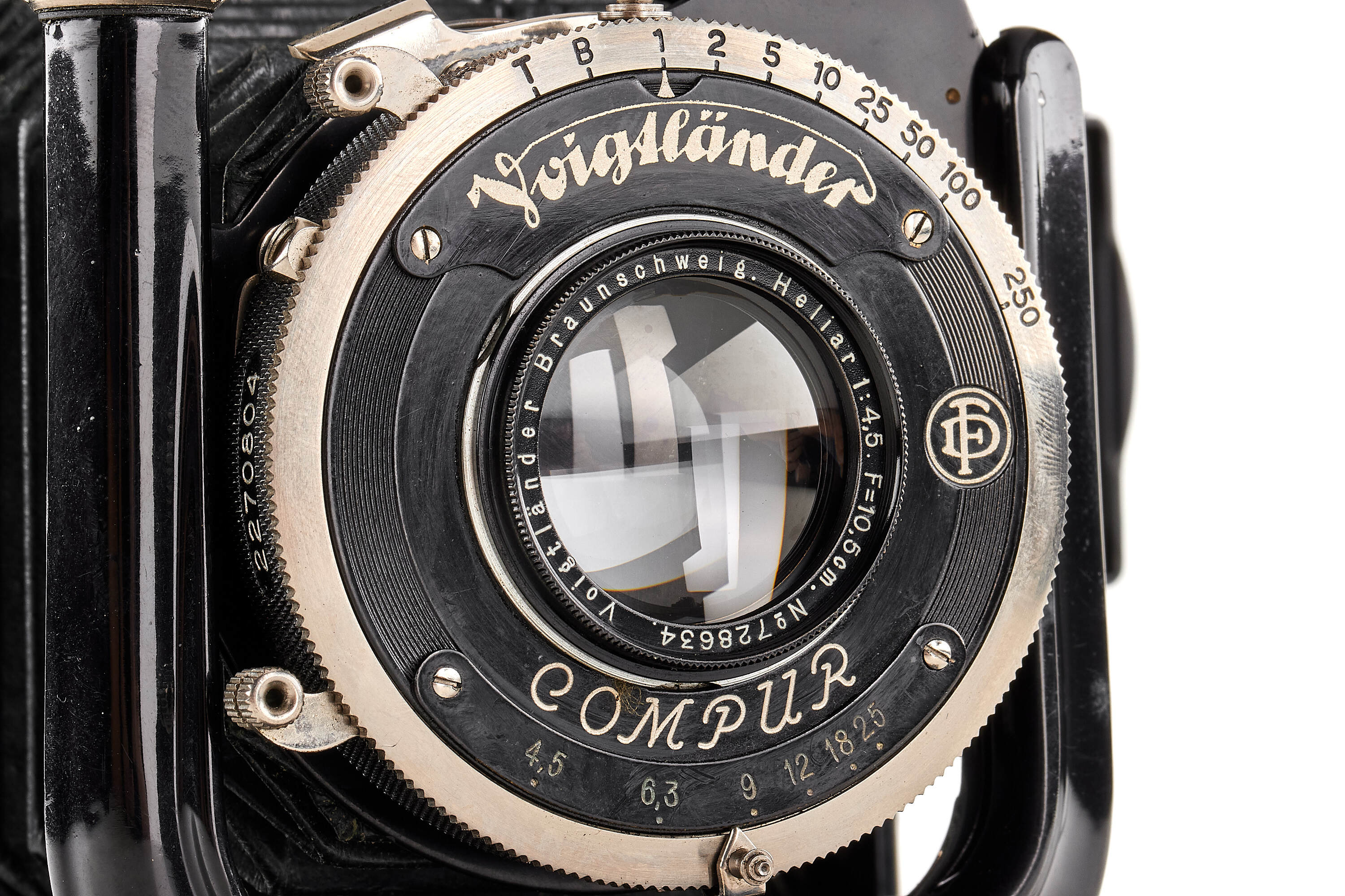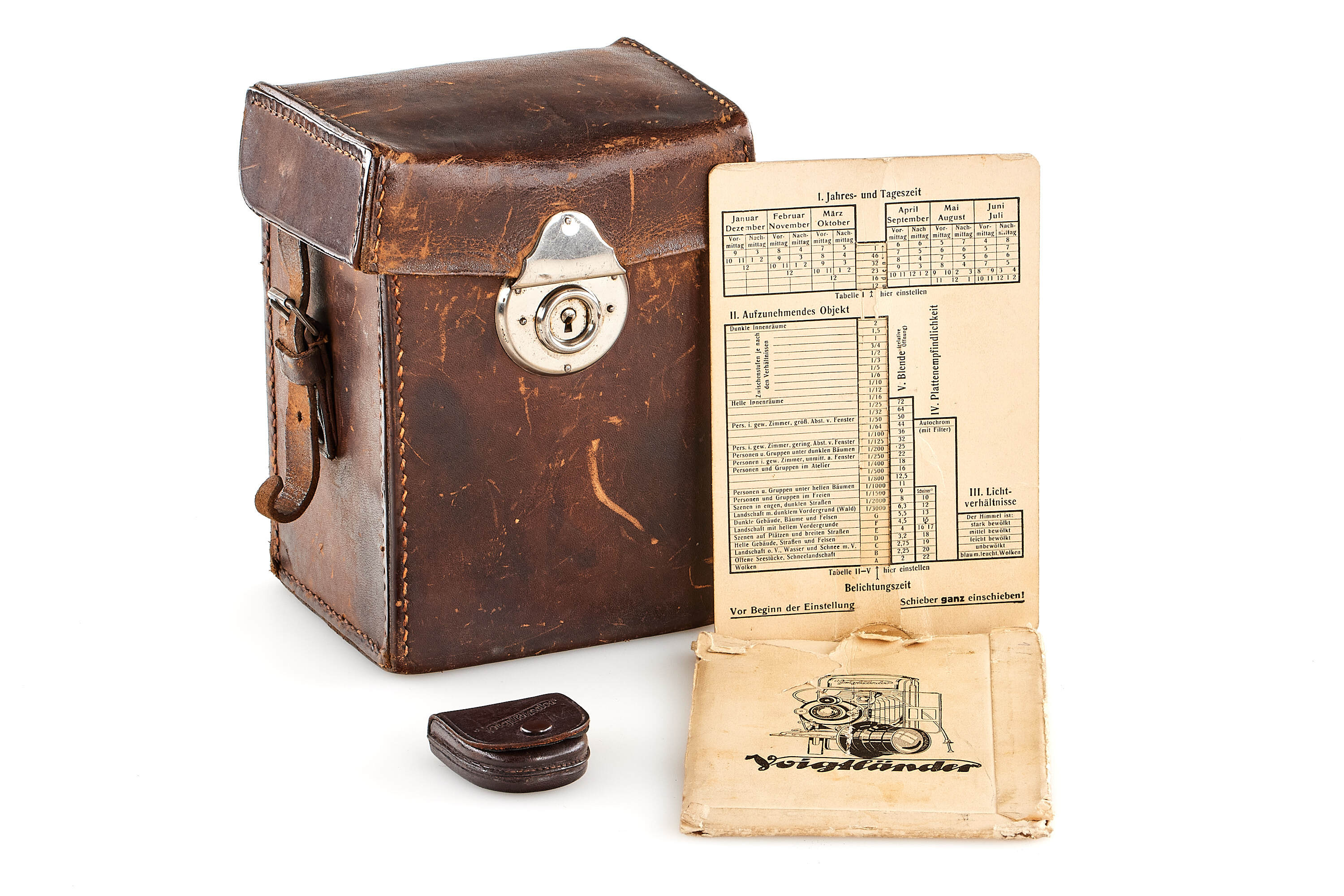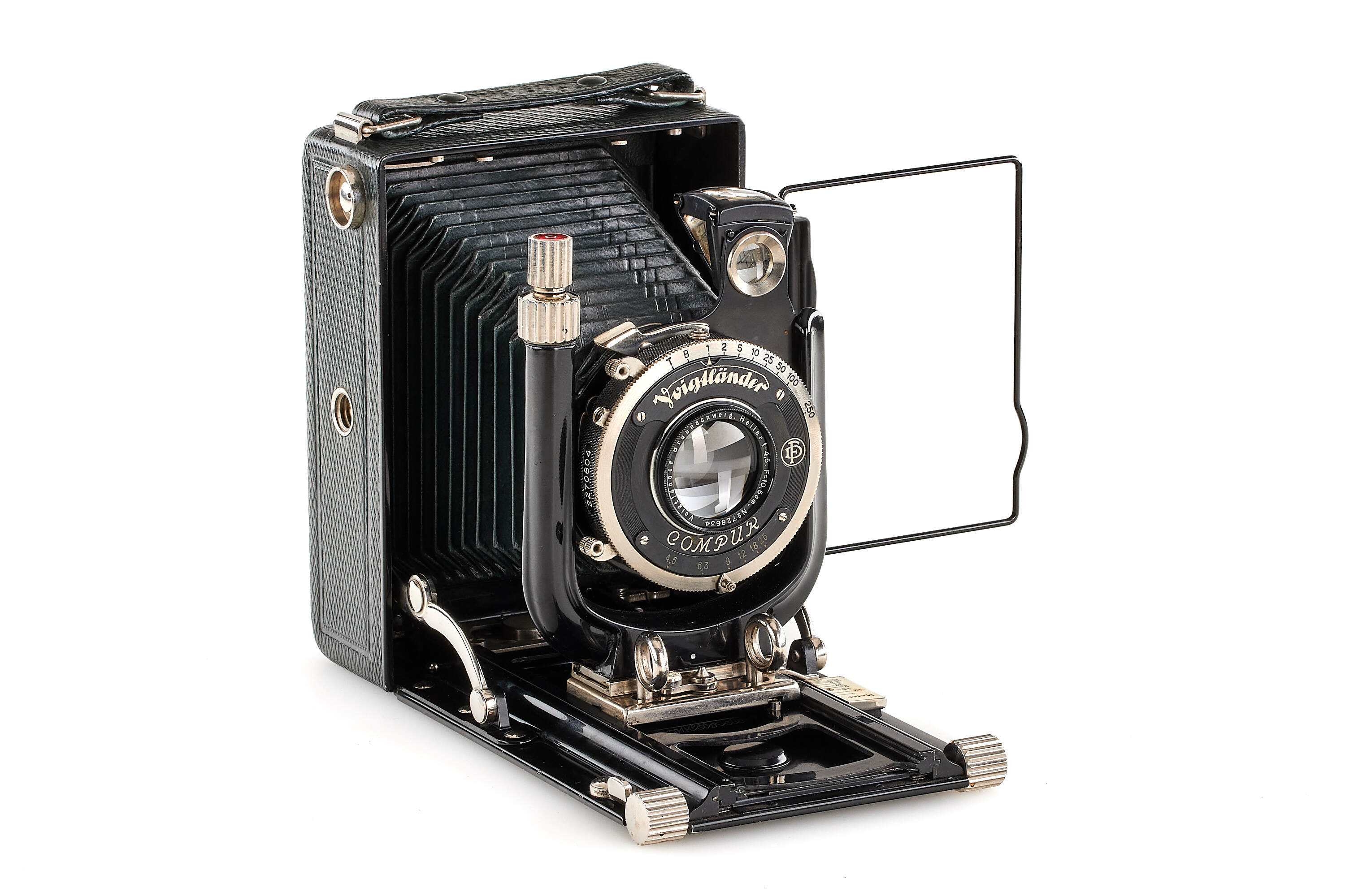 Beautiful 6.5x9cm Bergheil camera with green leather covering, diamond pattern, in very good condition, with Heliar 4.5/10.5cm no.728634 mounted in Compur shutter, with focusing back, 3x film plate holders, exposure table, Focar 3 tele adapter (leather case) and leather case.