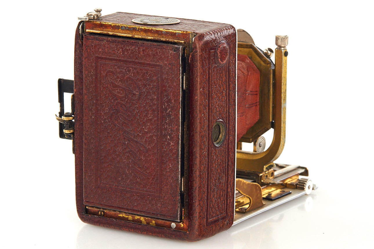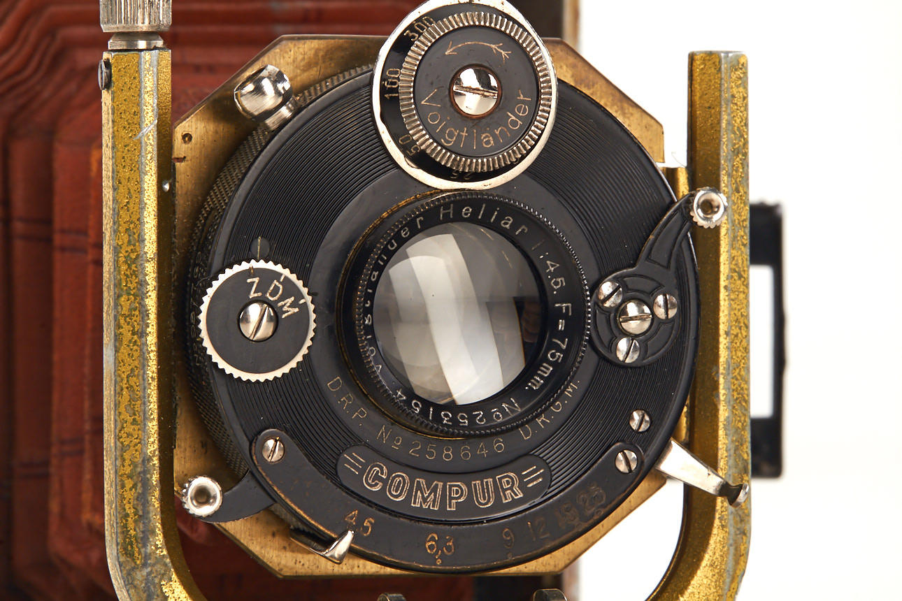 rare 4.5x6cm Bergheil, brown leather covering, brown bellows, gold-plated metal parts, Heliar 4.5/75mm no.253154 in Compur shutter, in fine condition (missing waist-level finder), with original focusing screen