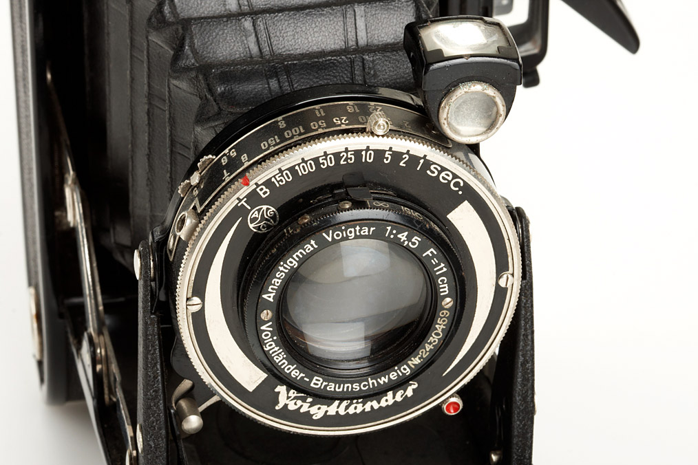 beautiful three dimensional advertising stand for the Voigtländer Bessa, cardboard covered with golden paper, attached lettering and photos, 34cm high, a matching Bessa TLR is included.