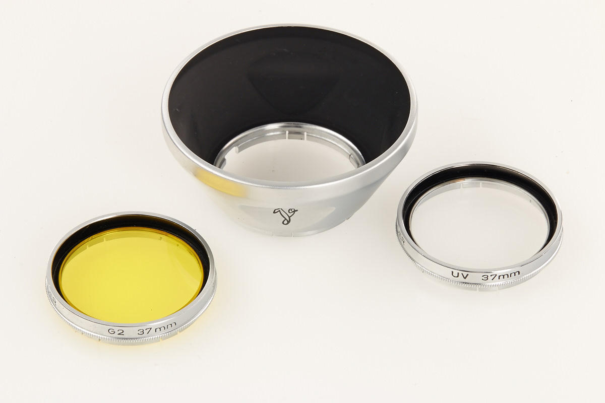 camera in almost mint and perfect working condition with accessory shoe, clean Color-Skopar 3.5/105mm no.3126191 in Compur-Rapid shutter, case, hood and two filters in case, Kontur finder in case