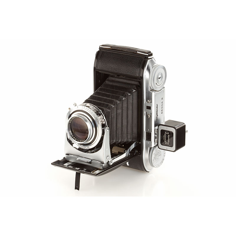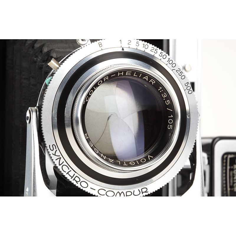 6x9cm, with Color-Heliar 3.5/105mm in Synchro-Compur shutter, in mint condition, original case, maker's box, 4.5x6cm insert mask, 6x9 Kontur finder, black metal lens hood