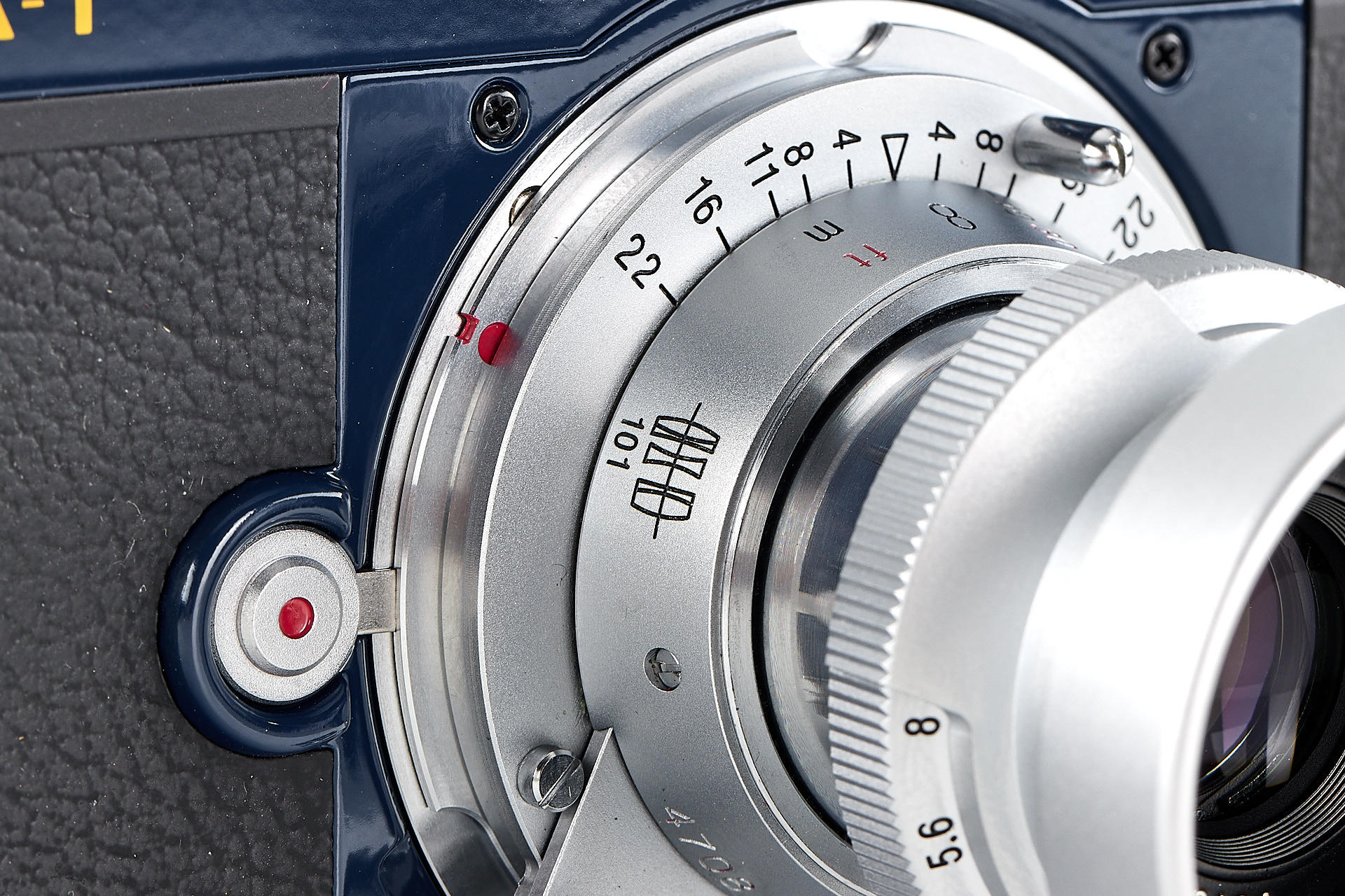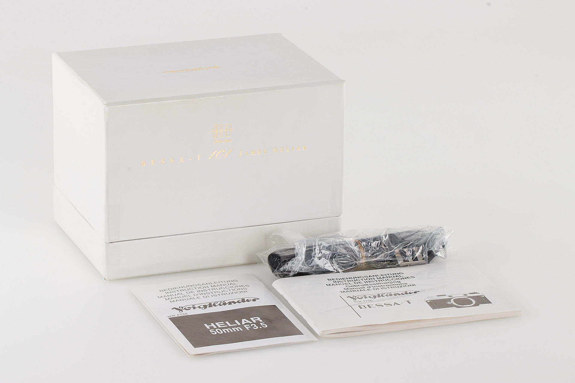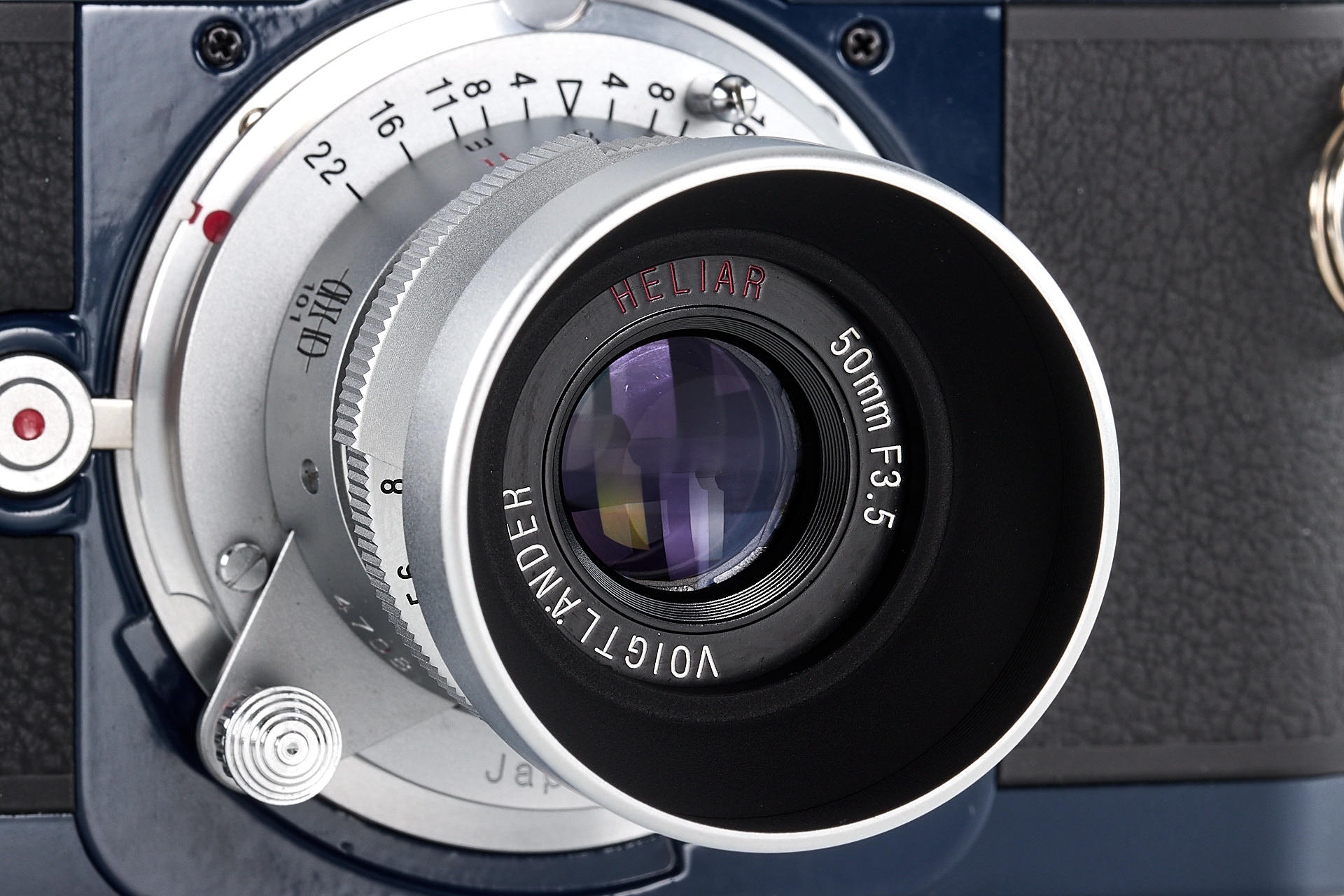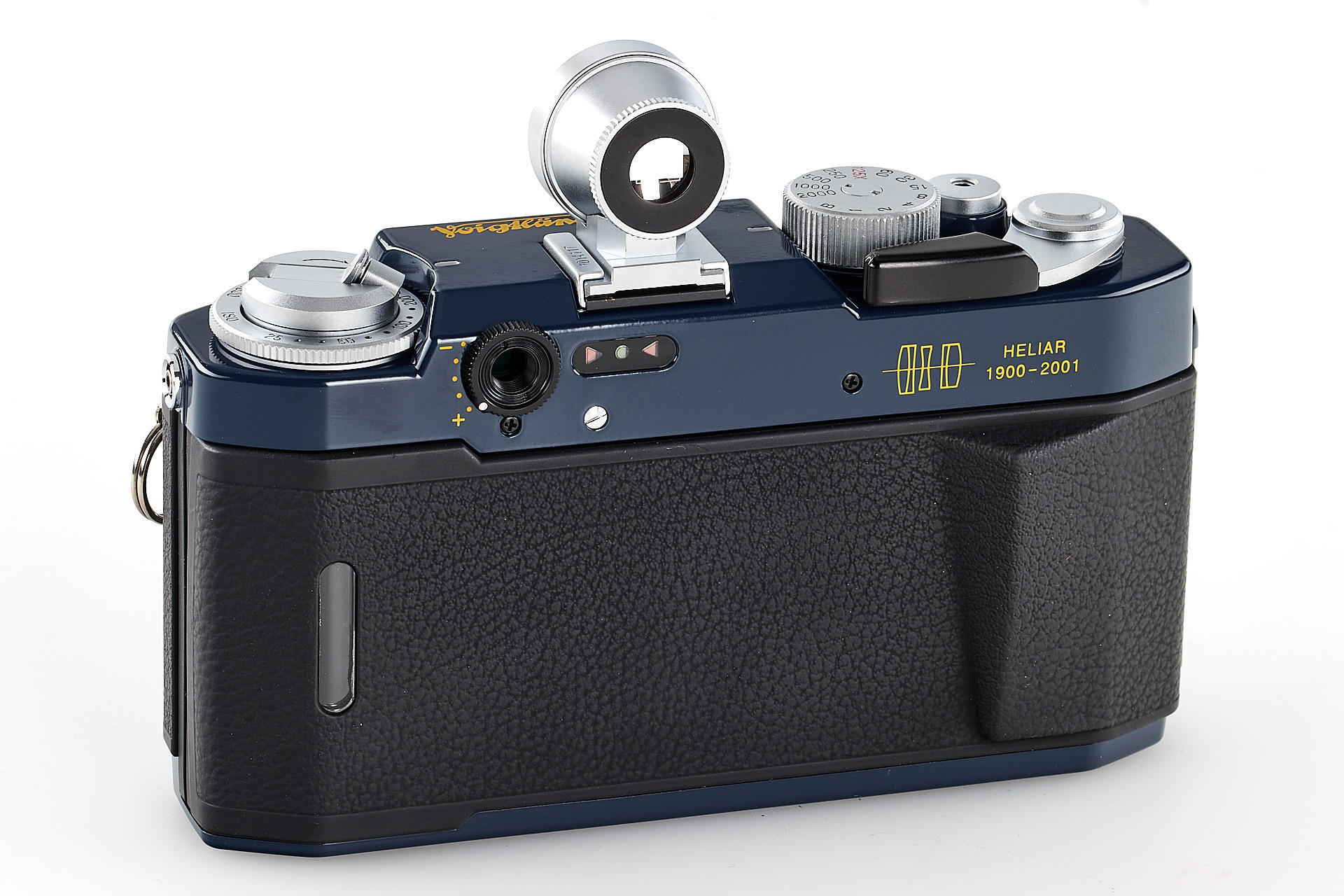 Rare limited edition launched in 2001 to commemorate 101 years of the Heliar lenses, navy blue version in mint condition and working order, with Heliar 3.5/50mm no.4708 with special engraving '101' and logo, 50mm finder, strap, hood, lens cap, M39-M adapter, papers, presentation and maker's boxes