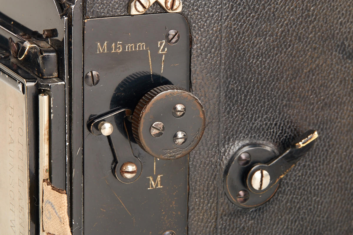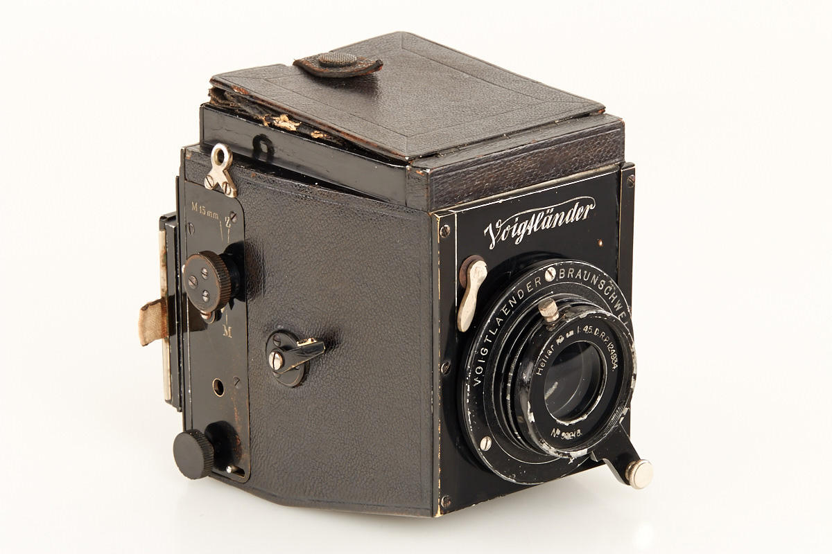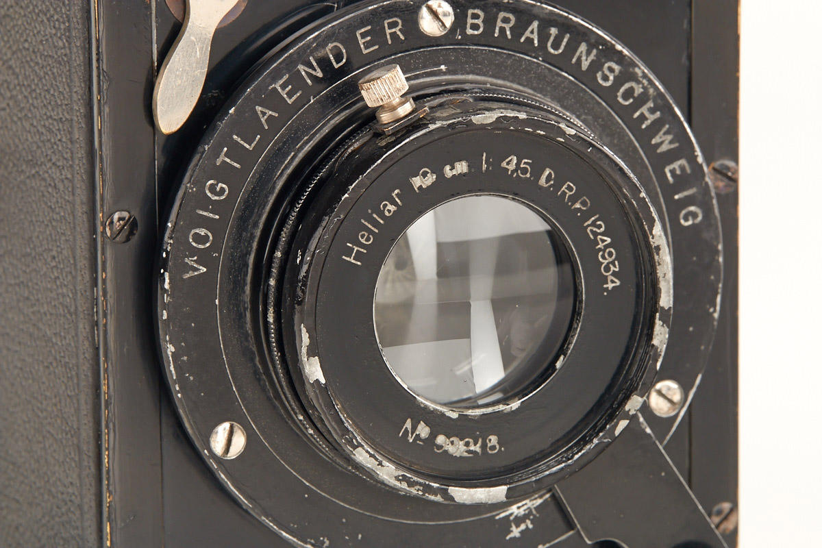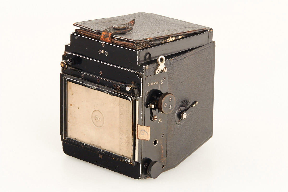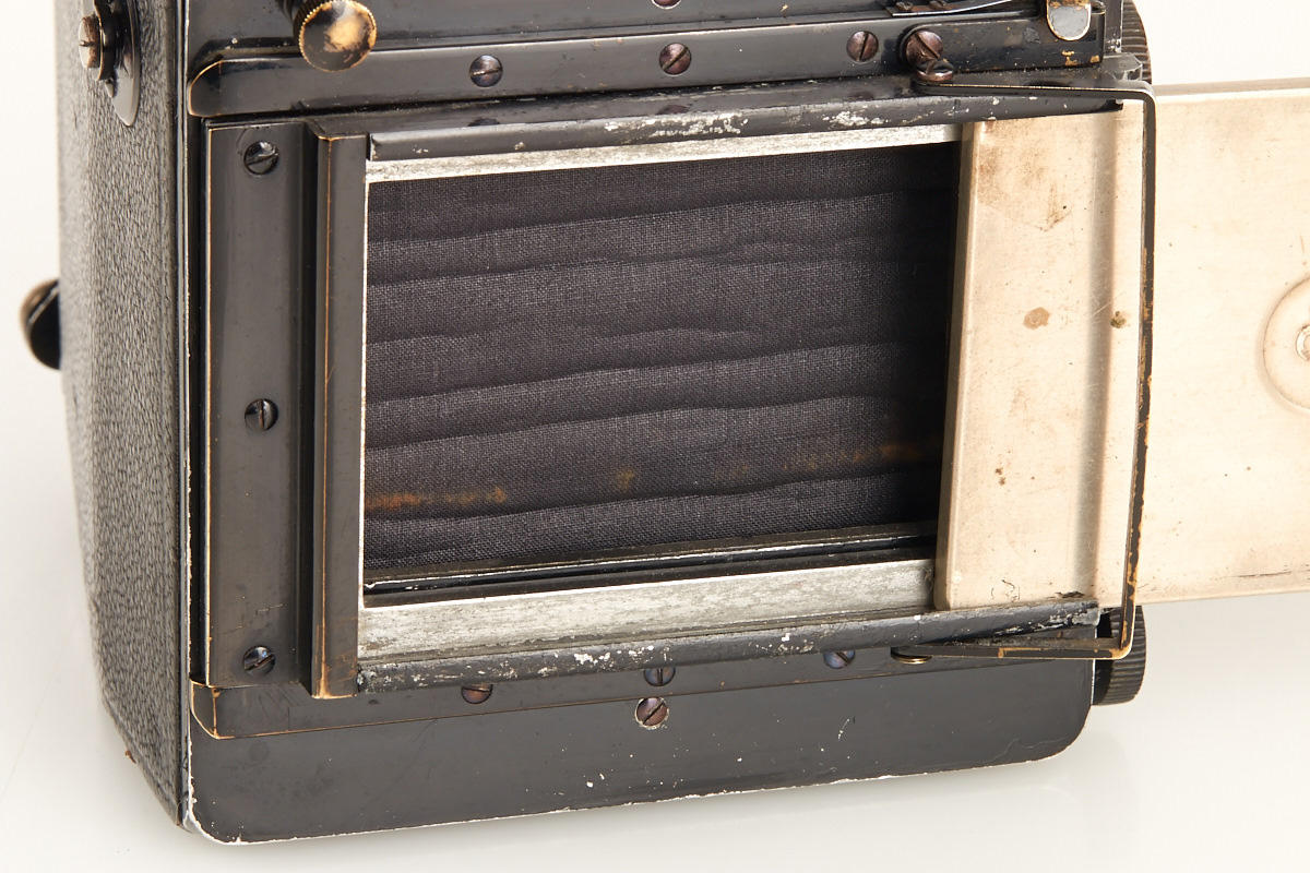 very rare, first miniature SLR for 4.5x6cm plates, one original plate film holder, working focal plane shutter, with original Heliar 4.5/10cm no.99218in helical focusing mount